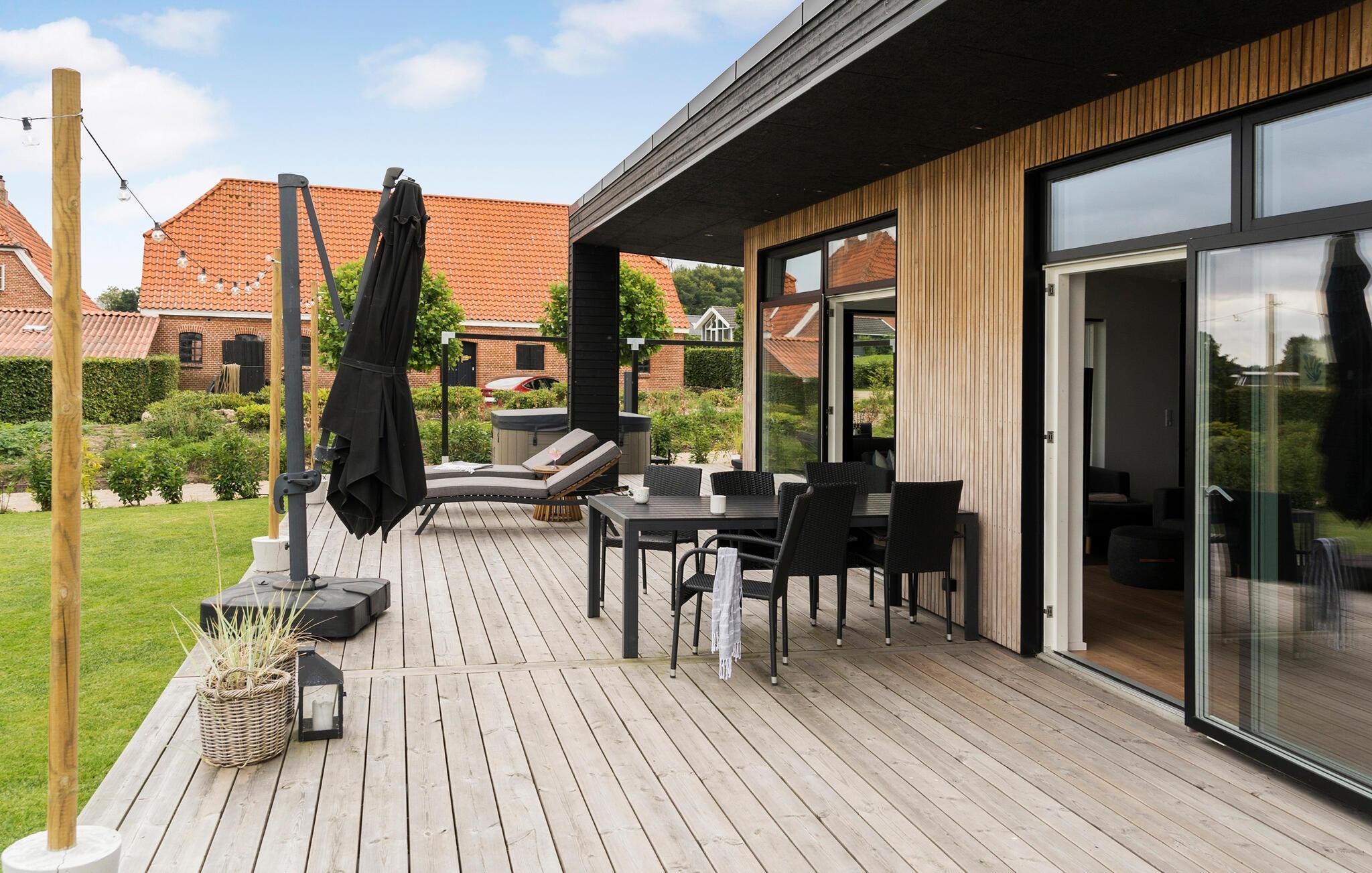 Entspannen Sie auf der geräumigen Holzterrasse, während Sie Ihre Kinder beim Spielen auf dem Grundstück beobachten können. Unterhalten Sie sich auf dem großen Rasen beim Wikingerspiel oder Fußball mit der ganzen Familie.