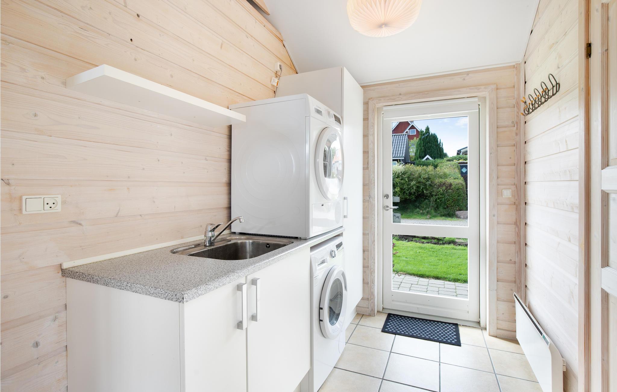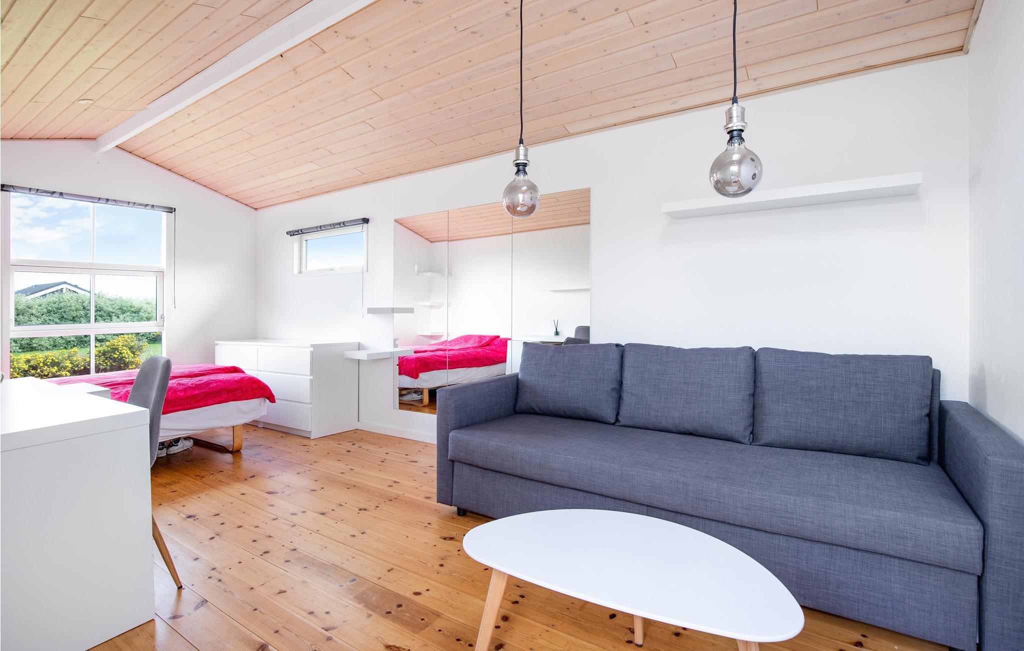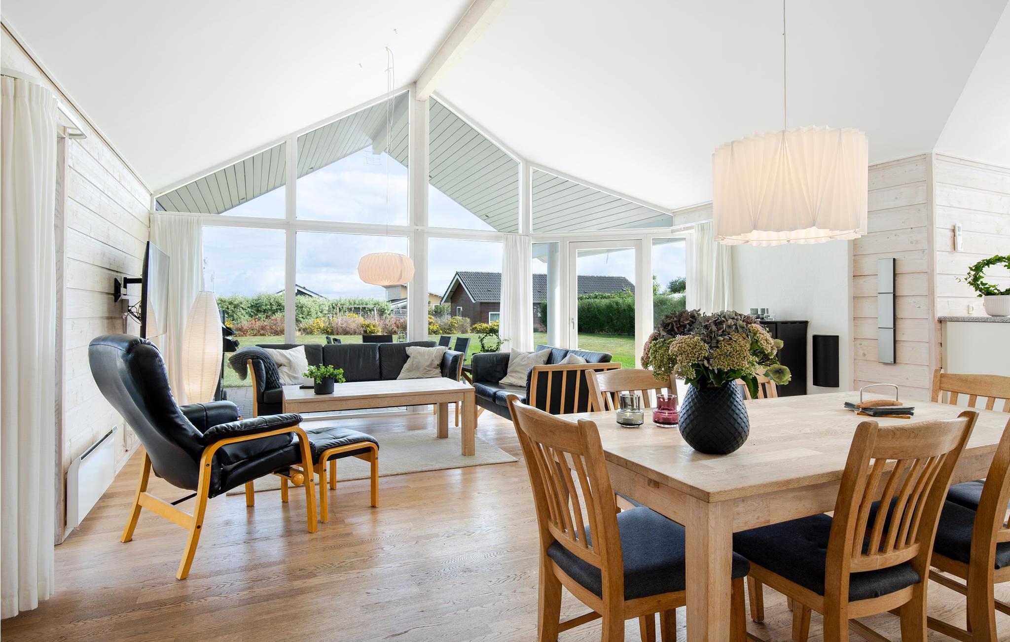 Die Einrichtung des Hauses ist in skandinavischen Stil hell und schlicht und es hat einen offenen Dachfirst. Der Lichteinfall im Wohnraum ist dank der vielen Panoramafenster fabelhaft und die Küche ist von hier nur durch eine Küchenzeile getrennt.