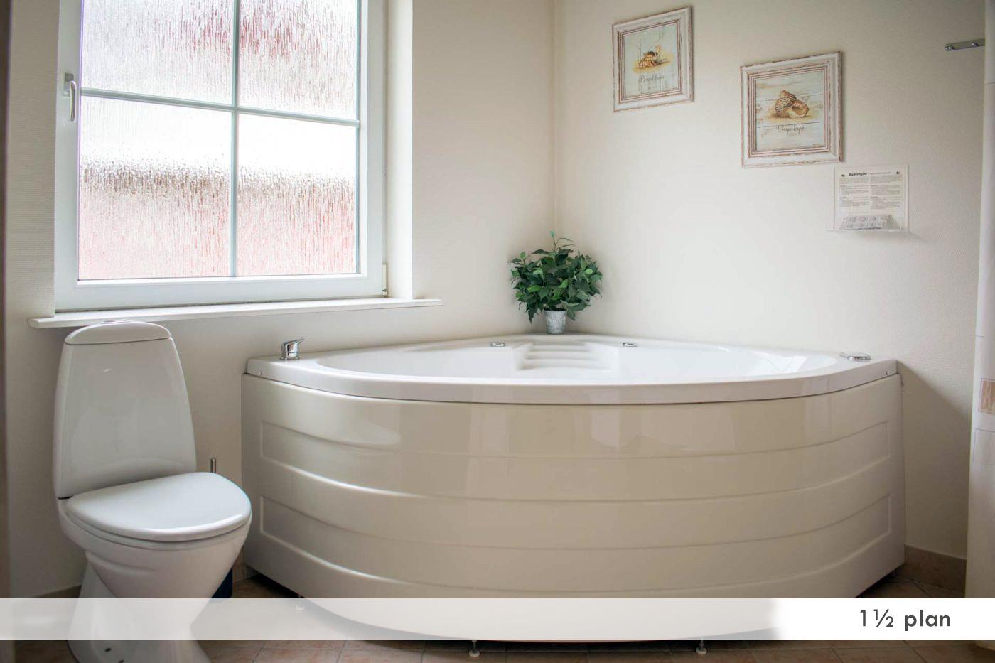 Bathroom with a Jacuzzi, sauna and floor heating. Toilet. Washing machine, tumble dryer, vacuum cleaner.