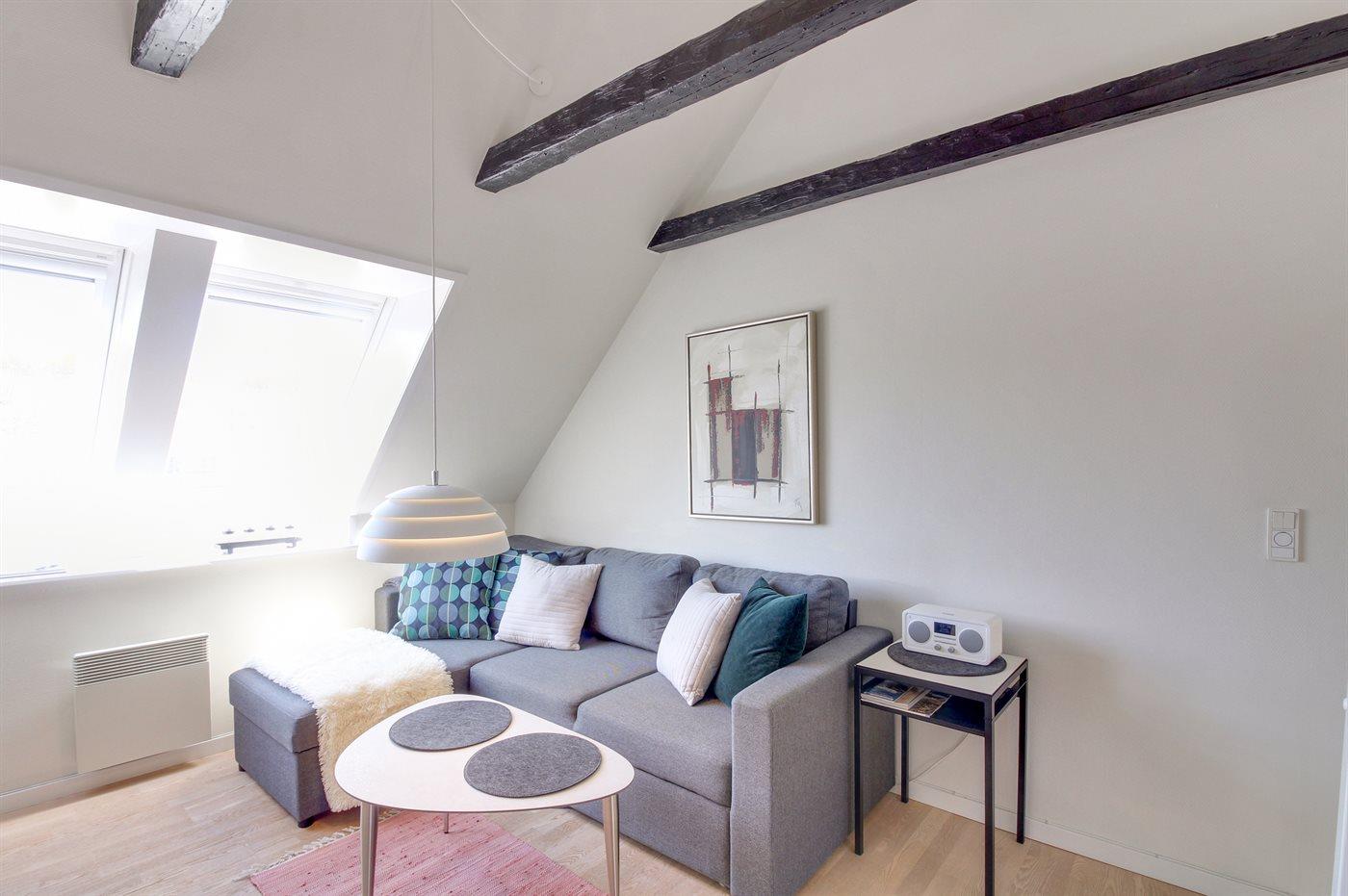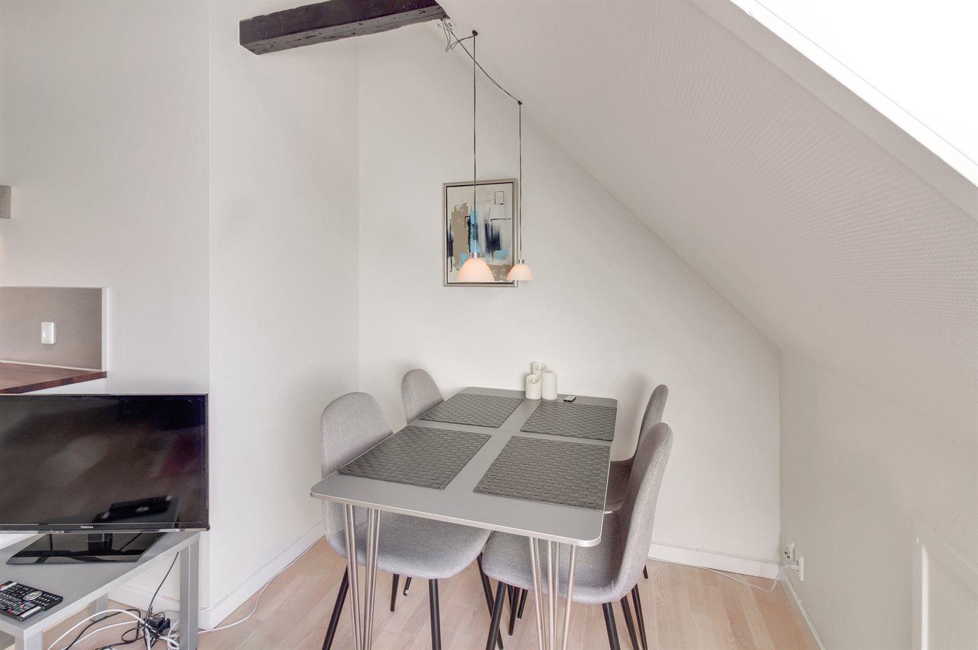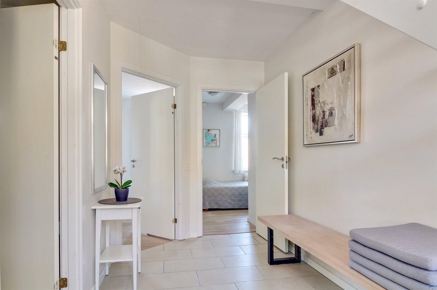 Diese nette, 2-stöckige Ferienwohnung liegt im Erdgeschoss und Obergeschoss in dem ehemaligen Kaufmannshof "Gudhjem Købmandsgård" – mitten im charmanten Fischerdorf Gudhjem. Vom Obergeschoss der Wohnung ist das Meer zu ahnen. Eine hell eingerichtete und gepflegte Ferienwohnung – 2019 teilweise modernisiert. Hier wurde u. a. in der Diele der Boden mit neuen Fliesen ausgelegt. Die Decken bis zum First sorgen für ein geräumiges Ambiente.