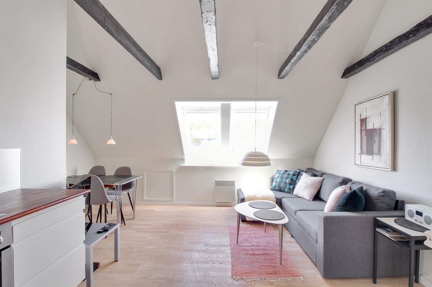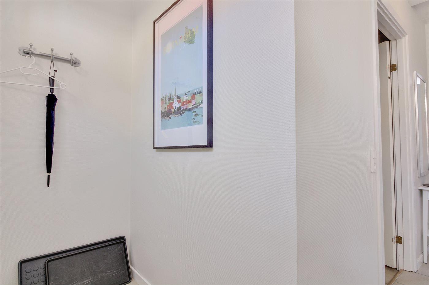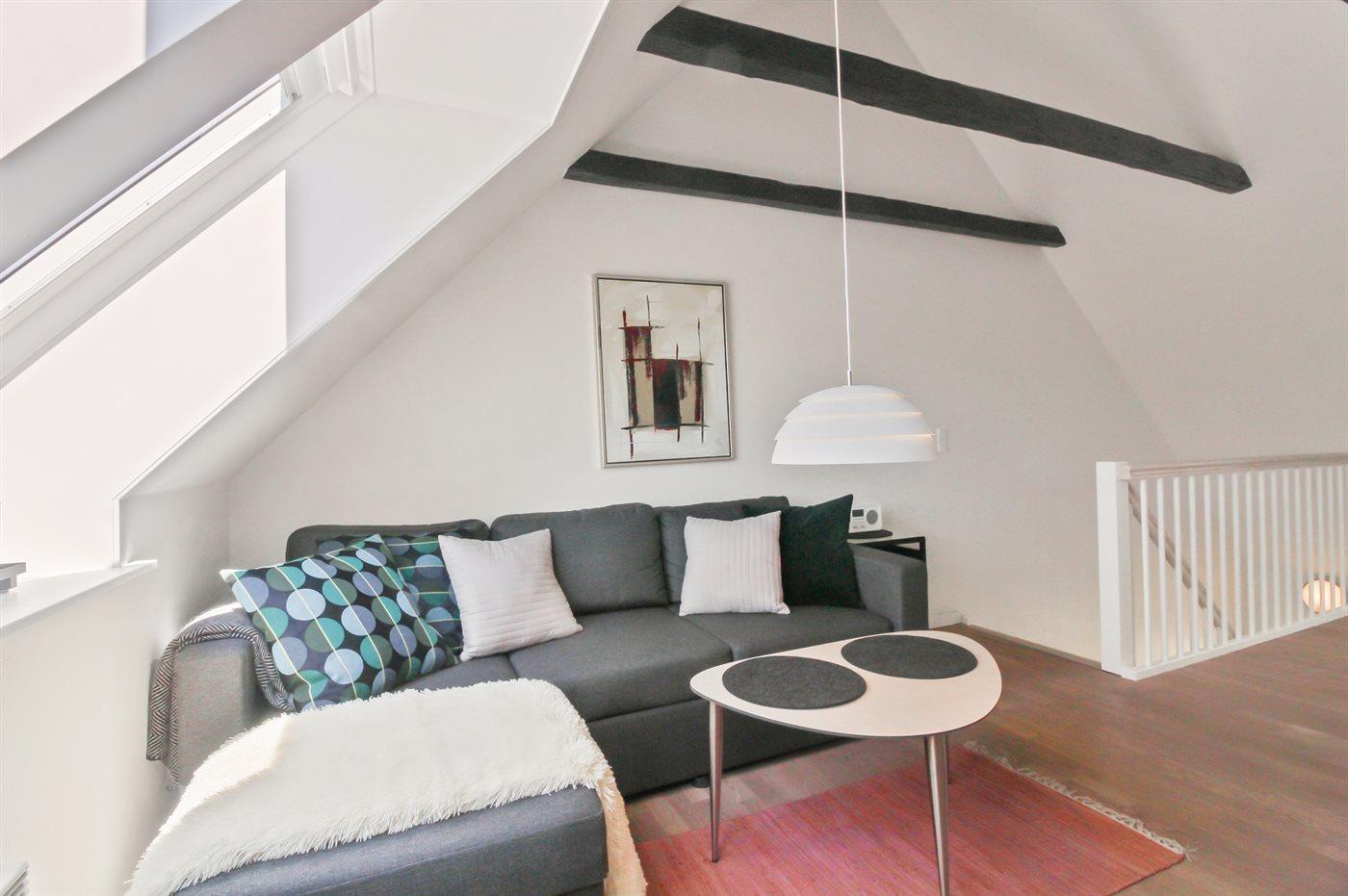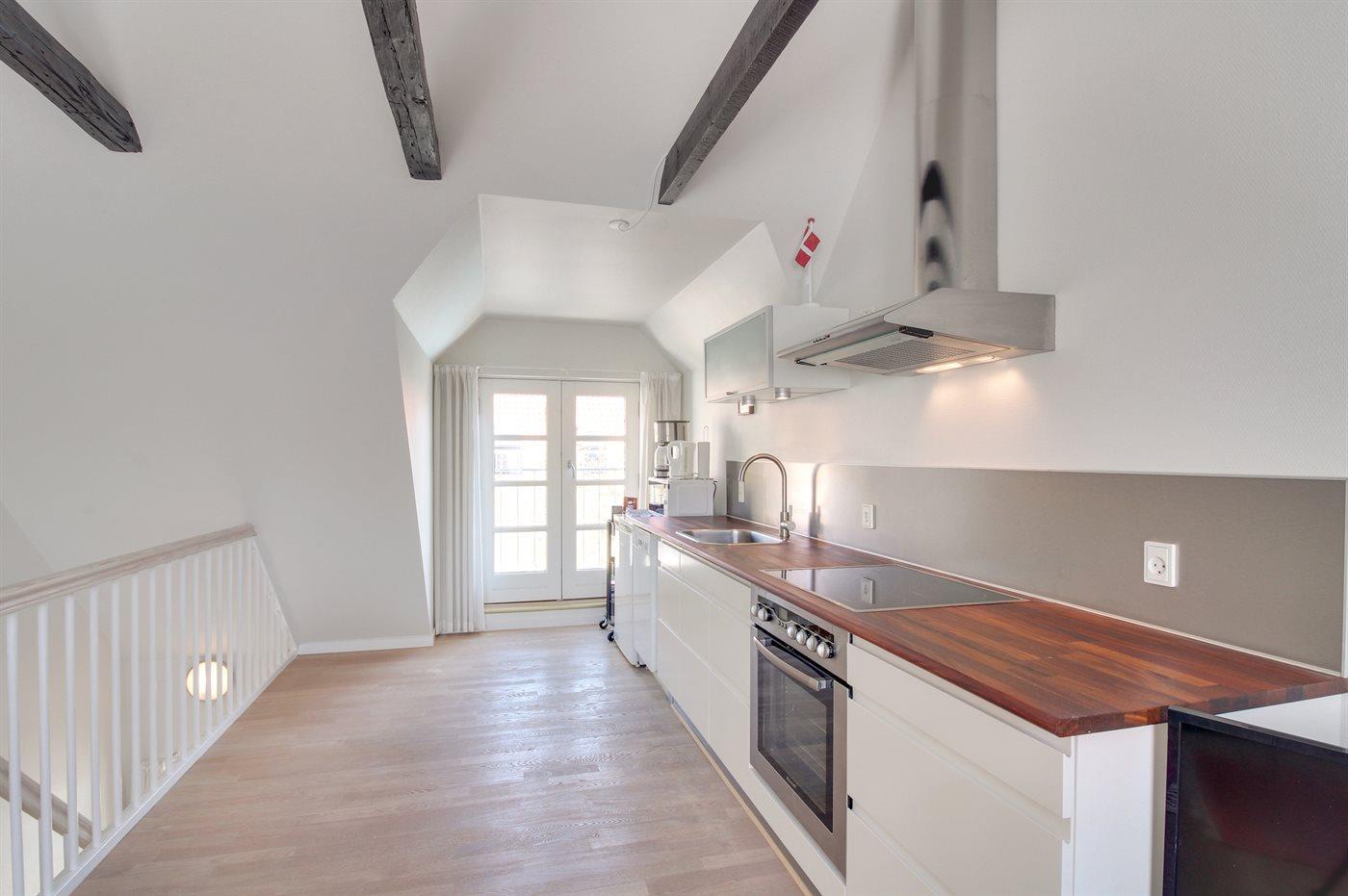 Diese nette, 2-stöckige Ferienwohnung liegt im Erdgeschoss und Obergeschoss in dem ehemaligen Kaufmannshof "Gudhjem Købmandsgård" – mitten im charmanten Fischerdorf Gudhjem. Vom Obergeschoss der Wohnung ist das Meer zu ahnen. Eine hell eingerichtete und gepflegte Ferienwohnung – 2019 teilweise modernisiert. Hier wurde u. a. in der Diele der Boden mit neuen Fliesen ausgelegt. Die Decken bis zum First sorgen für ein geräumiges Ambiente.