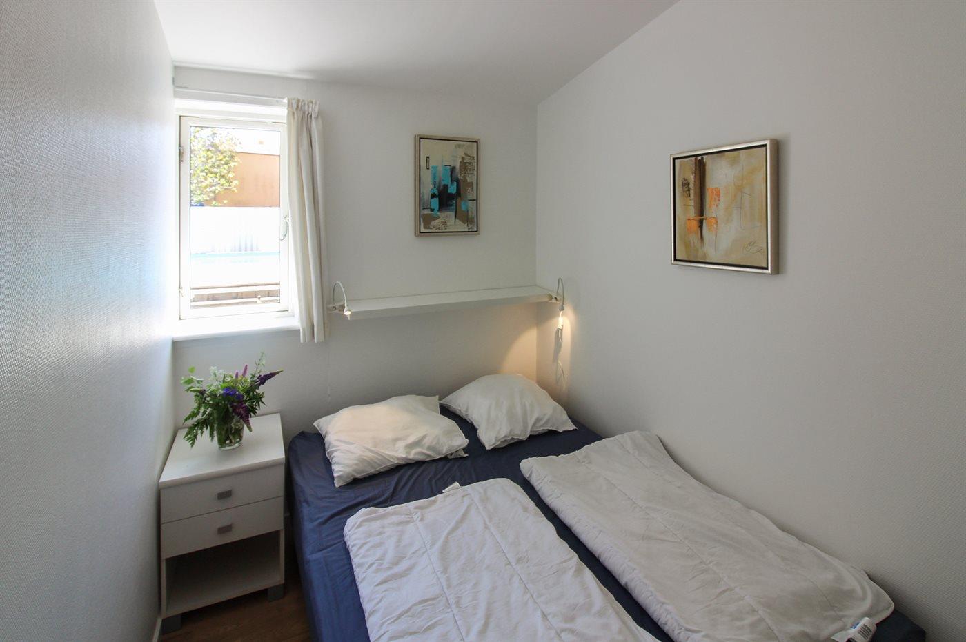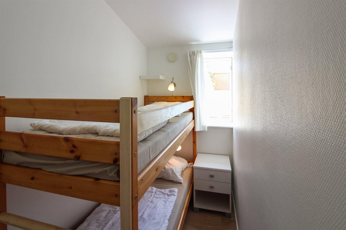 Die Schlafplätze verteilen sich auf 2 Schlafräume. 2 Schlafplätze in einem Doppelbett. 2 Schlafplätze in einem Etagenbett. 2 Schlafplätze auf einer Doppelschlafcouch.
