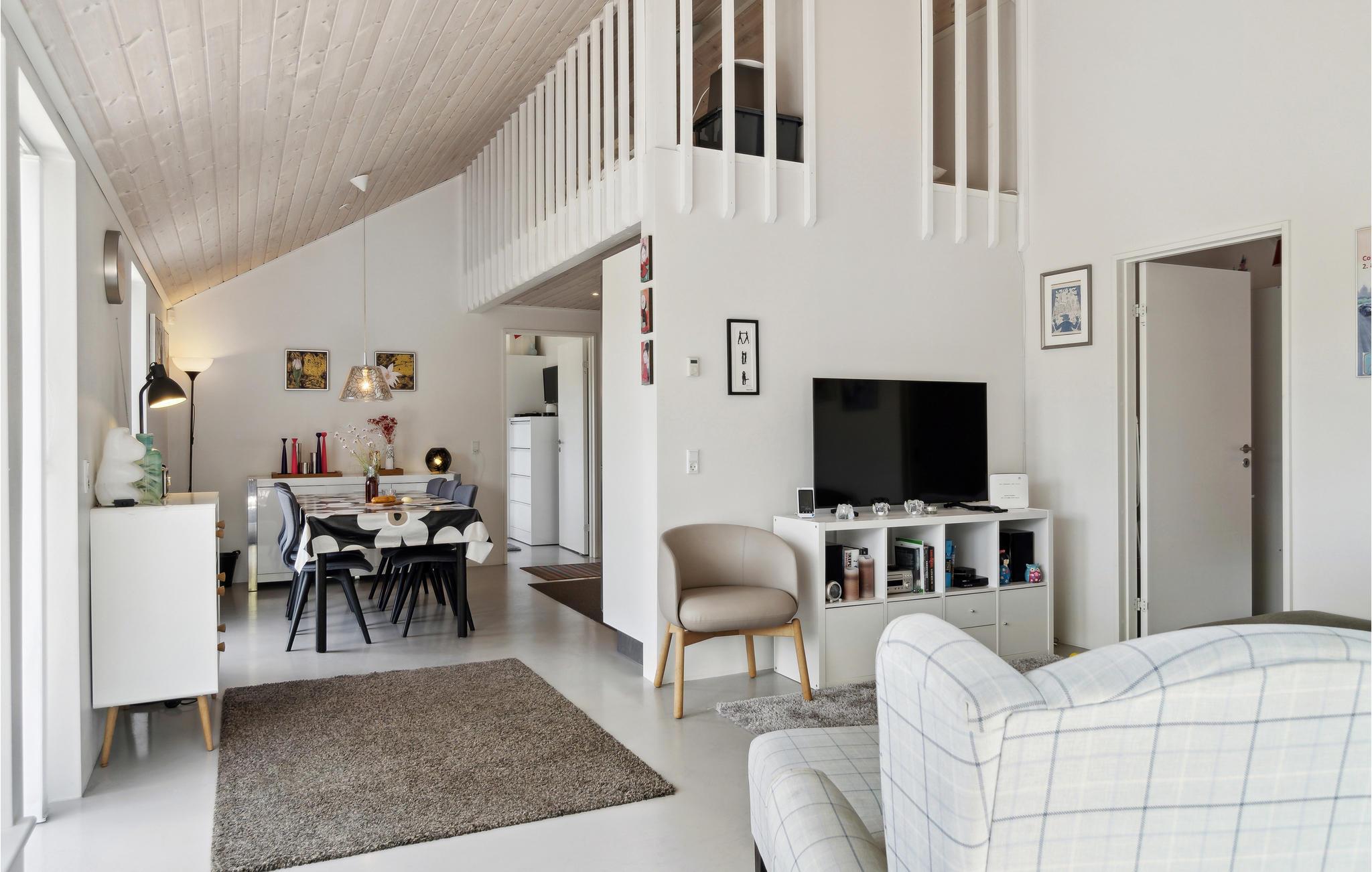 Das Ferienhaus verfügt über eine gute Küche mit Essbereich, Wohnzimmer mit Zugang zu der geräumigen, teilweise überdachten Terrasse. Dort gibt es reichlich Gelegenheit, Schatten und Sonne zu finden, und am Abend können Sie den Grill anzünden und die Ruhe genießen. Es gibt insgesamt drei Schlafzimmer, einen großen Dachboden und ein schönes Badezimmer mit Dusche, Waschmaschine und Trockner. Außerdem eine Garage. Der Zugang zum Dachboden erfolgt über eine Leiter an der Wand.