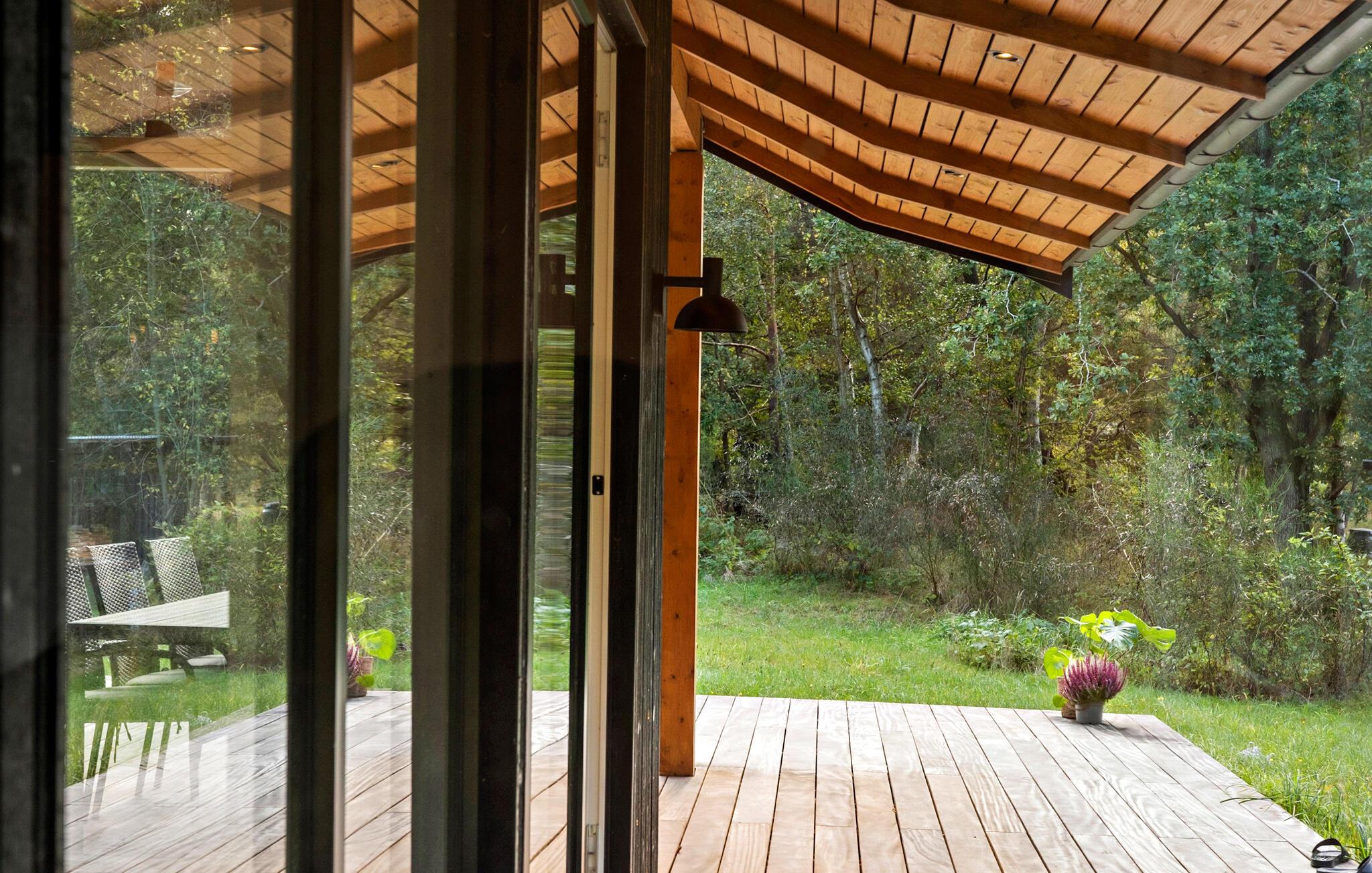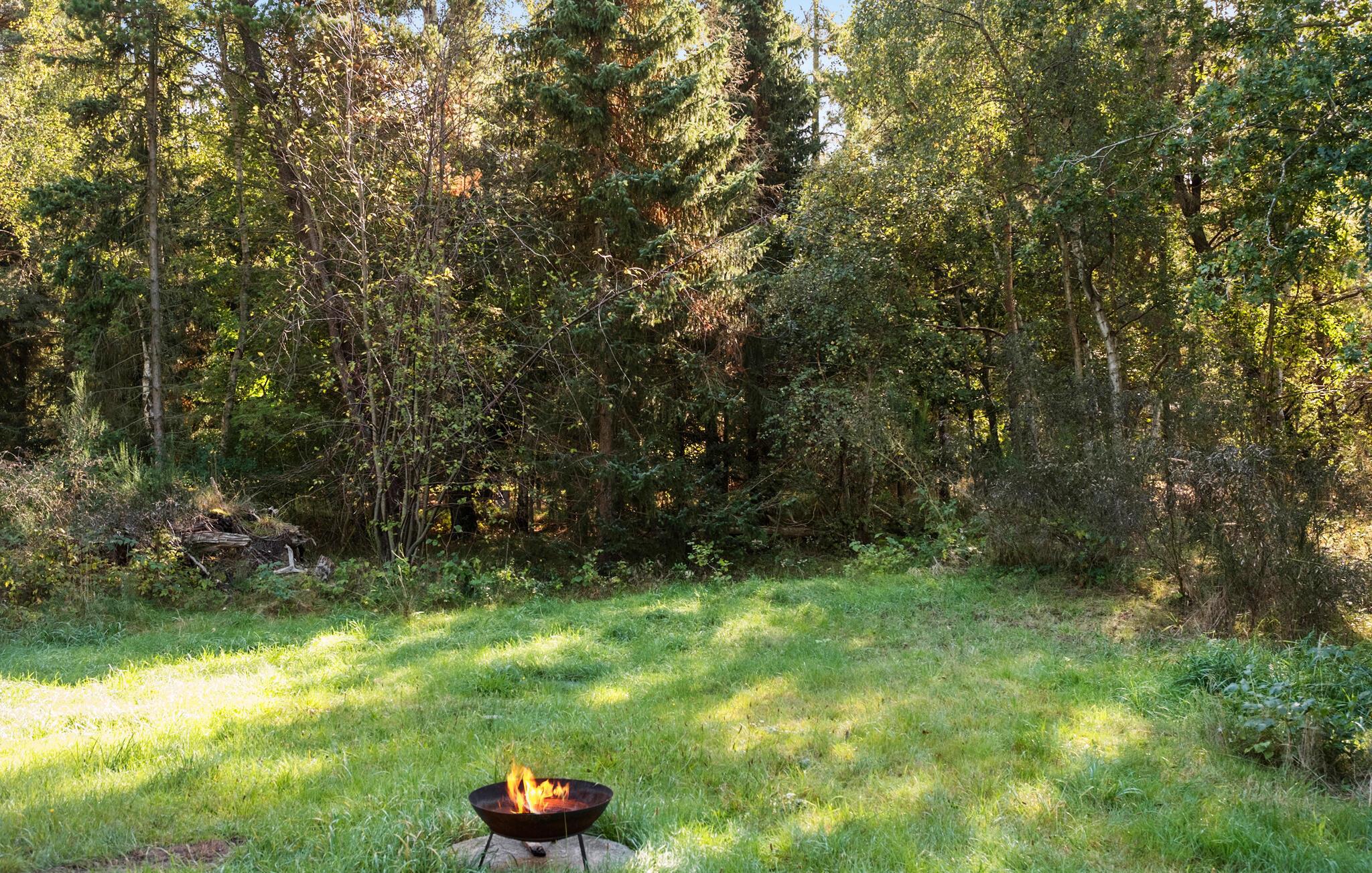 Draußen erwartet Sie eine große Holzterrasse mit Lounge-Möbeln und Liegestühlen. Frühstücken Sie an der frischen Luft, nehmen Sie im Sommerhalbjahr eine Außendusche nach einem Strandtag oder genießen Sie den Abend in der angenehmen Abendsonne. Das naturbelassene Grundstück ist von Bäumen umgeben und bietet viel Privatsphäre.
