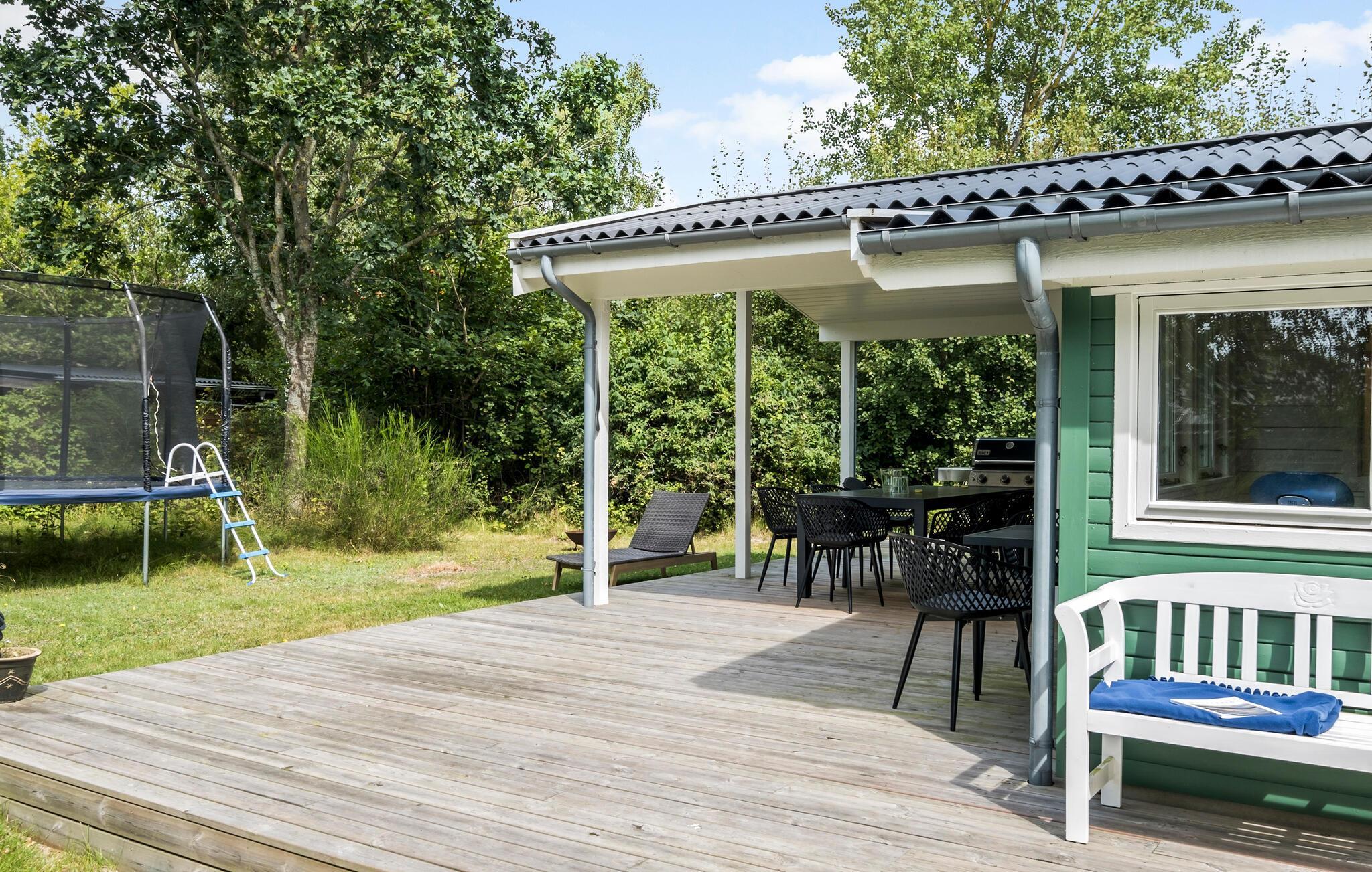 Gemütliches Ferienhaus in Gudmindrup Strand mit zwei Gebäuden, großer Terrasse, Spielmöglichkeiten und Nähe zum Strand.