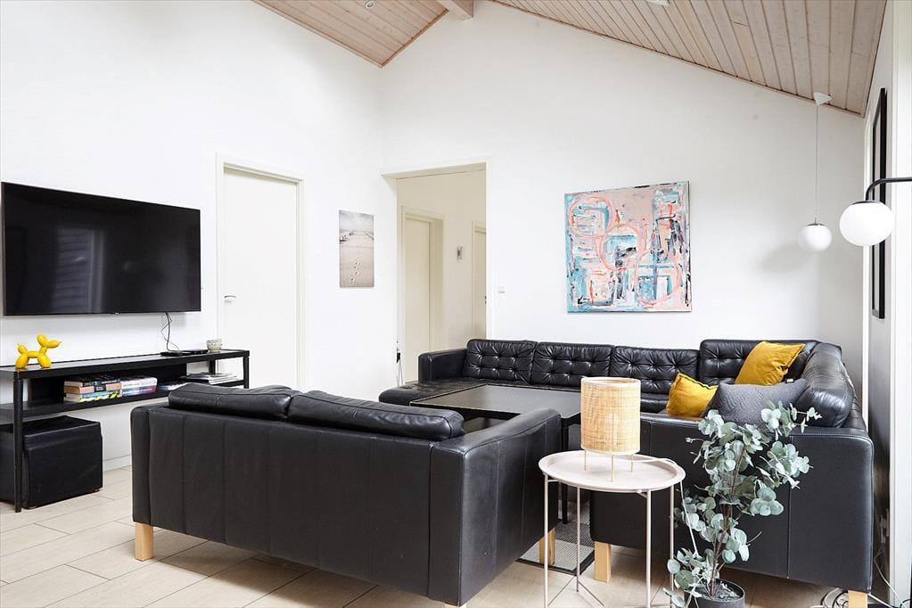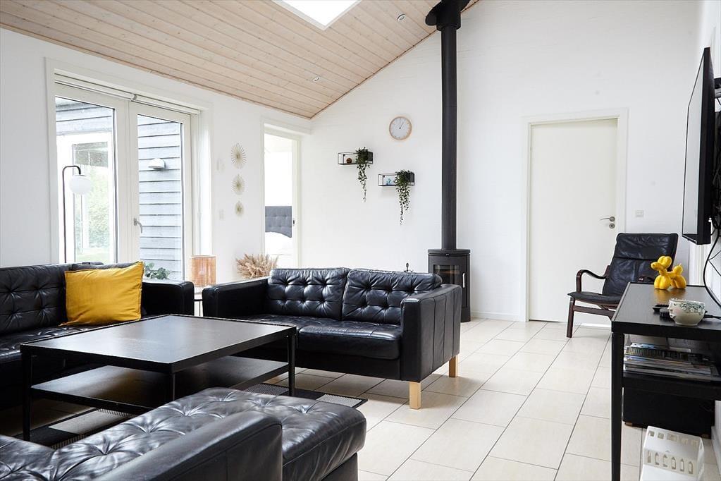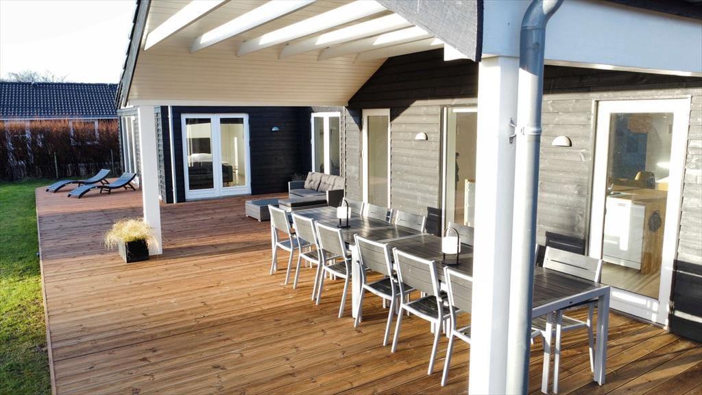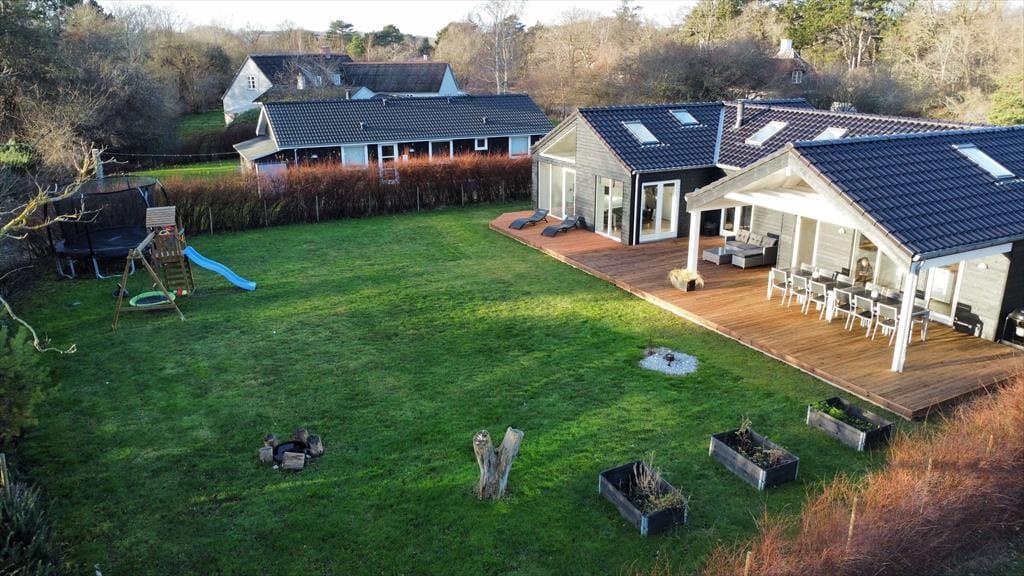 Schönes Wohnzimmer mit Holzofen, gutem W-Lan und einem 65-Zoll Smart Fernseher. Hier können Sie alle Streamingdienste über Ihrem eigenen Abonnement oder über ViaFree benutzen. In der großen Küche mit allen Bequemlichkeiten gibt es genug Platz dafür, dass Sie sich alle mit dem Essen helfen können, oder ganz einfach um den Esstisch herum eine gemütliche Zeit haben. Es gibt 2 schöne Badezimmer und 5 tolle Schlafzimmer, wovon 2 ein Paar zusätzliche Schlafplätze in Schlafböden anbieten können. Bitte beobachten, dass nur eine steile Treppe darauf führt. In der Waschküche finden Sie eine Waschmaschine. Tolle sonnige Terrasse, in eine offene und eine überdeckte Sektion aufgeteilt. Her können Sie ab Morgen bis Abend die Sonne genießen. Die Kinder werden es lieben, in dem Spielturm sein zu können, während Sie ein Paar gute Steaks auf den Grill hinlegen. Wenn Sie mehrere Generationen sind und nahe beieinander wohnen müssen, steht auch das Haus direkt daneben zur Miete zur Verfügung (Høve Stræde 42C).