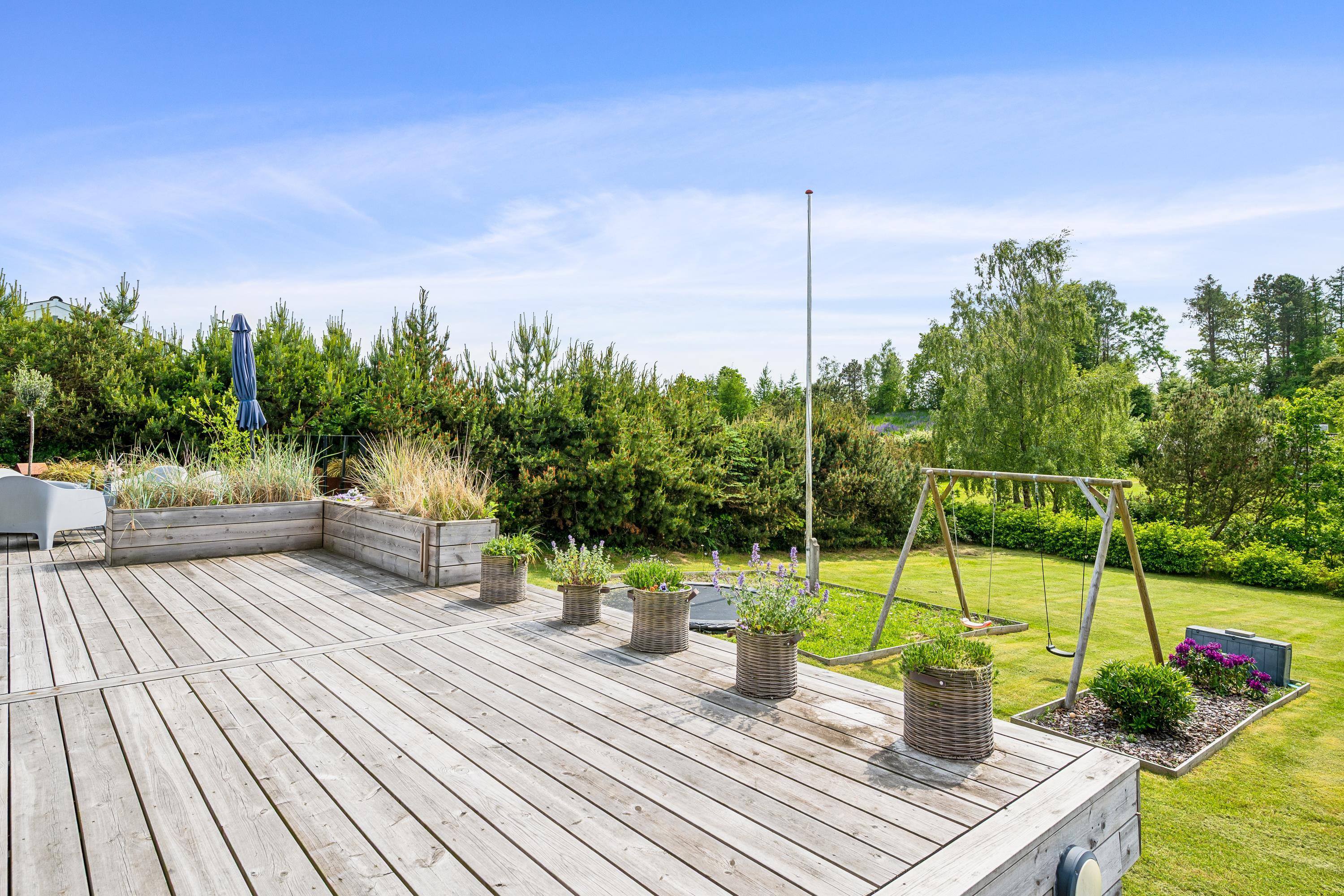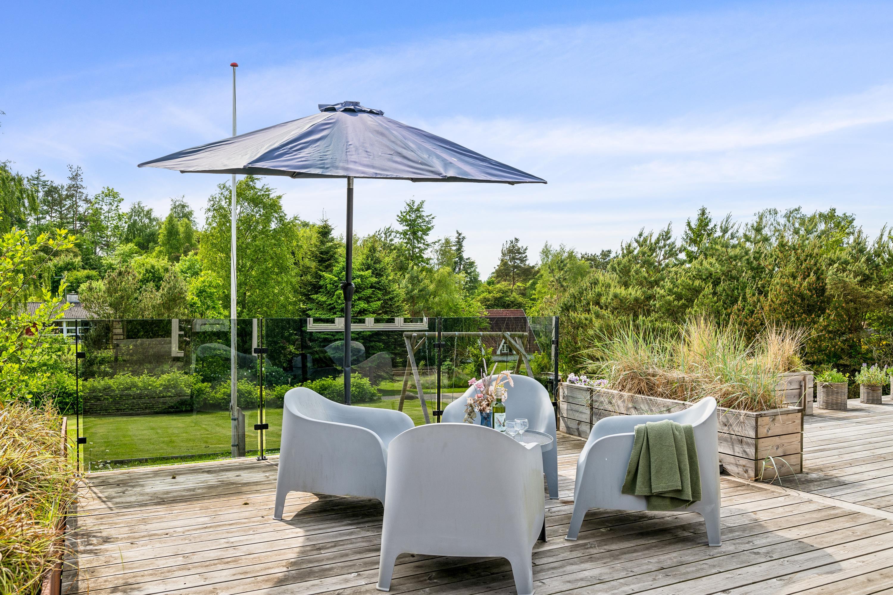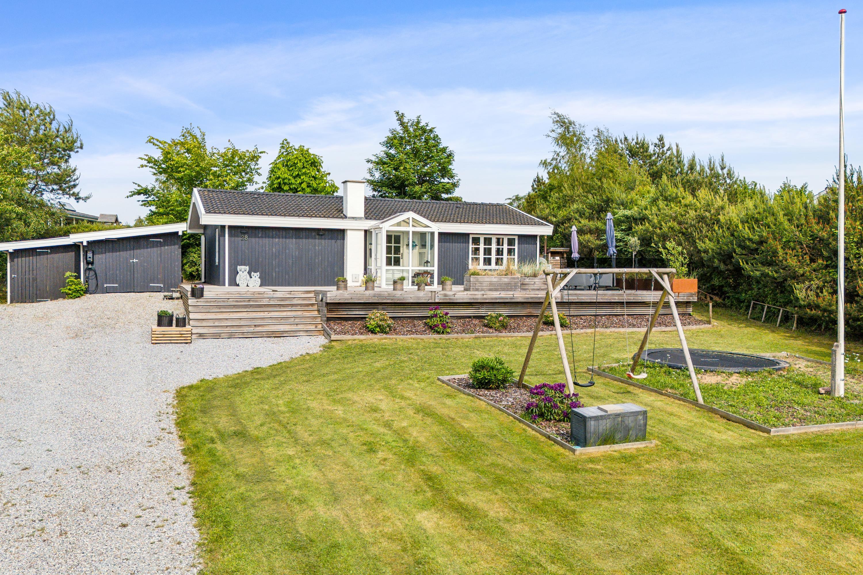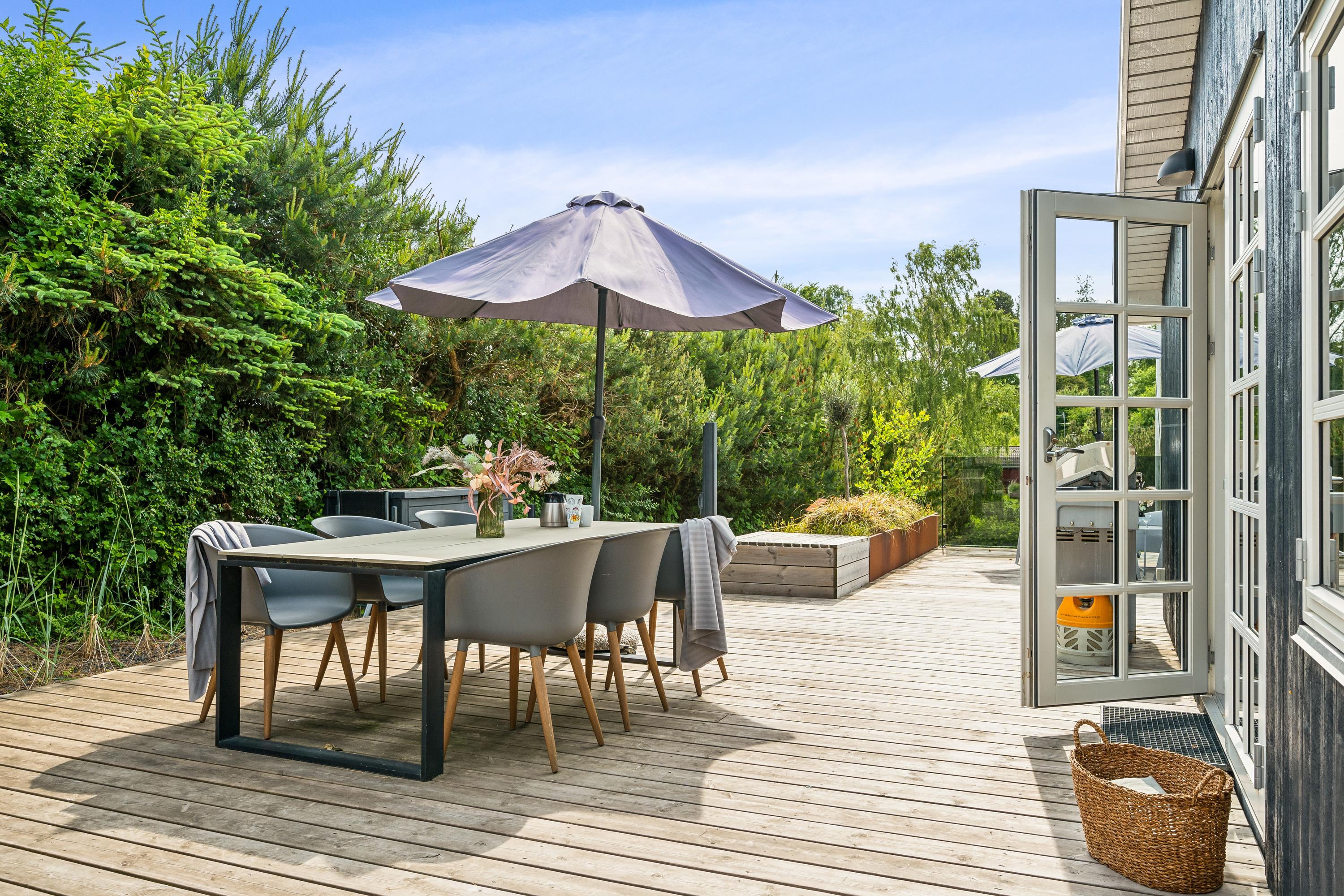 Dieses frisch renovierte und hervorragend eingerichtete Ferienhaus liegt im Gebiet Handrup Bakker nördlich von Ebeltoft, in Fußwegentfernung von einem kinderfreundlichen Sandstrand mit Badesteg an der Bucht Ebeltoft Vig. Die große, teilweise überdachte und nach Südwesten gewandte Terrasse hat viele gemütliche Ecken und ist mit Gartenmöbeln, Liegestühlen, Wildnisbad, Aussendusche, Sonnenschirm und Grill ausgestattet. Auf der Ostterrasse kann man in der Morgensonne frühstücken und den Kindern beim Schaukeln oder auf dem Trampolin springen zuschauen. Für größere Gruppen oder mehrere Familien besteht die Möglichkeit, auch das Nachbarhaus mit der Nummer 15826 zu mieten.