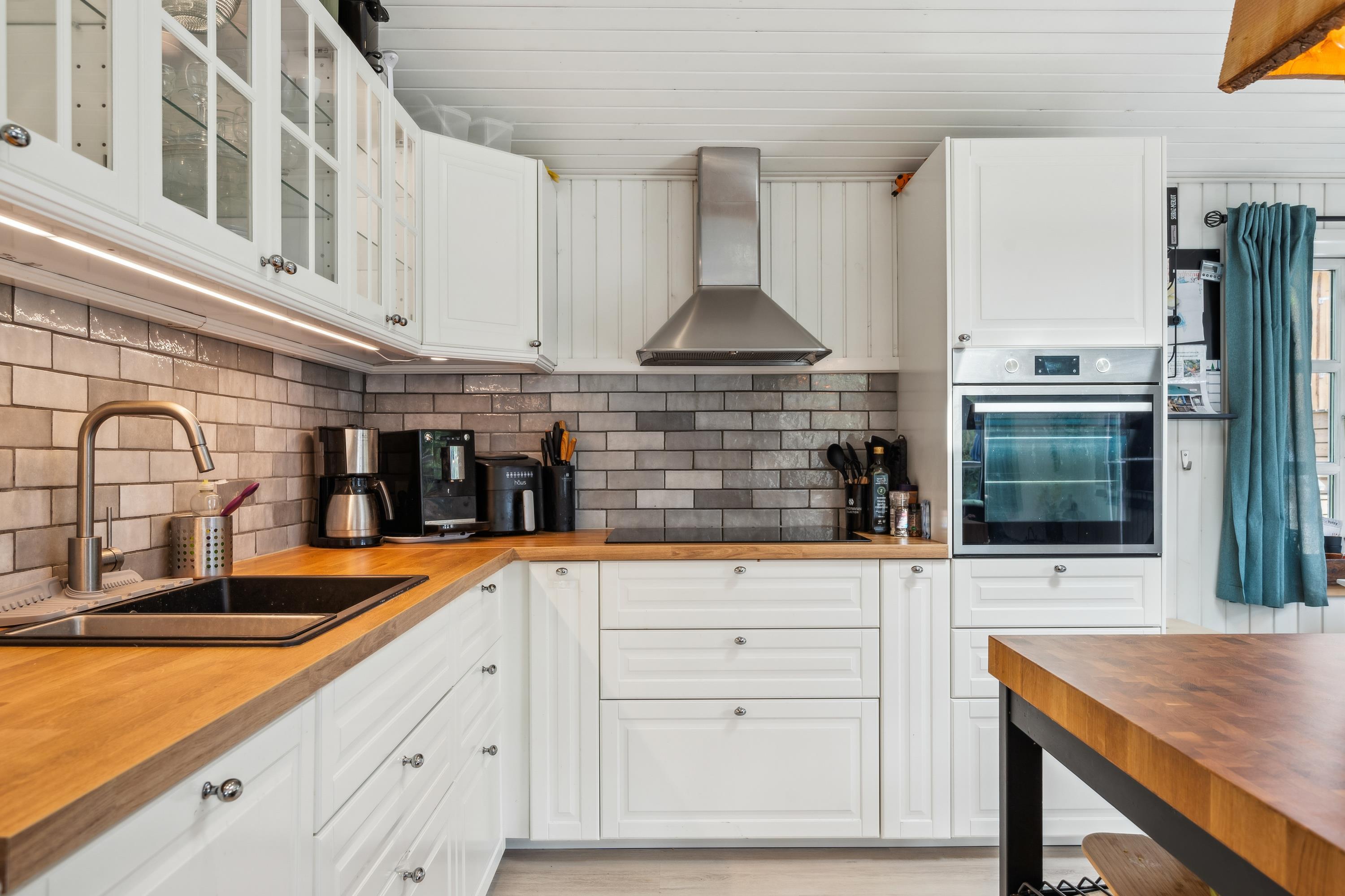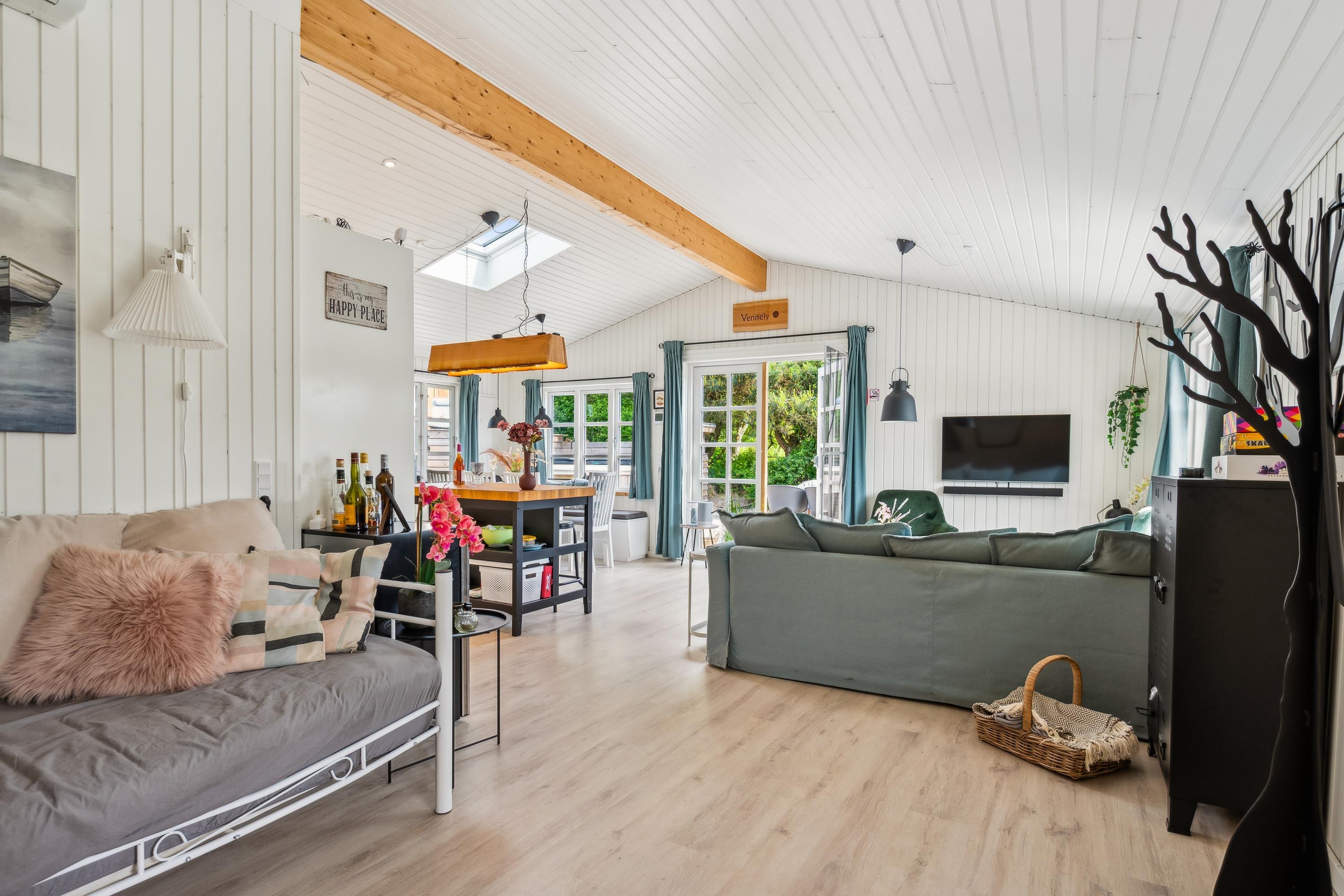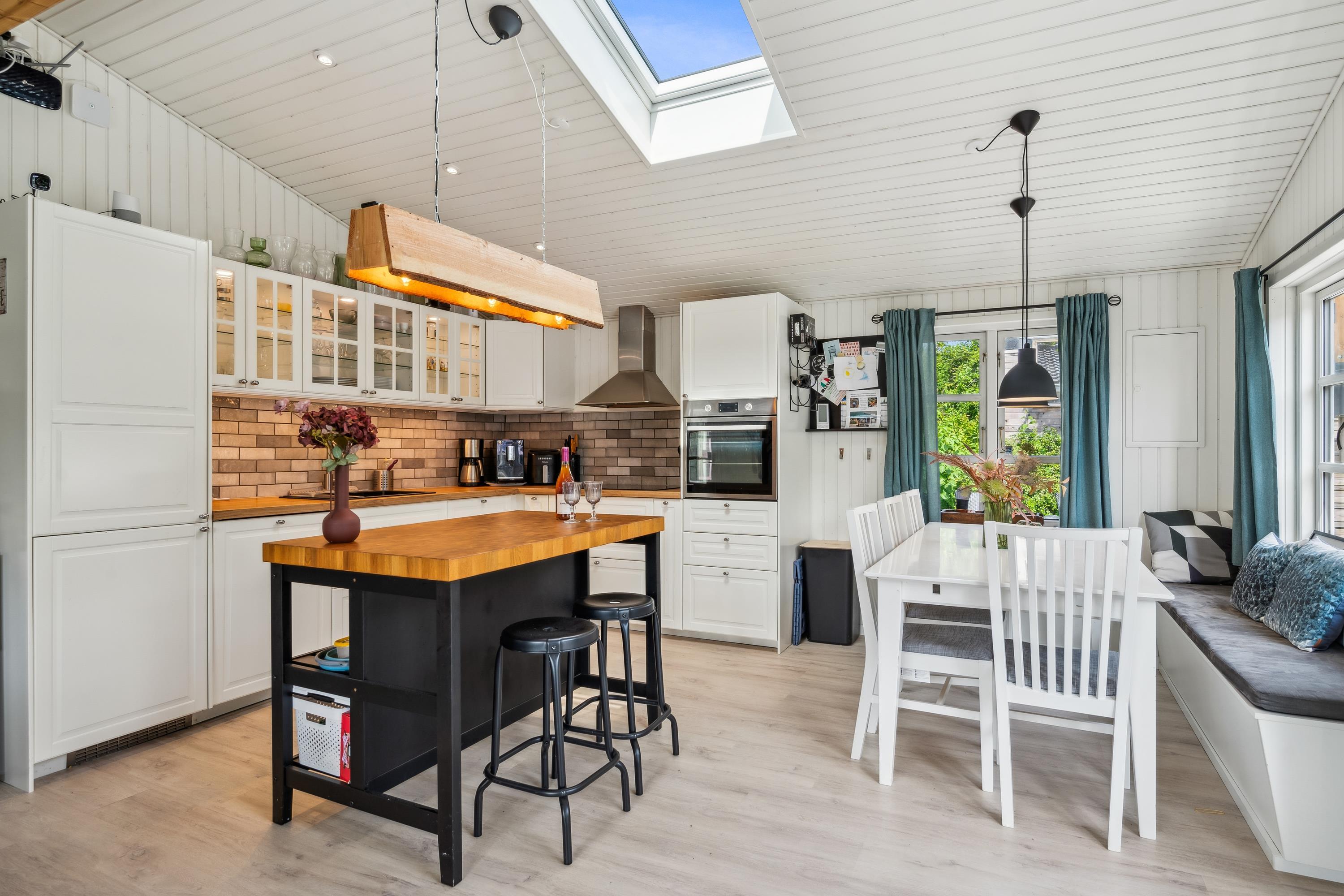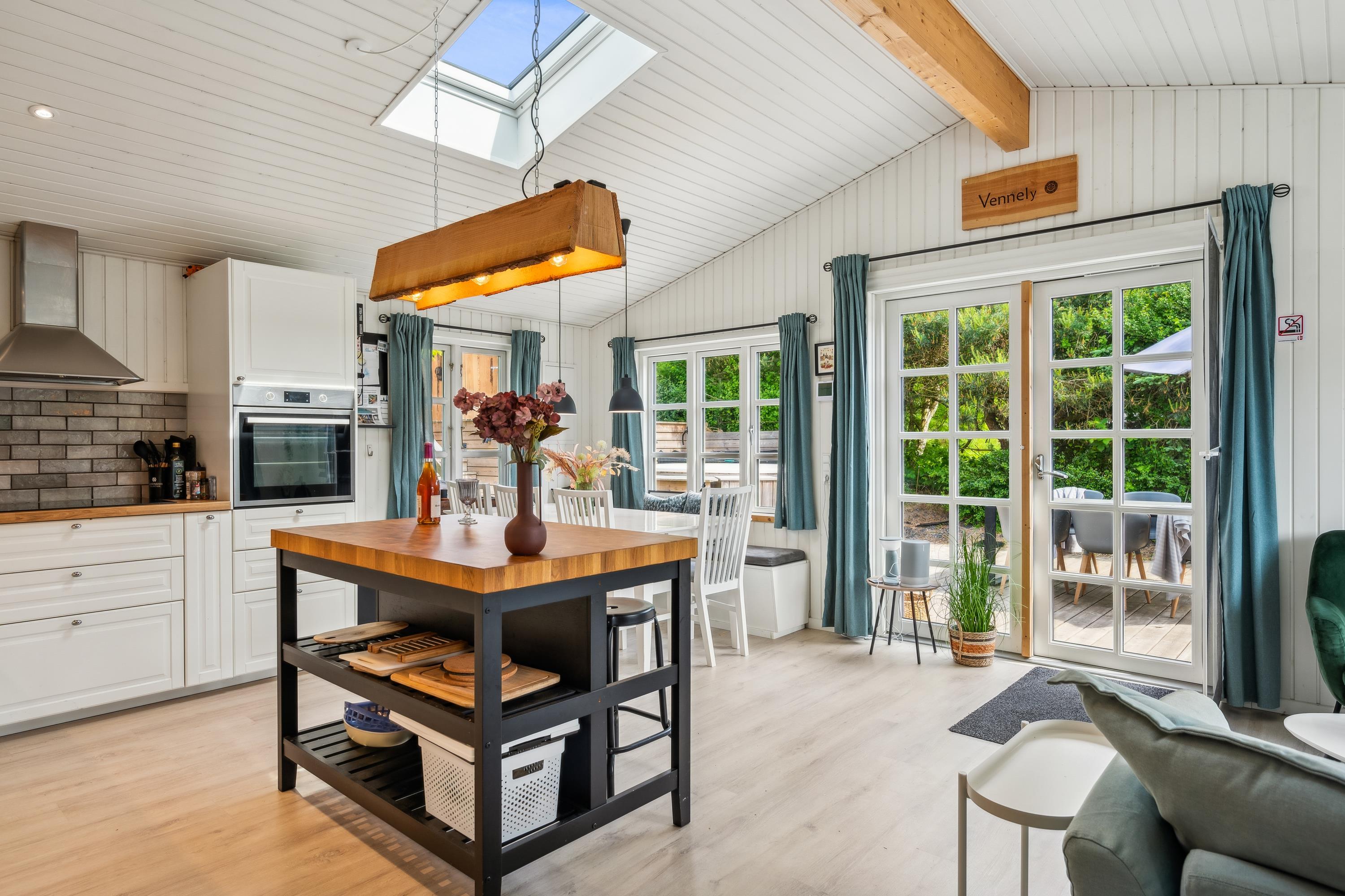 Vom verglasten Windfang kommt man in das große, helle Wohnzimmer mit Ausgang zur Terrasse und in offener Verbindung zur Küche mit Essplatz für sechs Personen. Das Wohnzimmer ist gemütlich eingerichtet mit Kaminofen, Sofabereich, TV mit dänischen (inkl. TV2) und deutschen Programmen sowie Radio. Neue, gut ausgestattete Küche mit viel Arbeits- und Schrankfläche, Glaskeramik-Kochfeld, Backofen, Kühl-/Gefrierkombination und Geschirrspüler. Die sechs Schlafplätze verteilen sich auf drei schöne, helle Schlafzimmer mit Doppelbett. Schickes, großes Badezimmer mit Dusche, Fußbodenheizung sowie Whirlpool-Bereich, in dem auch eine Waschmaschine und ein Trockner stehen. Im neu gebauten Nebengebäude befinden sich eine Sauna und eine Grobküche. Internetzugang.