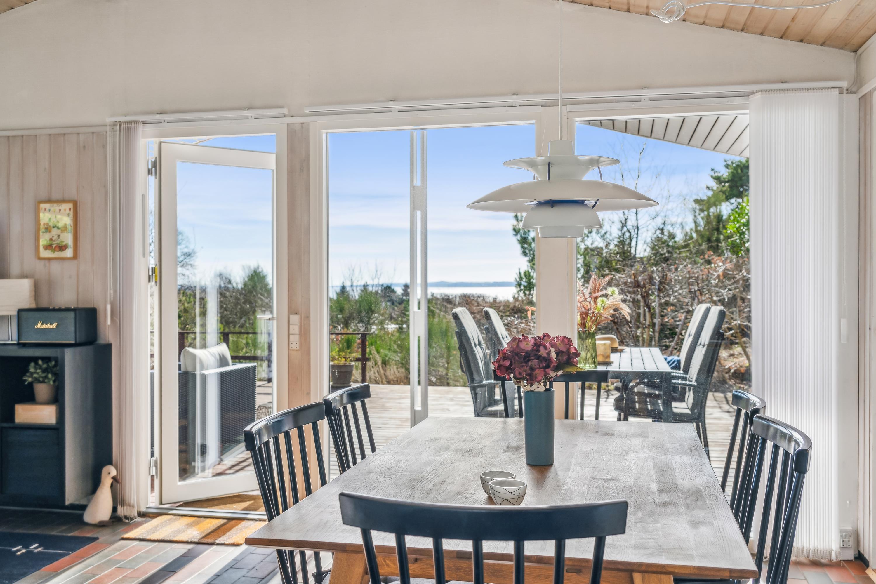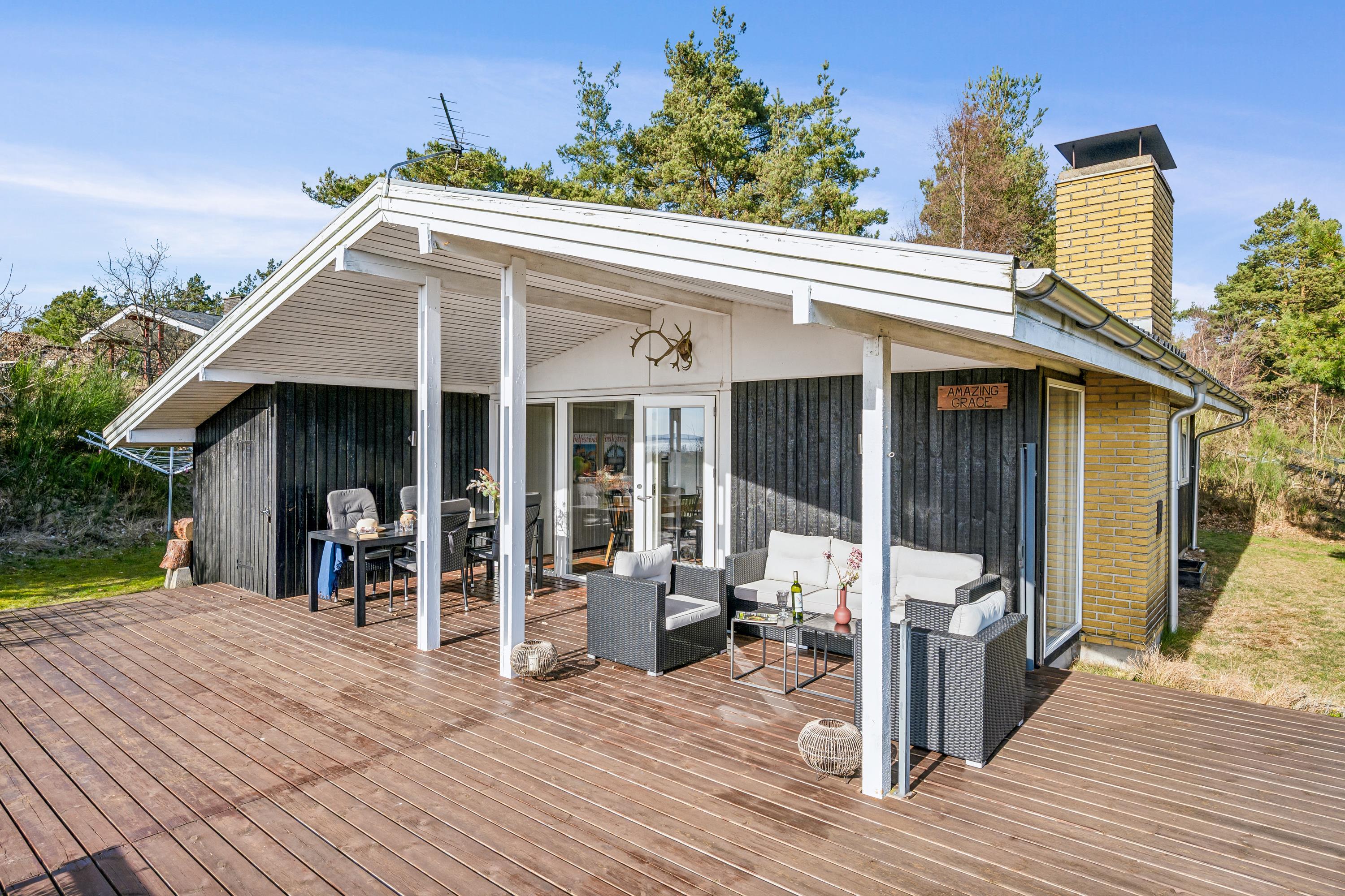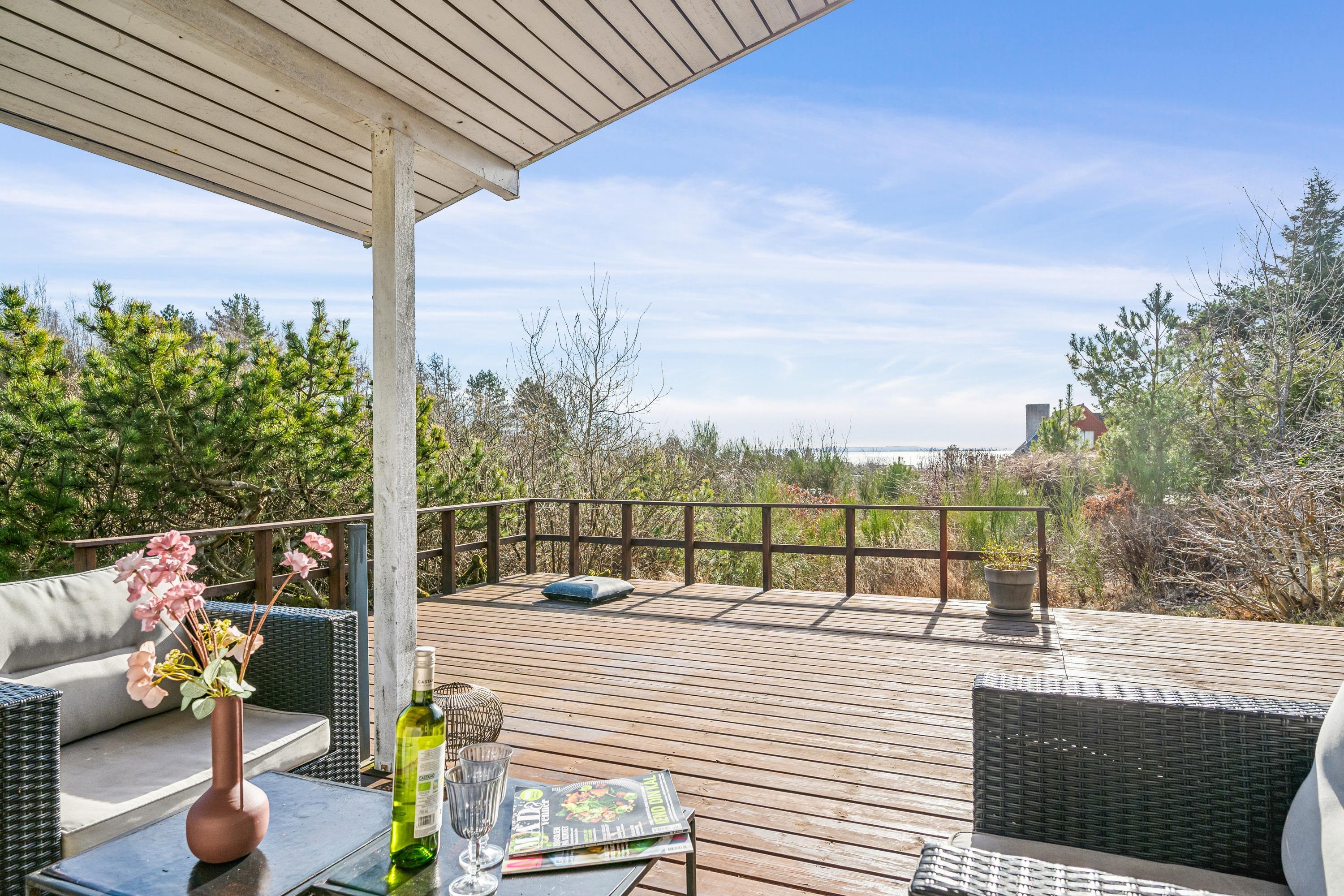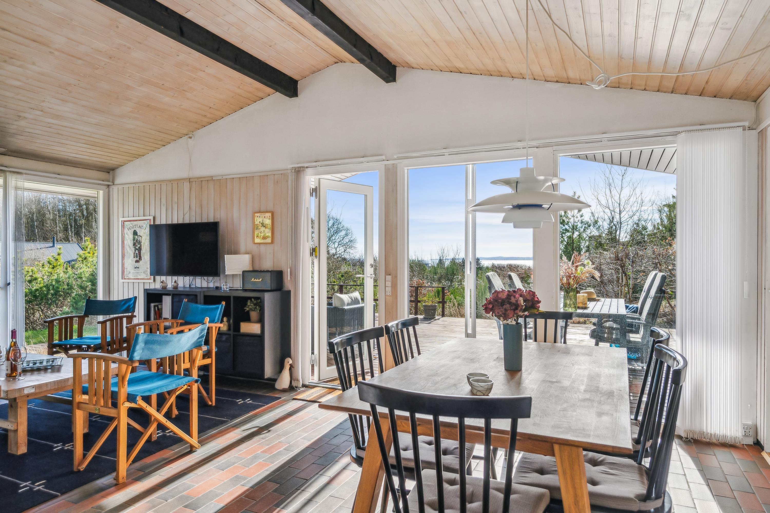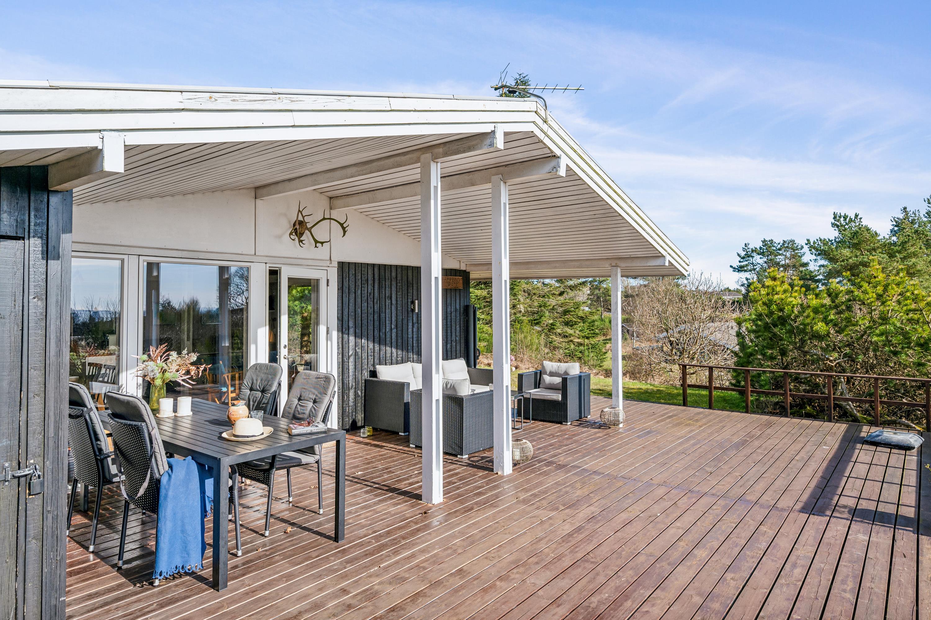 Willkommen in diesem „echten“ Ferienhaus hoch oben auf einem Hanggrundstück mit fantastischem Blick über die Umgebung und auf das Wasser. Hier finden Sie ein gemütliches und gut eingerichtetes Wohnzimmer mit unter anderem Wärmepumpe und Kamin sowie Zugang zu einer überdachten und offenen Terrasse mit guten Gartenmöbeln. In Verbindung mit dem Wohnzimmer finden Sie die gut ausgestattete Küche, unter anderem mit Spülmaschine und von der aus Sie Zugang zu einer weiteren Terrasse mit Gartenmöbeln haben. Schönes Badezimmer mit Dusche und Fußbodenheizung. Die Schlafplätze des Ferienhauses befinden sich in den 4 Schlafzimmern des Ferienhauses, darunter zwei Zimmer mit Doppelbetten, ein Zimmer mit einem Etagenbett für zwei Personen und ein Zimmer mit einem kleineren Etagenbett für ein Kind. Im Ferienhaus gibt es dänische, deutsche und nordische Fernsehsender. Für den kleinen Feriengast steht ein Hochstuhl bereit.