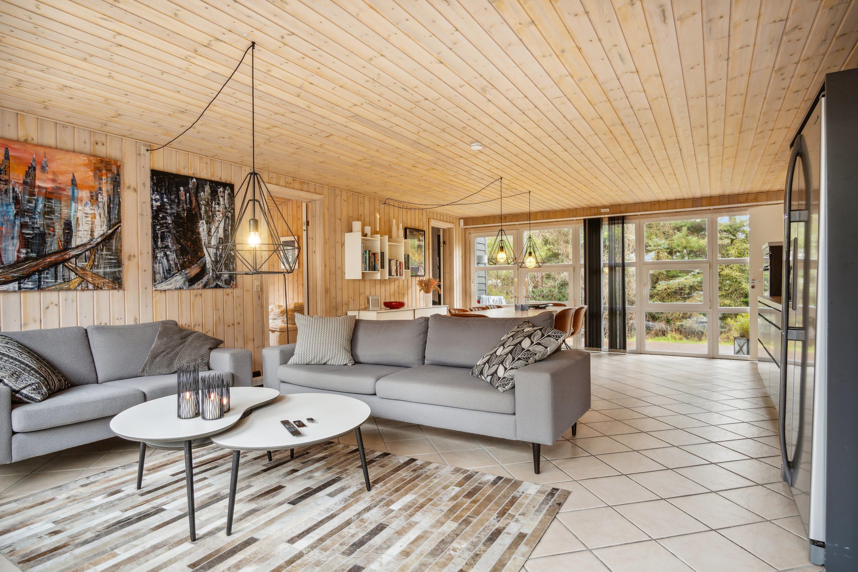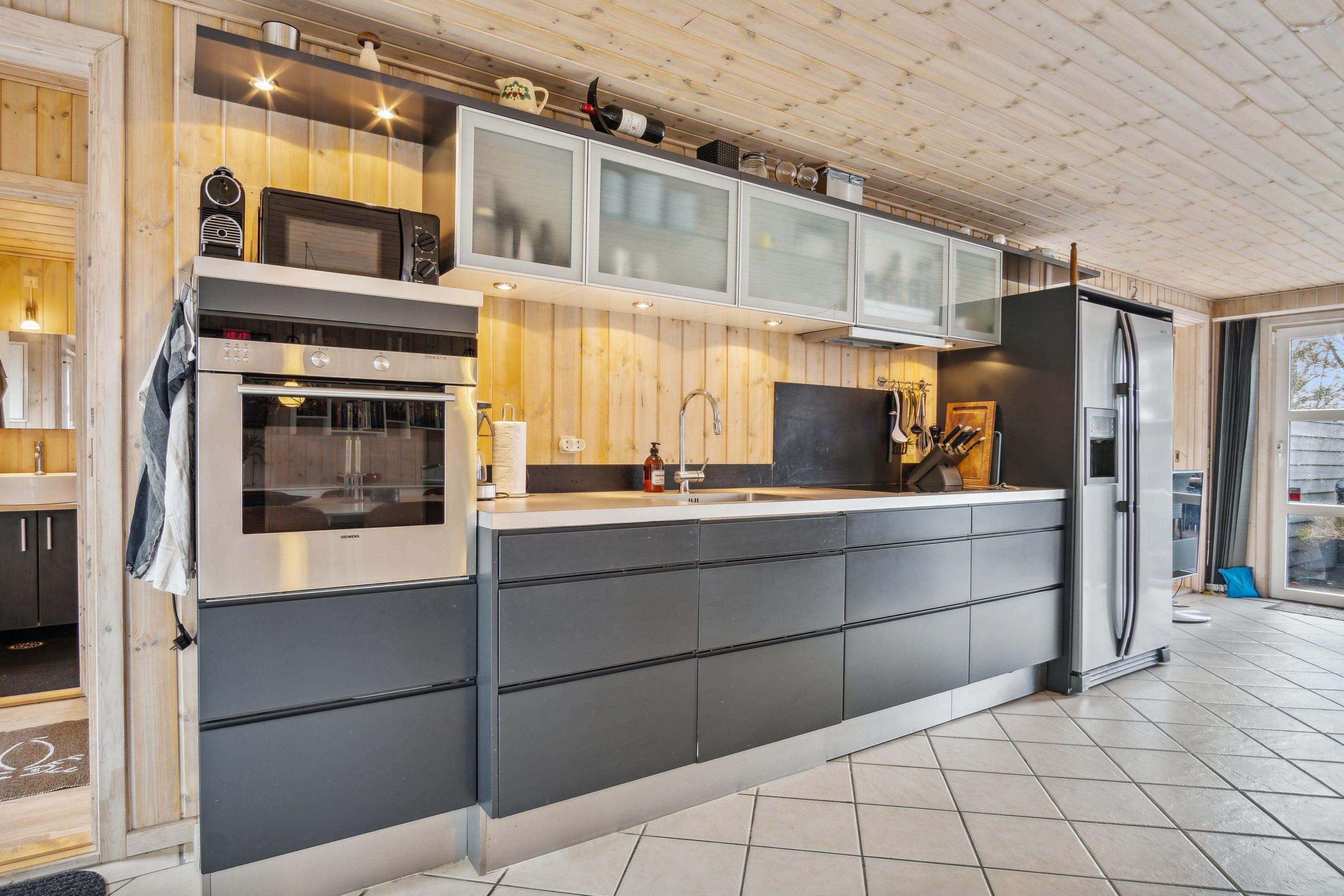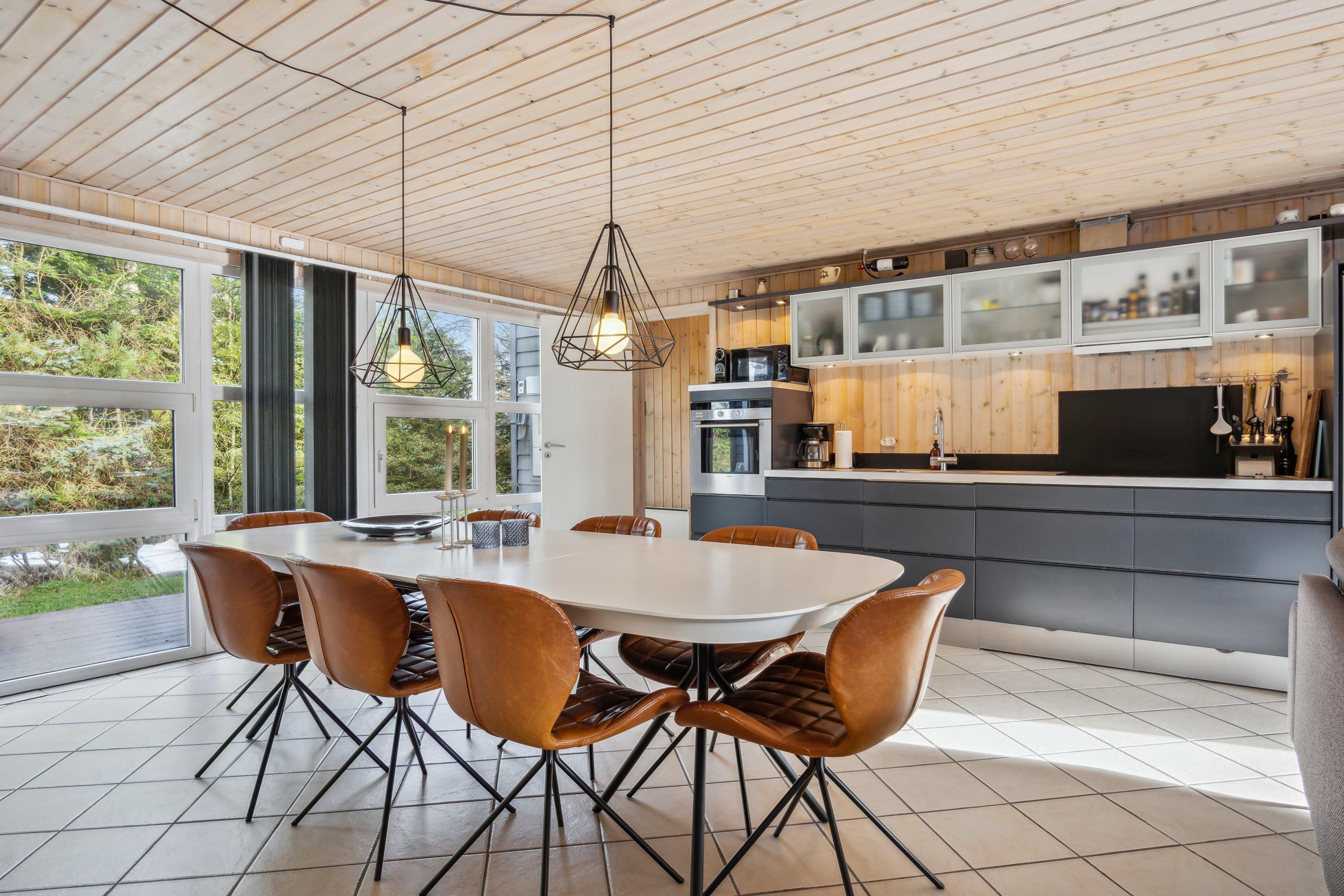 Im landschaftlich reizvollen Gebiet von Handrup Bakker liegt dieses gepflegte und gut eingerichtete Ferienhaus. Es bietet einen großzügigen Eingangsbereich mit Platz für Schuhe und Jacken sowie Zugang zu einem Gäste-WC mit Dusche. Die Küche ist modern und gut ausgestattet, unter anderem mit einem amerikanischen Kühlschrank, und bietet direkten Zugang zu einer schönen Terrasse. Angrenzend an die Küche befinden sich der gemütliche Essbereich und das geschmackvoll eingerichtete Wohnzimmer mit Kaminofen.
