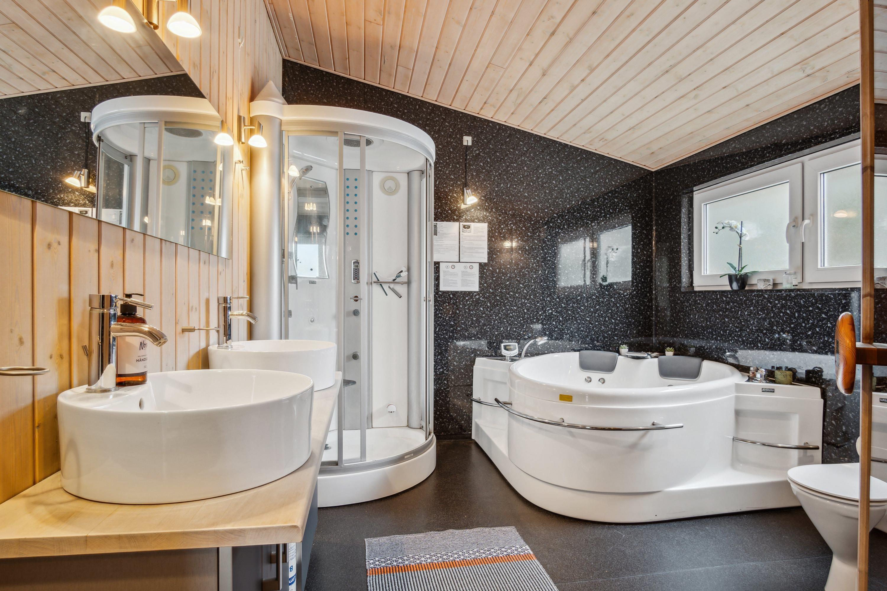Das große Wellness-Badezimmer lädt mit Whirlpool und Sauna zum Entspannen nach einem langen Tag ein. Die Schlafmöglichkeiten verteilen sich auf vier schöne Schlafzimmer – zwei mit Doppelbetten und zwei mit Einzelbetten.