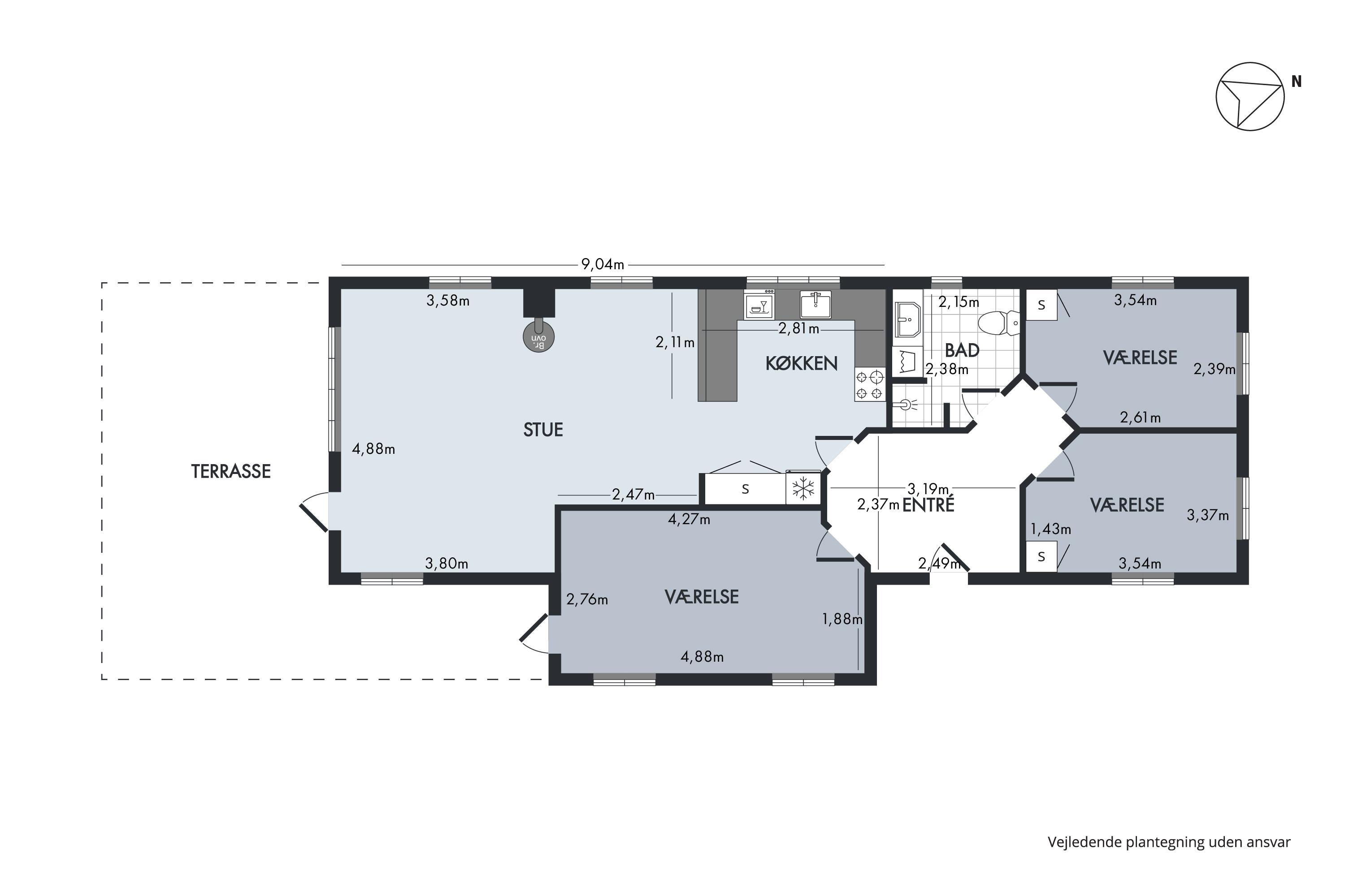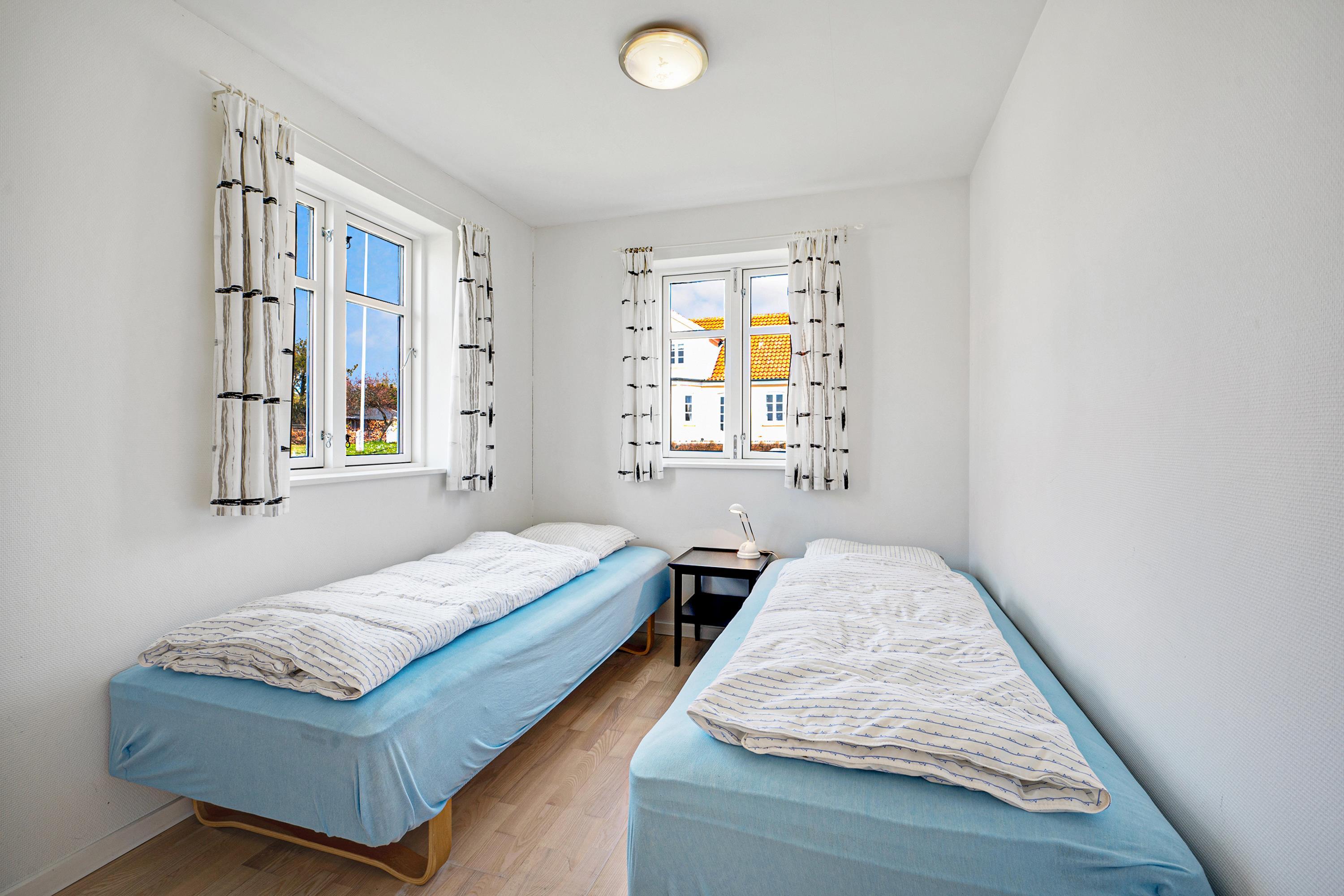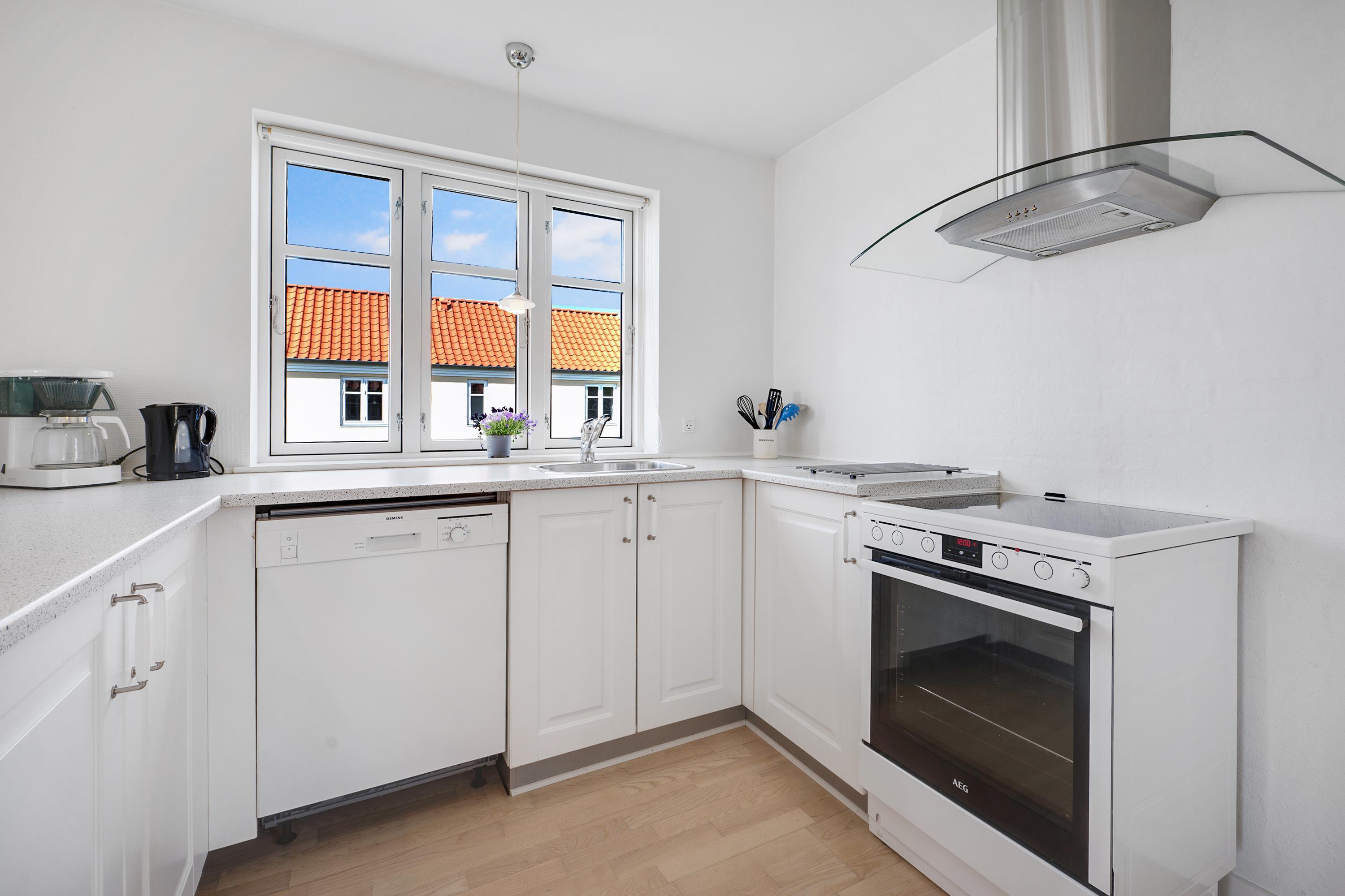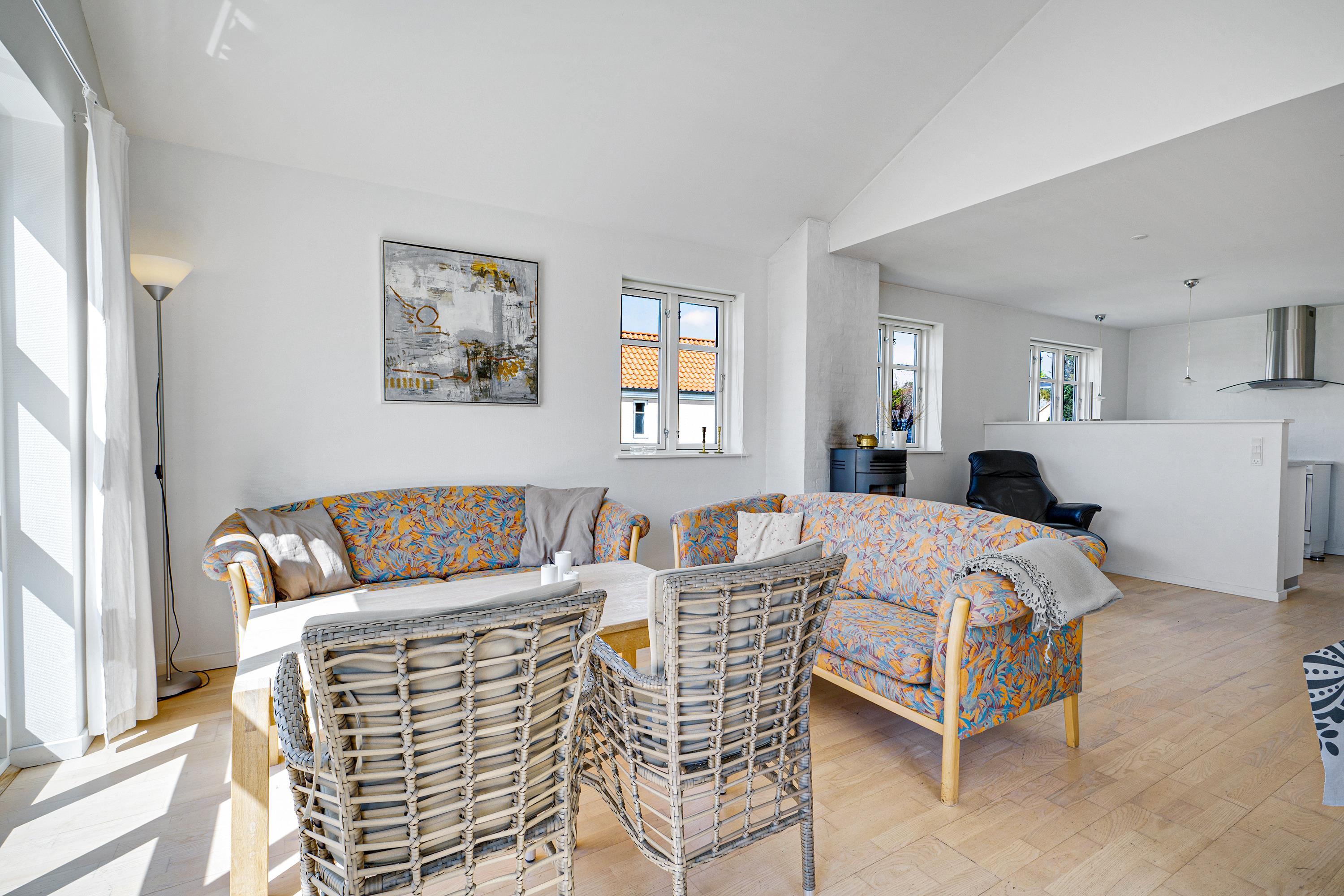 Großes, helles Wohnzimmer mit Dachschrägen und Terrassenzugang. Hier ist ein Holzofen, Sofagarnitur, Essplatz für 6 Personen, Fernseher mit dänischen (inkl. TV2) und deutschen Sendern, CD-Player und Radio. Gute, neuere Küche in offener Verbindung zum Wohnzimmer und ausgestattet mit Herd mit Ceranfeld und Backofen, Kühlschrank mit Gefrierfach, Geschirrspüler und Mikrowelle. Schönes, großes gefliestes Badezimmer mit Dusche, Waschmaschine und Fußbodenheizung. Das Haus bietet Platz für 6 Personen, aufgeteilt in 3 schöne, helle Schlafzimmer - 1 großes Zimmer mit Doppelbett und 2 etwas kleinere Zimmer mit jeweils 2 Einzelbetten. Internet-Zugang vorhanden.