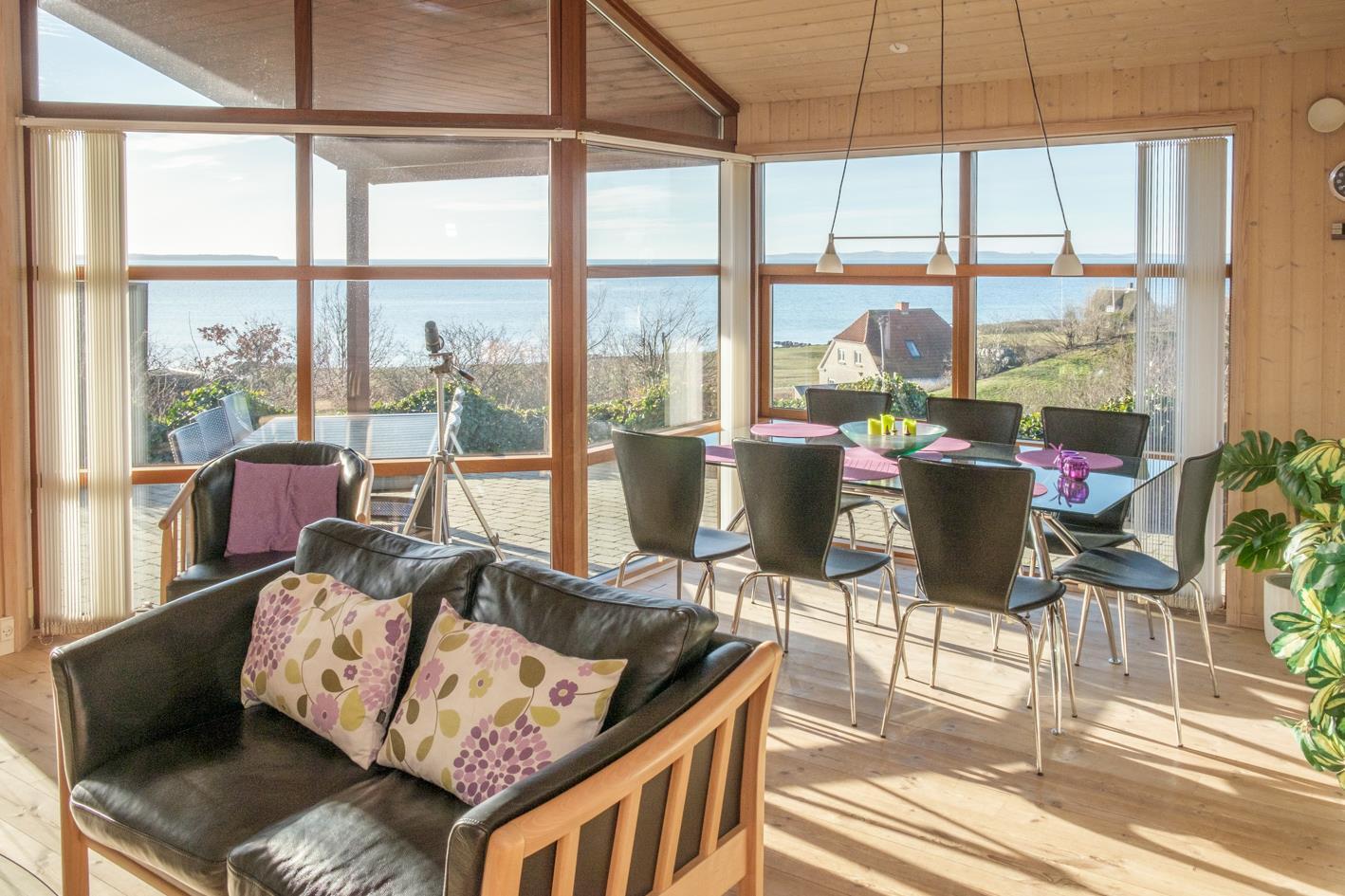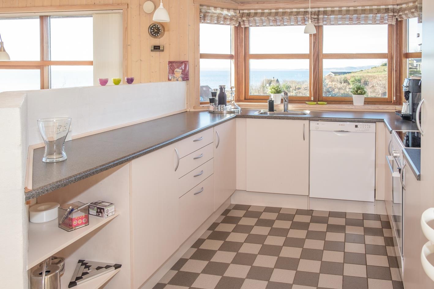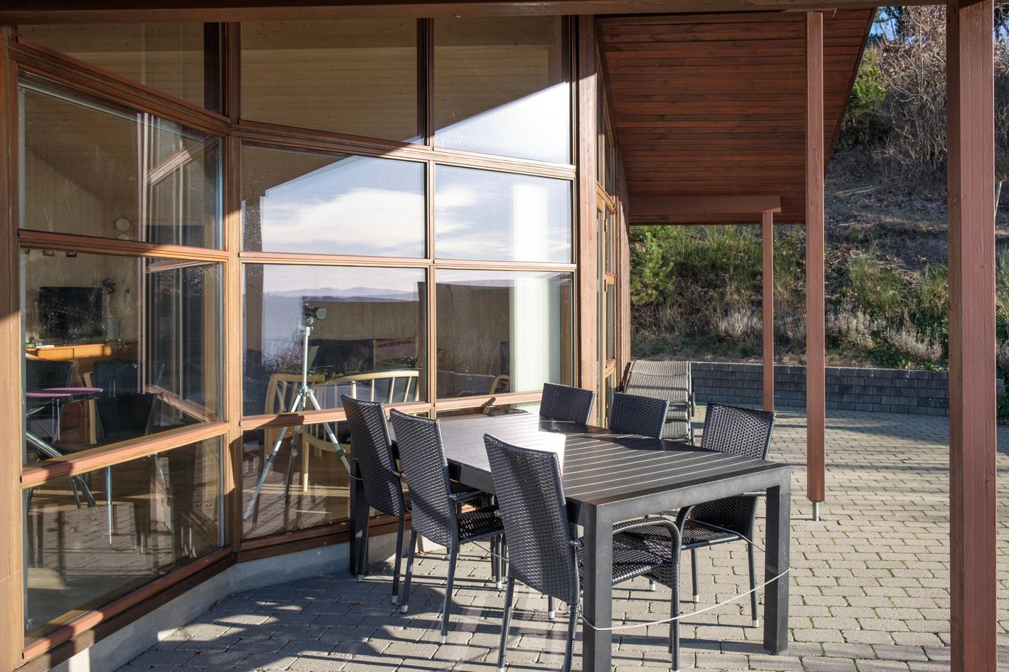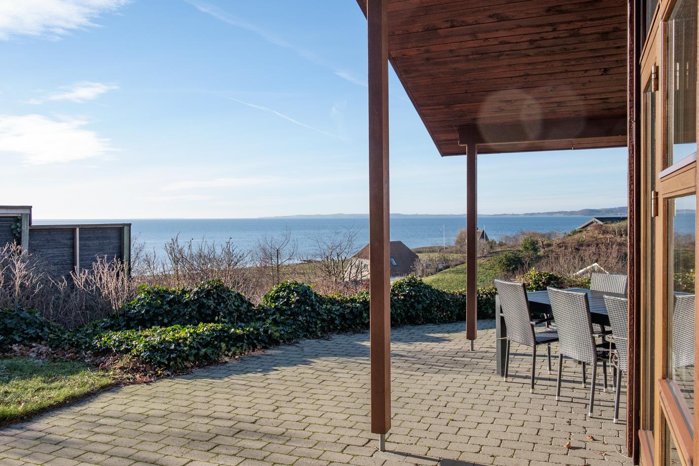 Dieses Ferienhaus liegt mit wunderschöner Panoramaaussicht auf die Ebeltoft Bucht, Helgenæs und Samsø auf einem kupierten Naturgrundstück mit niedrigem Bewuch. Das Haus hat eine offene, teilweise überdachte Terrasse mit Gartenmöbeln und Grill. Geschmackvolles Wohnzimmer mit Meerblick, Holzofen, TV, Stereoanlage mit CD und DVD. Schöne Küche mit Ceranfeld, Kühlschrank mit Gefrierfach, Mikrowelle/Kombiofen und Gescchirrspüler. Badezimmer mit Dusche, Fußbodenheizung, Whirlpool, Sauna und Waschmaschine. Gästetoilette. Die Schlafplätze verteilen sich auf 3 Schlafzimmer; 2 mit Doppelbett und 1 mit 2 Etagenbetten. Hängeboden. Für die kleinen Feriengäste finden Sie Kinderbett, Kinderstuhl und Sandkasten.