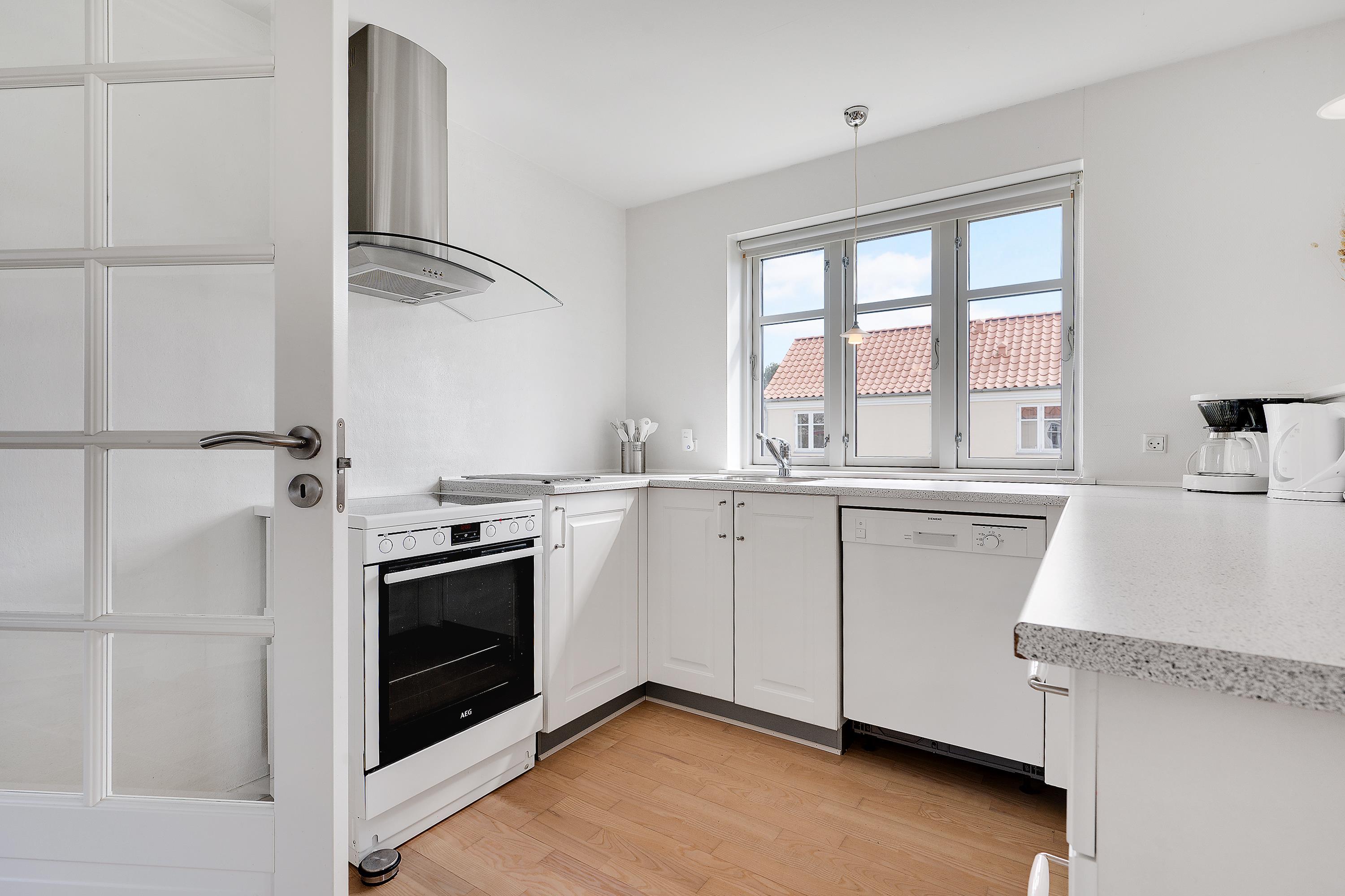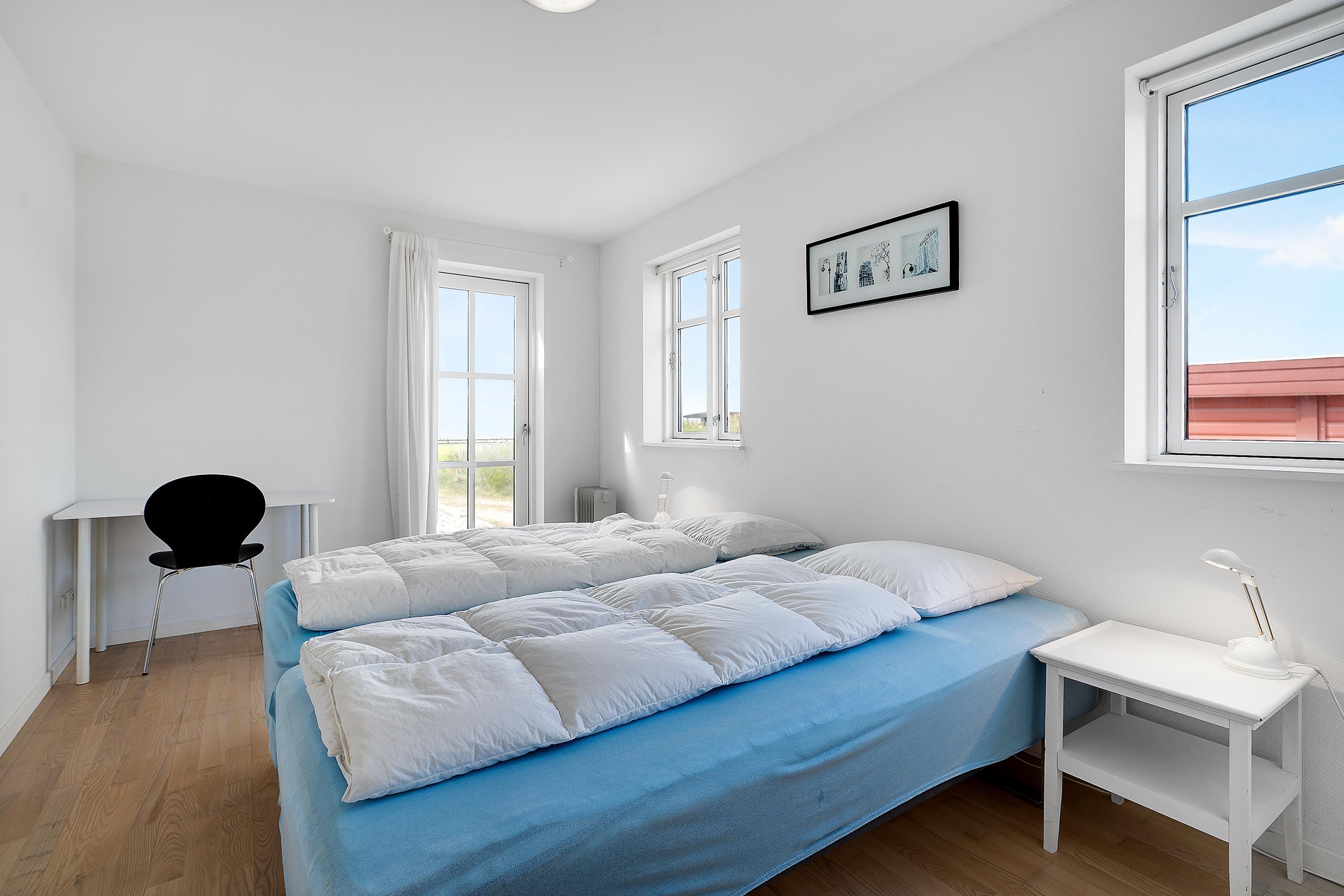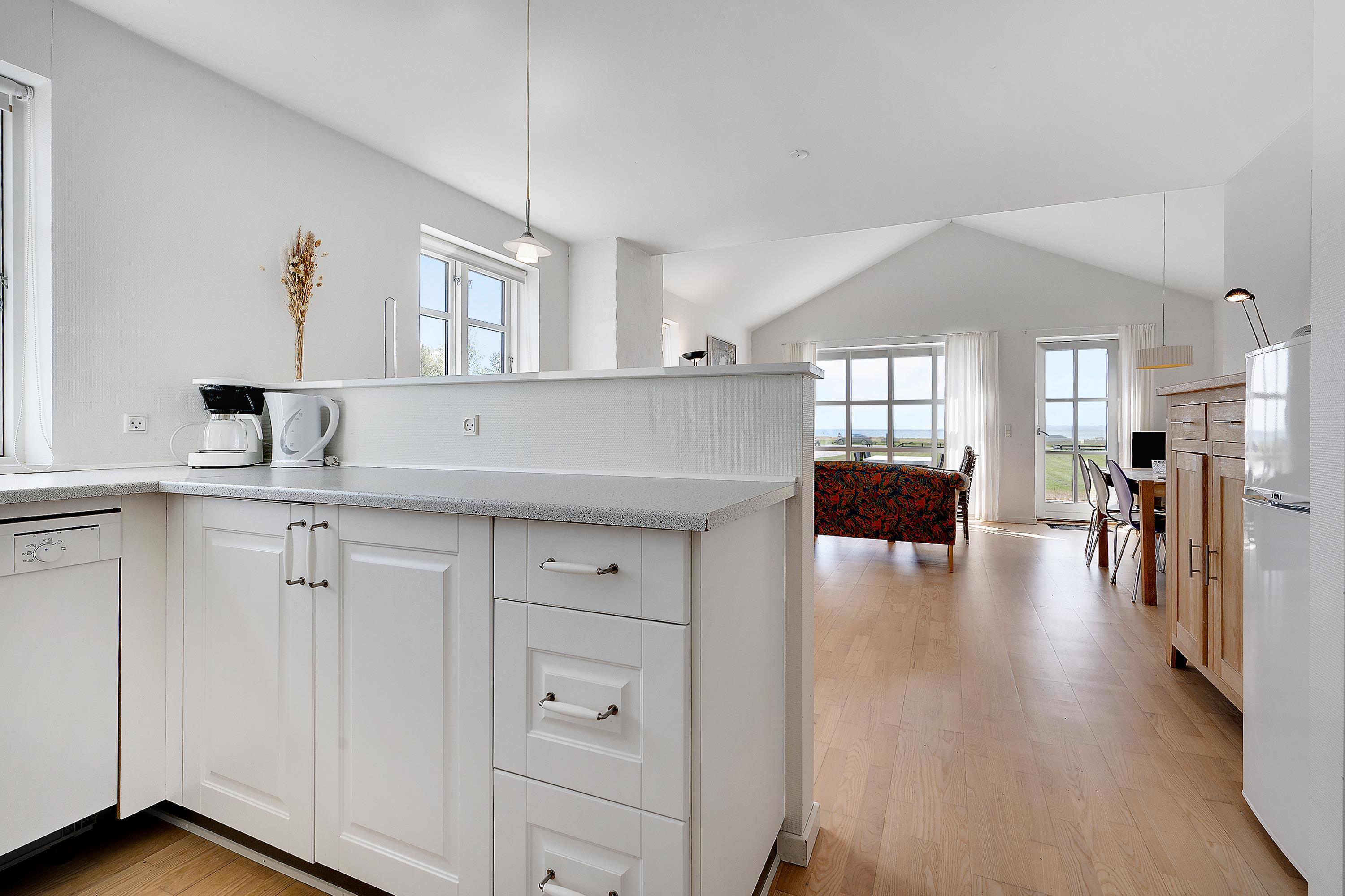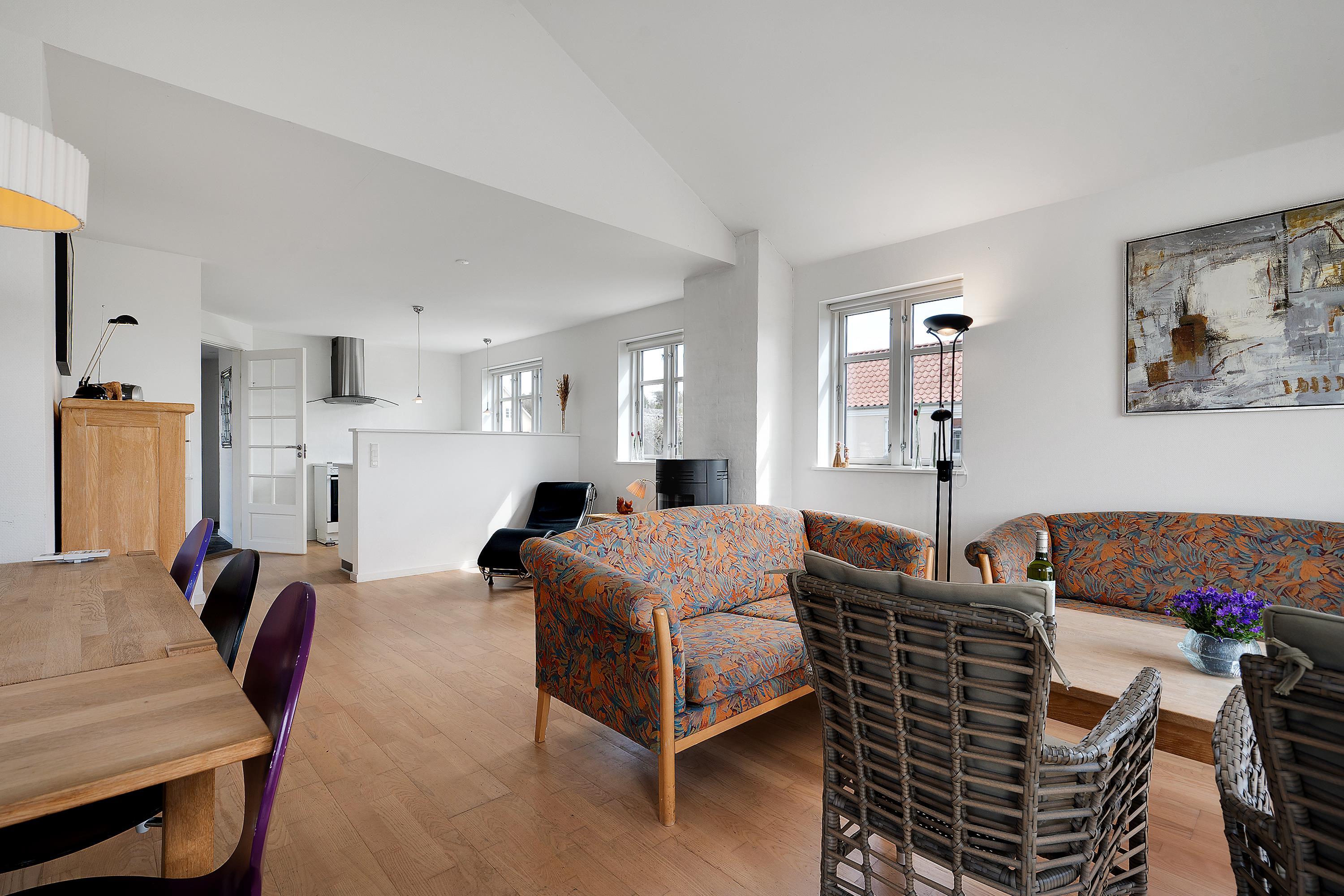 Großes, helles Wohnzimmer mit Dachschrägen und Terrassenzugang. Hier ist ein Holzofen, Sofagarnitur, Essplatz für 6 Personen, Fernseher mit dänischen und deutschen Sendern, CD-Player und Radio. Gute, neuere Küche in offener Verbindung zum Wohnzimmer und ausgestattet mit Herd mit Ceranfeld und Backofen, Kühlschrank mit Gefrierfach, Geschirrspüler und Mikrowelle. Schönes, großes gefliestes Badezimmer mit Dusche, Waschmaschine und Fußbodenheizung. Das Haus bietet Platz für 6 Personen, aufgeteilt in 3 schöne, helle Schlafzimmer - 1 großes Zimmer mit Doppelbett und 2 etwas kleinere Zimmer mit jeweils 2 Einzelbetten. Internet-Zugang vorhanden.