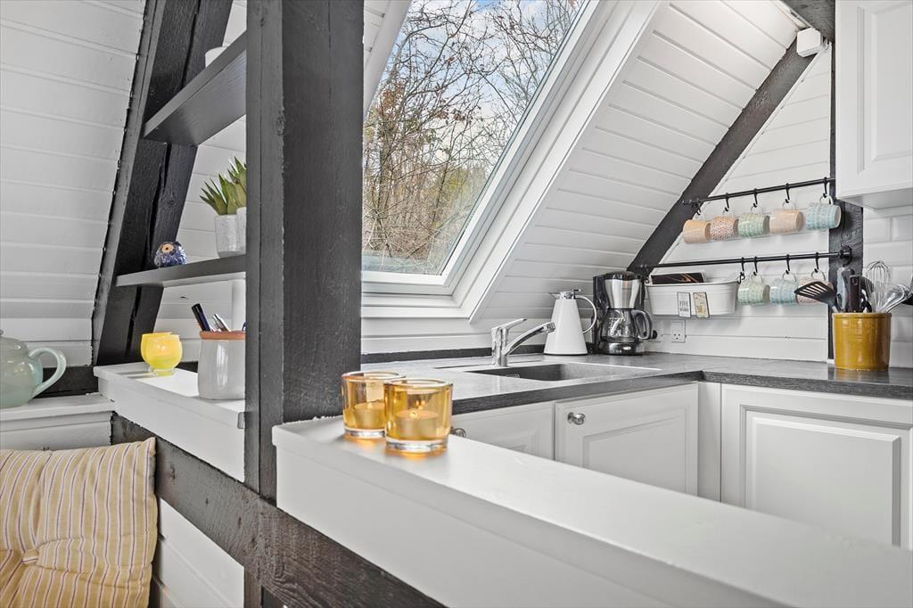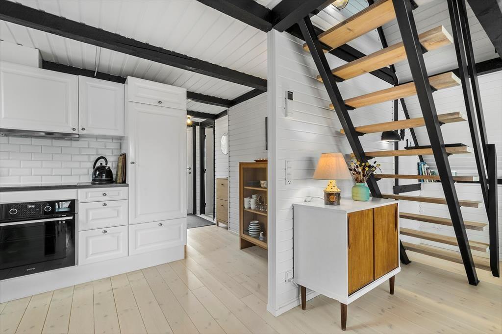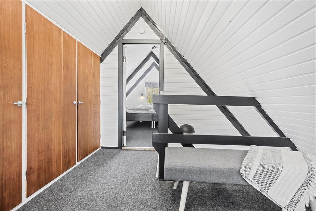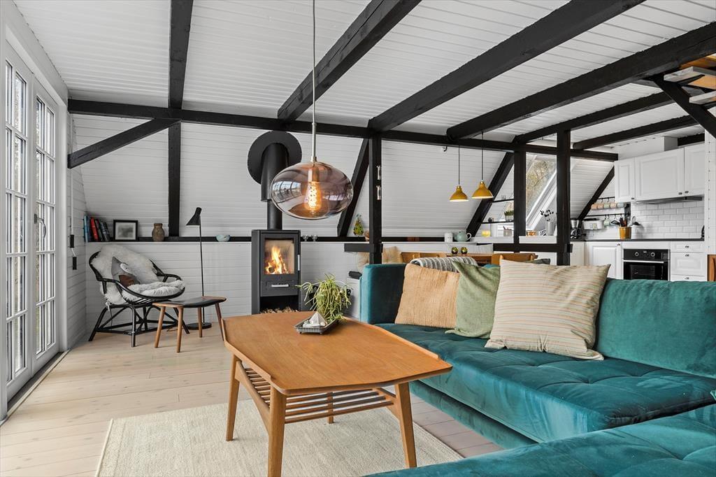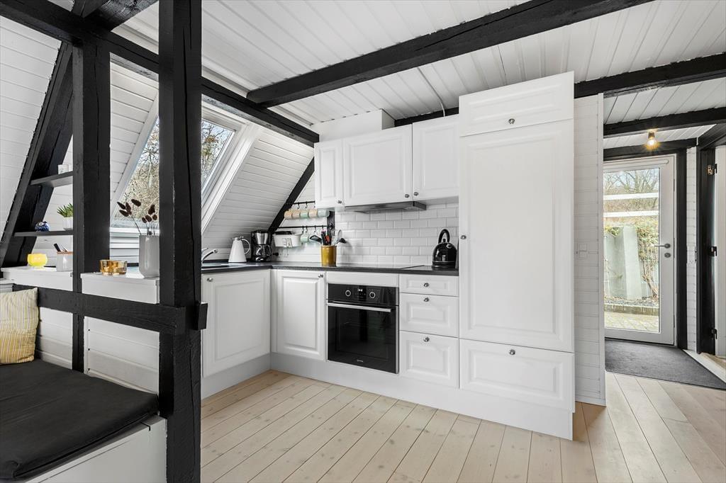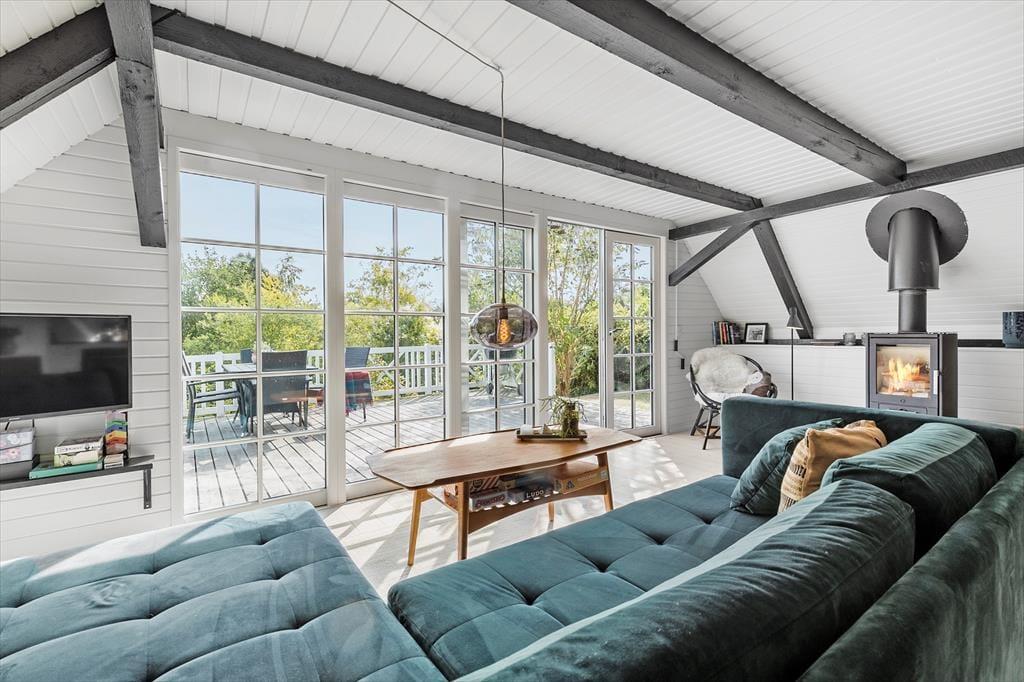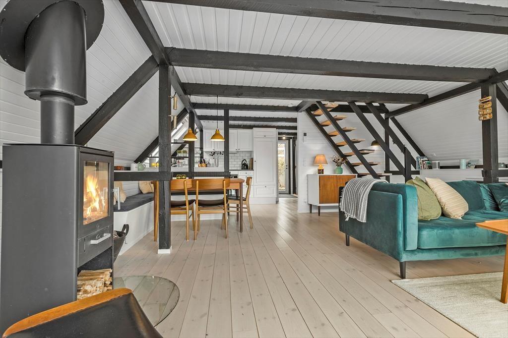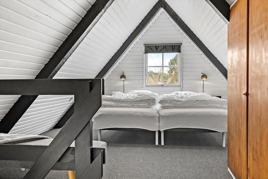 Die Atmosphäre dieses Ferienhauses ist einzigartig - alles wurde bis ins kleinste Detail durchdacht. Das gesamte Mietobjekt wirkt hell und freundlich. Die hübsche, offene Balkenlage trägt maßgeblich zur stimmungsvollen Wohnatmosphäre bei. Die Einrichtung kombiniert gemütliche Elemente mit schlichten, stilreinen Möbelstücken, sodass du dich vom ersten Moment an heimisch und wohl fühlst. Vom Eingangsbereich aus gelangst du in die ansprechende Küche, die lediglich durch eine halbhohe Mauer von der Essecke getrennt ist. An diese schließt wiederum der offene schöne Wohnraum mit einem Kaminofen, einer großen verglasten Giebelfront und einem direkten Zugang zur herrlichen Sonnenterrasse. Im Erdgeschoss erwarten dich darüber hinaus ein gutes Badezimmer mit einer Duschnische und einer Waschmaschine sowie ein reizender Schlafraum mit einem Doppelbett. Vom Wohnraum aus führt dich eine Treppe hinauf in das Obergeschoss, in dem zwei weitere schöne Schlafräume zur Verfügung stehen. Einer dieser Schlafräume beinhaltet ein Doppelbett, der zweite zwei Einzelbetten, die jedoch bei Bedarf zusammengeschoben werden können.