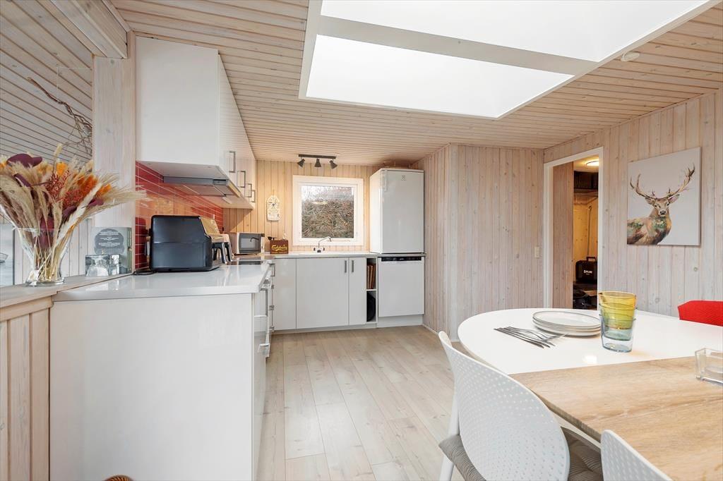 Neben einem hellen, schönen Küchen- und Essbereich, der sich wunderbar für gesellige Essen im Familien- und Freundeskreis anbietet, begrüßt dich im Ferienhaus ein schöner Wohnraum mit verschiedenen Ebenen. In diesem könnt ihr euch mit den zahlreich vorhandenen Spielen vergnügen, gemütlich beisammensitzen und dabei die Aussicht in den Garten genießen. Die drei Schlafräume des Haupthauses bieten Komfort und Privatsphäre. Im Nebengebäude stehen darüber hinaus zwei Schlafplätze zur Verfügung, die sich besonders für diejenigen eigenen, die Wert auf Ruhe legen und sich gern etwas zurückziehen. Das Herzstück des Hauses ist die Küche. Du kannst dir sicher leicht vorstellen, wie du hier in Ruhe das Frühstück für deine Lieben vorbereitest oder wie ihr gemeinsam ein köstliches Abendessen kreiert. Zusammenfassend eignet sich dieses Ferienhaus hervorragend für einen Urlaub voller Entspannung und Gemütlichkeit.