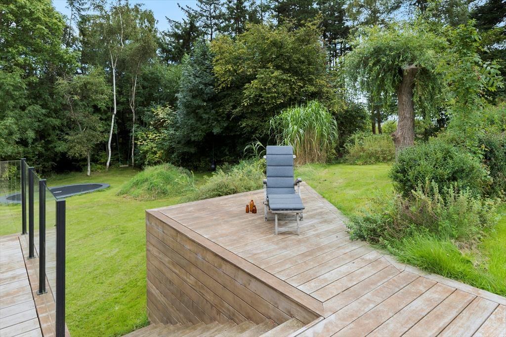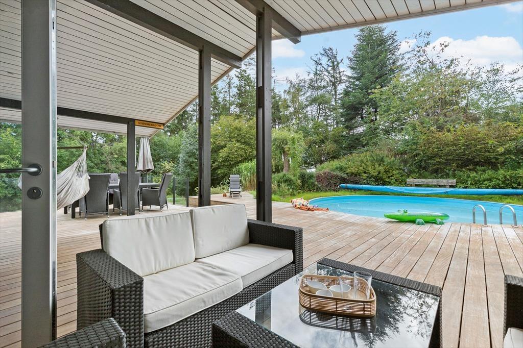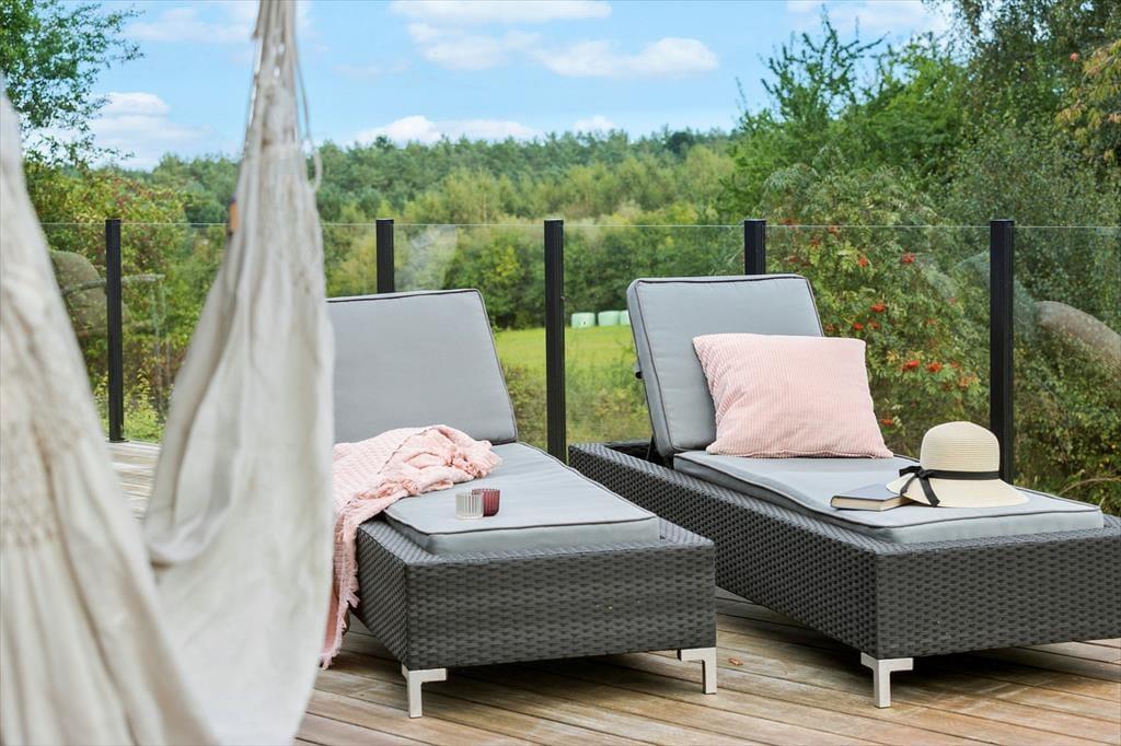 Dein Ferienhausgrundstück wirkt wie eine wunderschöne, private Oase. Die tollen Terrassen bestechen mit überdachten und offenen Bereichen, sodass du zu jeder Zeit ein sonniges, oder auf Wunsch auch schattiges Plätzchen finden wirst. Kühle Erfrischungen und maximalen Badespaß garantiert der Outdoor-Swimmingpool, der direkt an die große Holzterrasse vor dem Wohnraum schließt. Morgens lässt du dich sicher gern mit einem frischen Kaffee im Freien nieder und genießt die Aussicht ins Grüne. Nicht selten beobachtest du zu dieser Zeit das ein oder andere Reh. Die Terrassen bieten beste Voraussetzungen für stimmungsvolle essen in gemütlicher Runde. Deine Kinder werden sich über die Rasenflächen freuen, die zum stundenlangen Spielen und Umhertollen einladen.