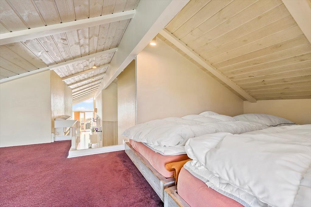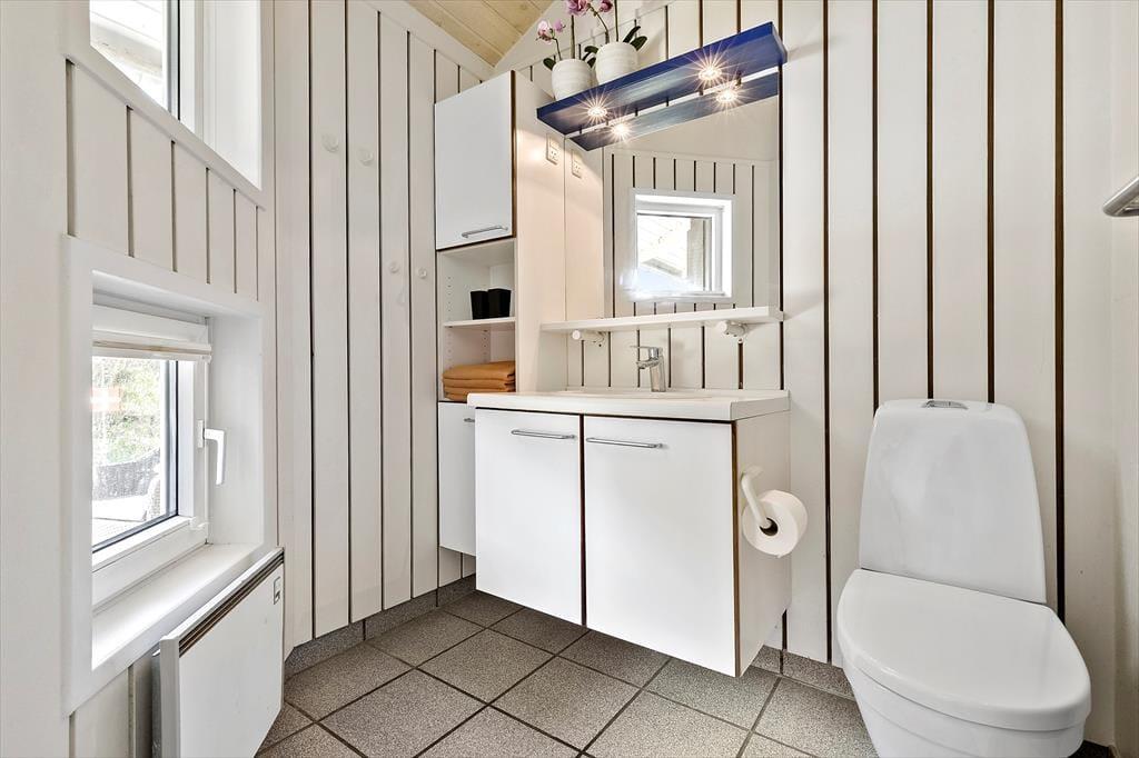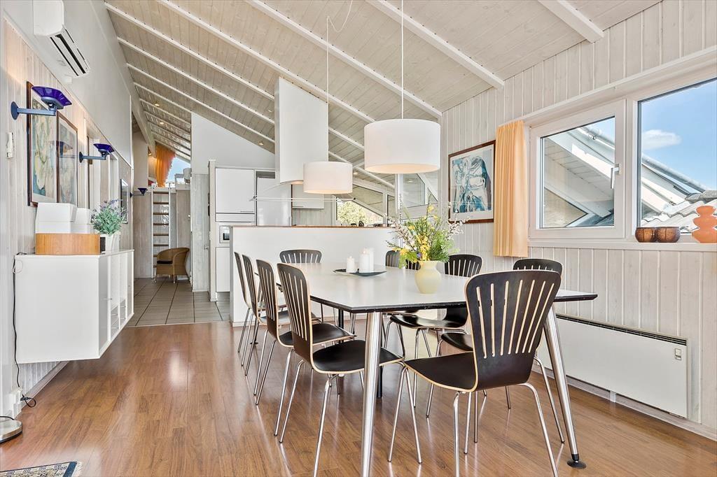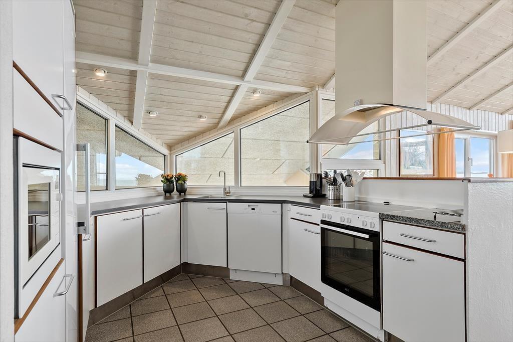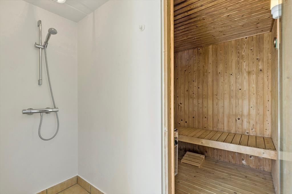 Dieses tolle, hoch gelegene Poolhaus befindet sich an einer der besten Adressen Ebeltofts und begeistert mit einem 180°-Blick über die Ebeltoft Vig. Die untere Etage ist einem Wellnessbereich mit einem 26 m² großen Swimmingpool inklusive Gegenstromanlage und Rutsche gewidmet. Zudem stehen Ihnen hier ein sehr großer Whirlpool, eine Dusche und eine direkt zugängliche Sauna zur Verfügung. Große und kleine Urlauber dürfen sich gleichermaßen auf vergnügte erholsame Stunden freuen. In der oberen Etage begrüßen Sie ein großer Wohnraum und eine offen integrierte Küche. Vielen gemeinsamen Stunden steht daher nichts im Wege. Der Wohnraum ist gemütlich und qualitativ hochwertig eingerichtet. Für ein Maximum an Ferienhausstimmung sorgt der Kaminofen. Von Küche und Essbereich blicken Sie hinunter in den Poolraum und haben Ihre badenden Kinder stets im Auge. Die Schlafplätze verteilen sich auf fünf Zimmer und auf einen großen Schlafboden, der sich aufgrund der niedrigen Deckenhöhe insbesondere für Kinder eignet. Auf dem Schlafboden steht ein zusätzlicher Fernseher mit Parabolempfang bereit. Das Haus verfügt über zwei Badezimmer und eine zusätzliche Dusche im Poolraum. Beide Bäder sind mit einer Fußbodenheizung versehen.