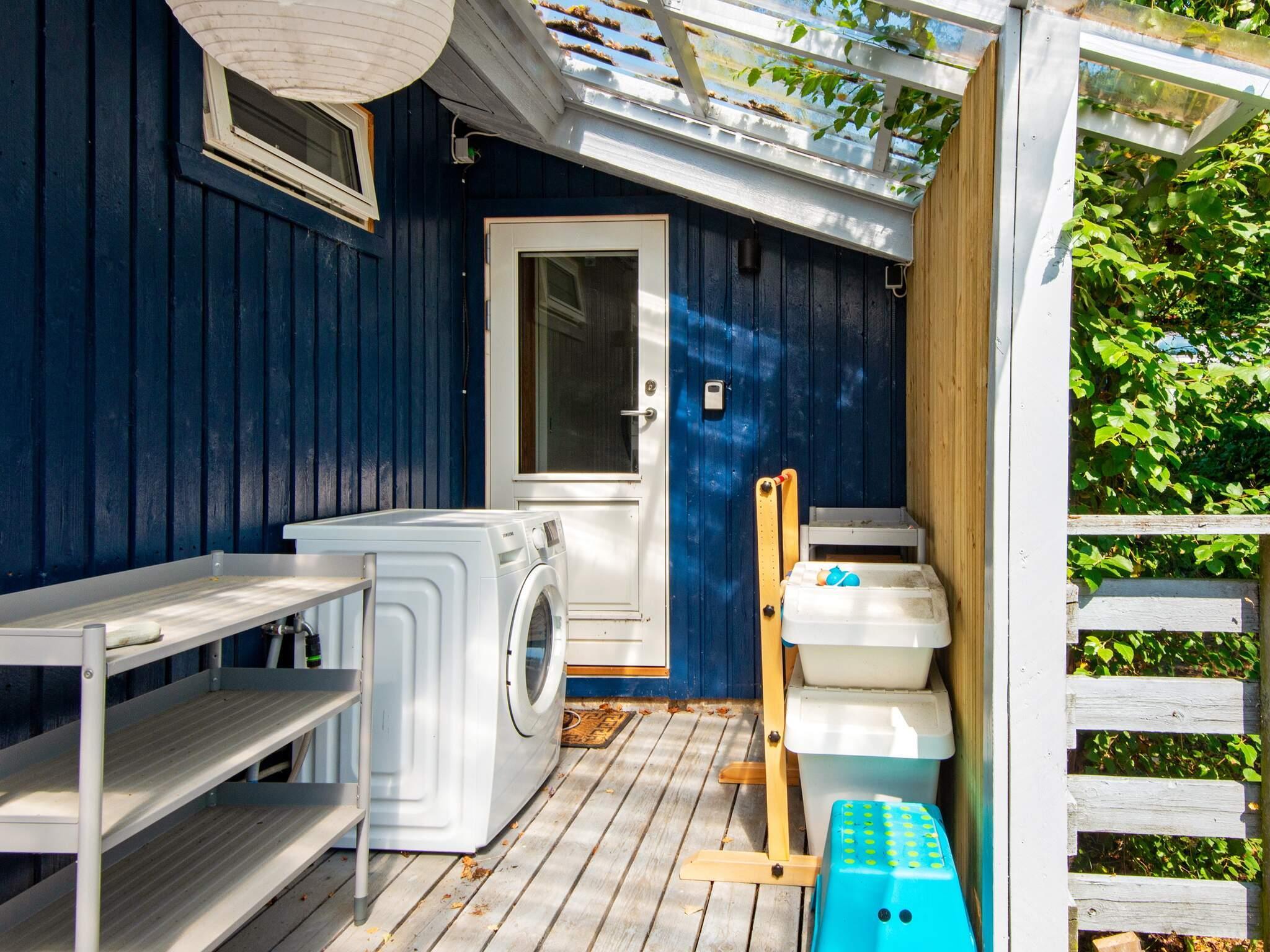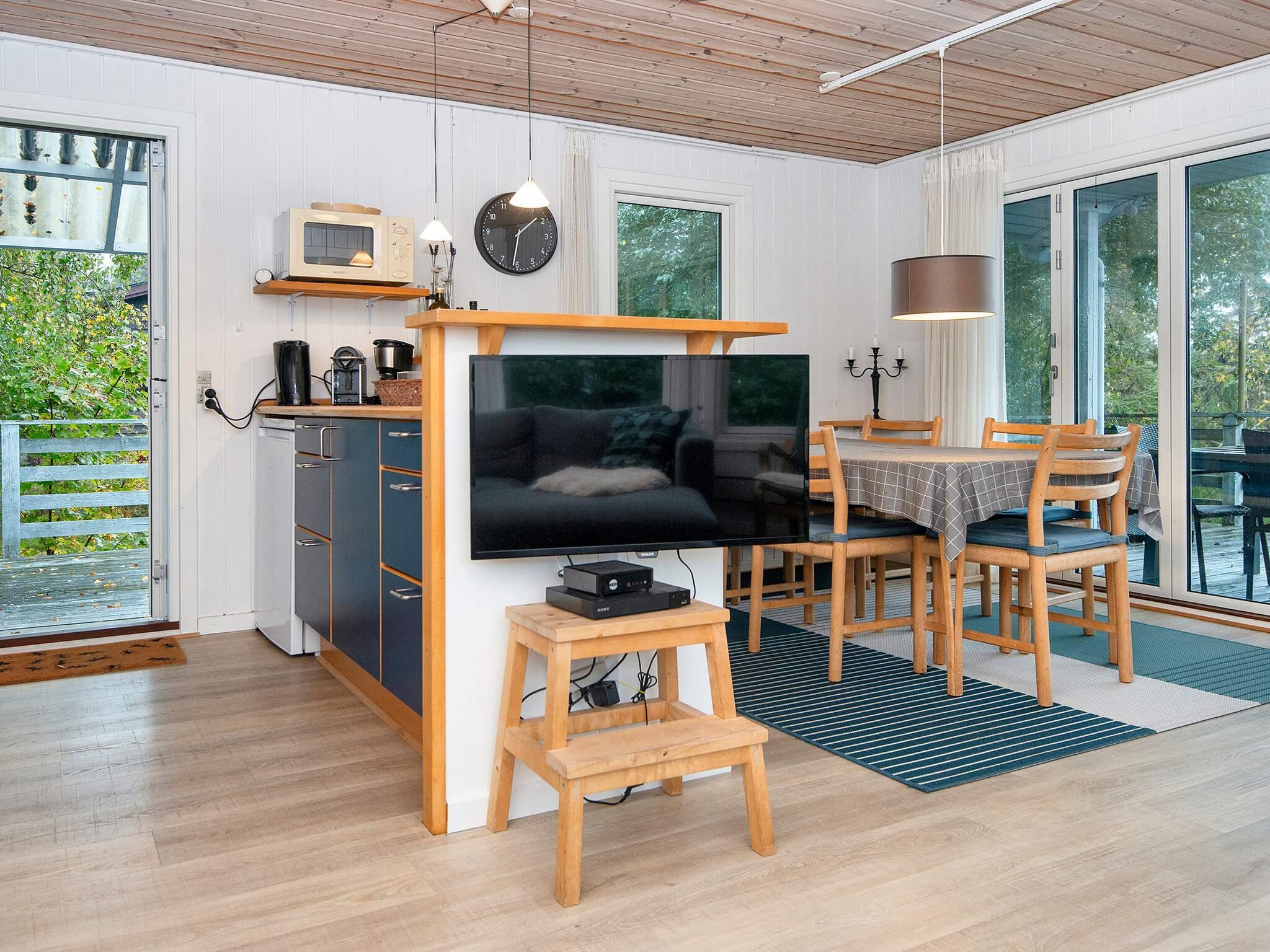 Das Ferienhaus hat eine gute Einrichtung mit einem offenen Küchen-/Wohnbereich für das Familienleben. Geheizt wird ggf. mittels Elektroheizung und Holzofen. Die Waschmaschine ist nebenan im Schuppen untergebracht.