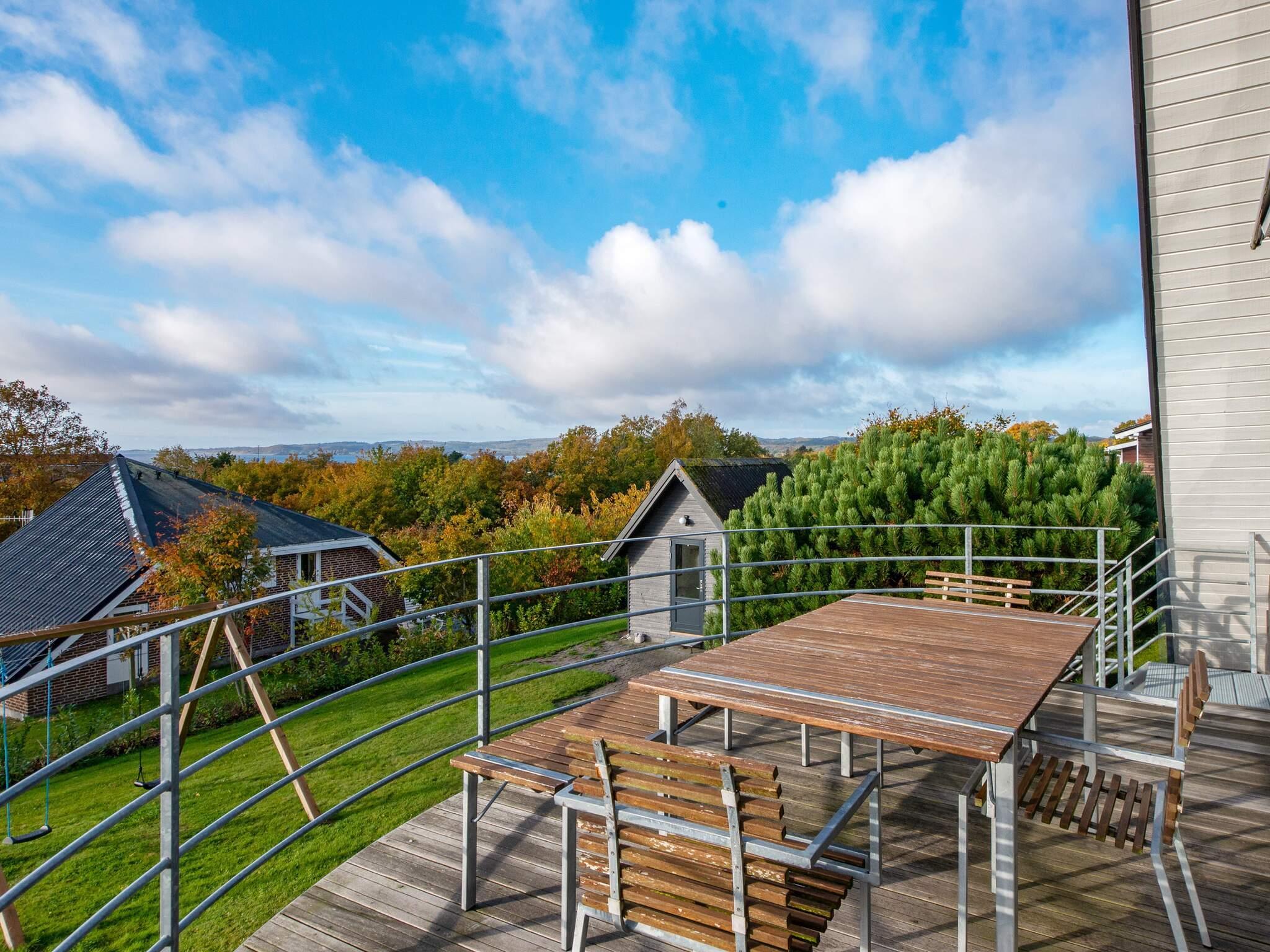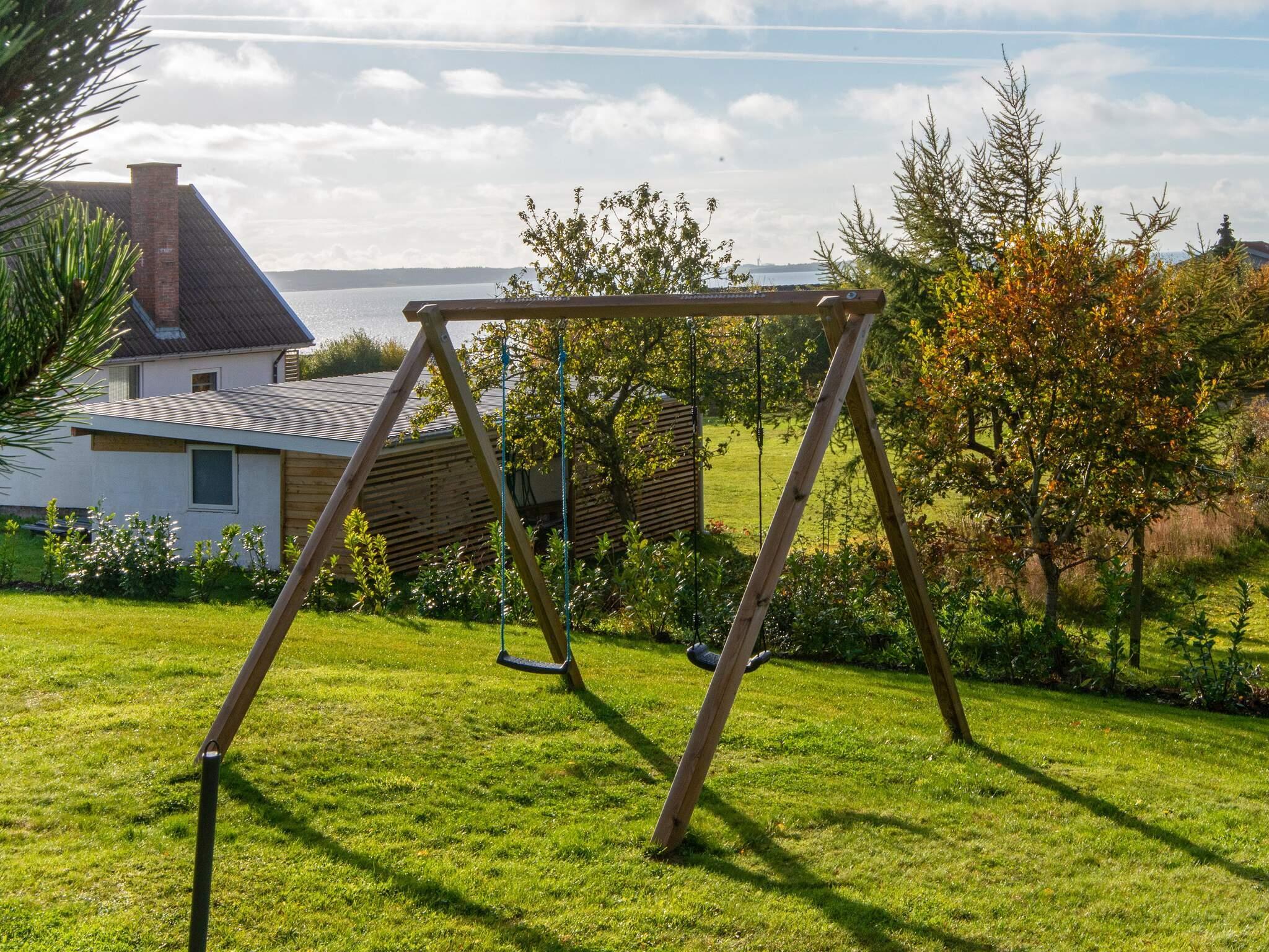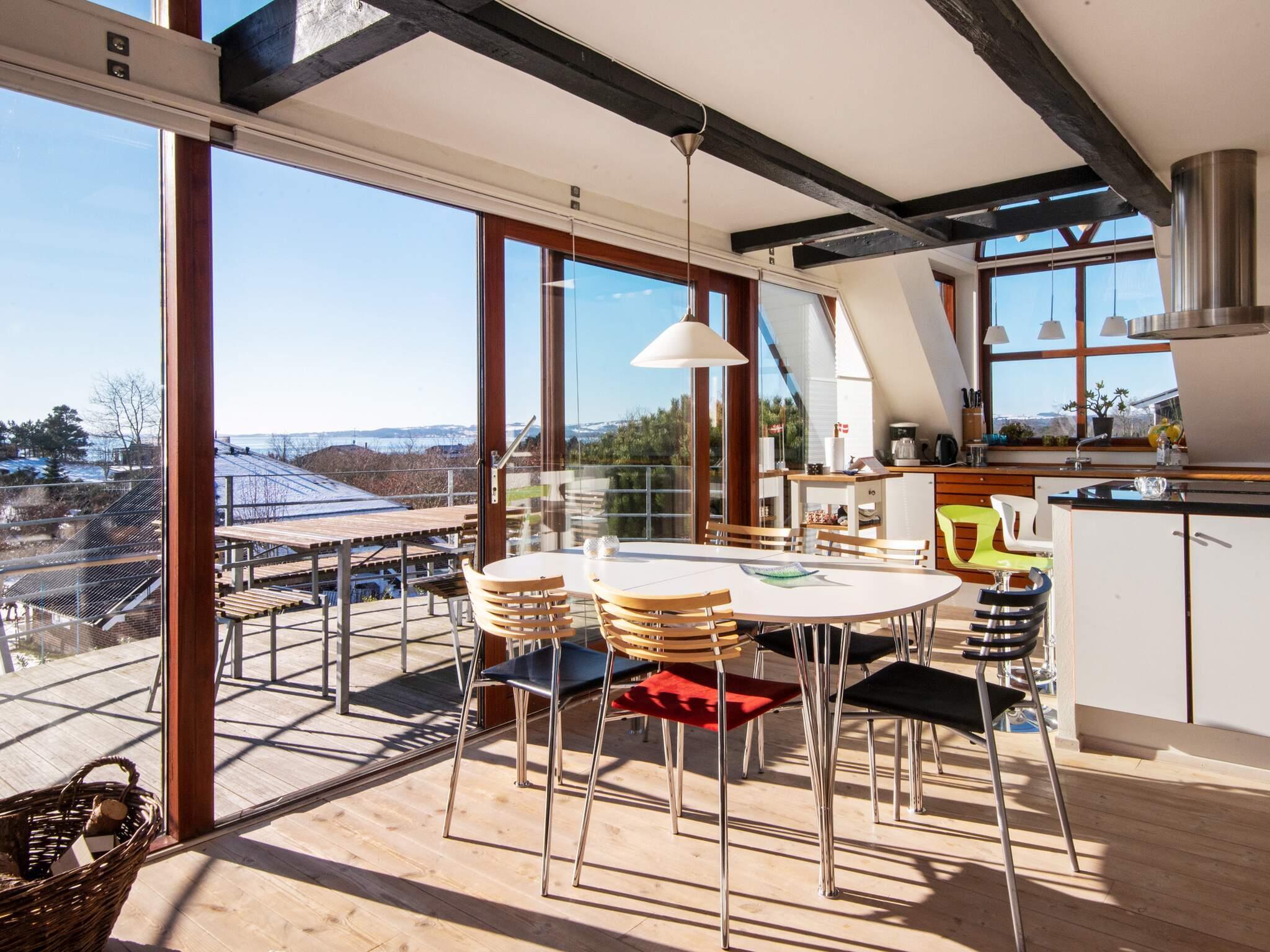 Die offen in den Wohnbereich integrierte Küche ist ein Plus für das Familienleben. Von dort gelangt man auch in die obere Etage, wo die Aussicht noch besser ist. Zum Haus gehört auch eine Holzveranda, wo man gut abgeschirmt Platz nehmen und sich entspannen kann. Kinder freuen sich bestimmt über die Schaukel auf dem Grundstück. An Sommerabenden kann im Garten gegrillt werden.