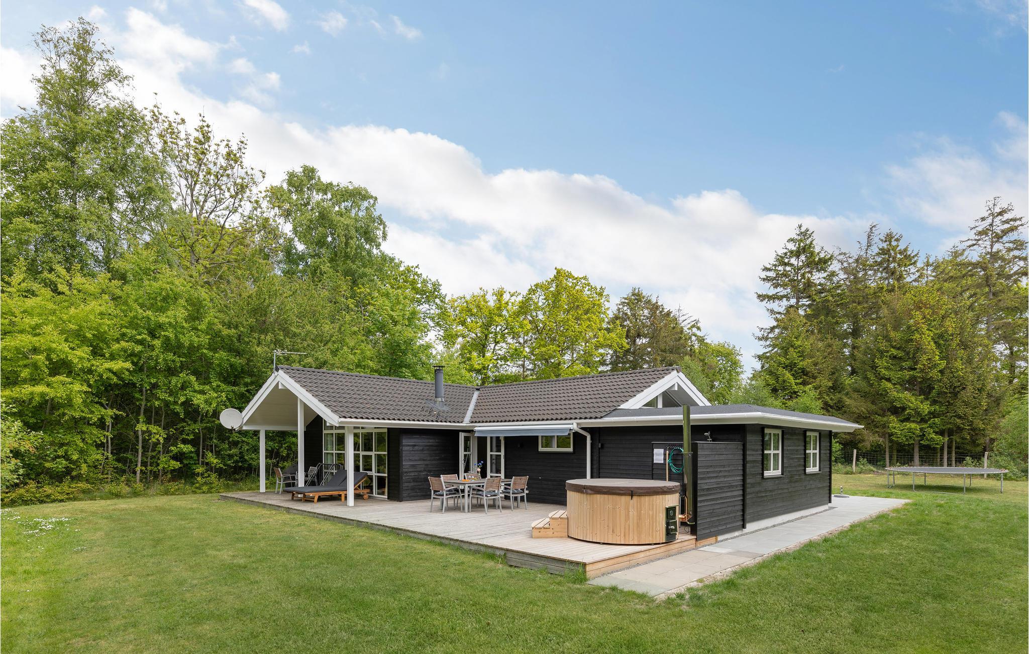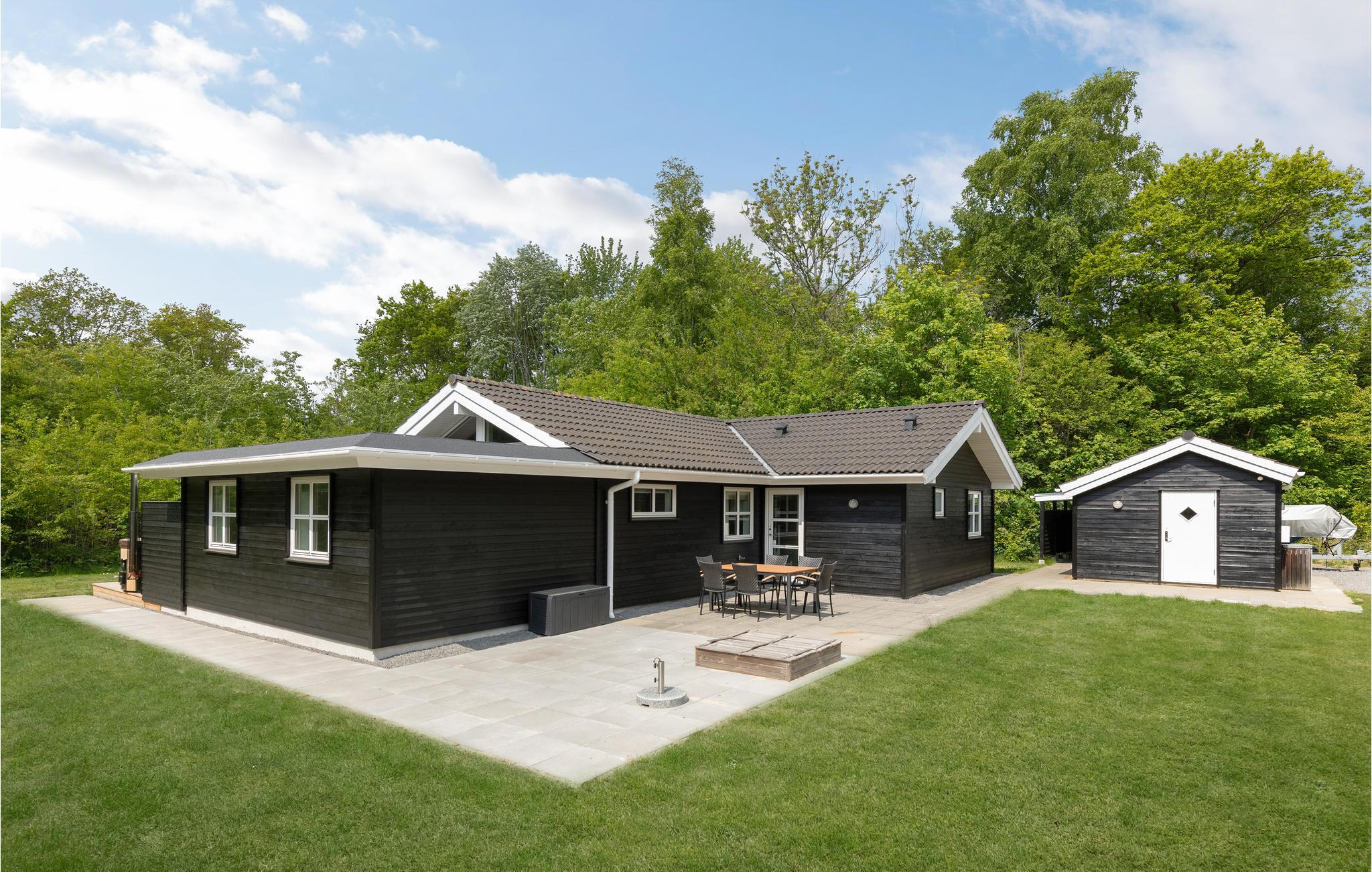 Luxuriöses Holzferienhaus bei Hasle Lystskov mit Naturgrundstück, Terrasse und Wellnessbad für erholsame Urlaubstage.