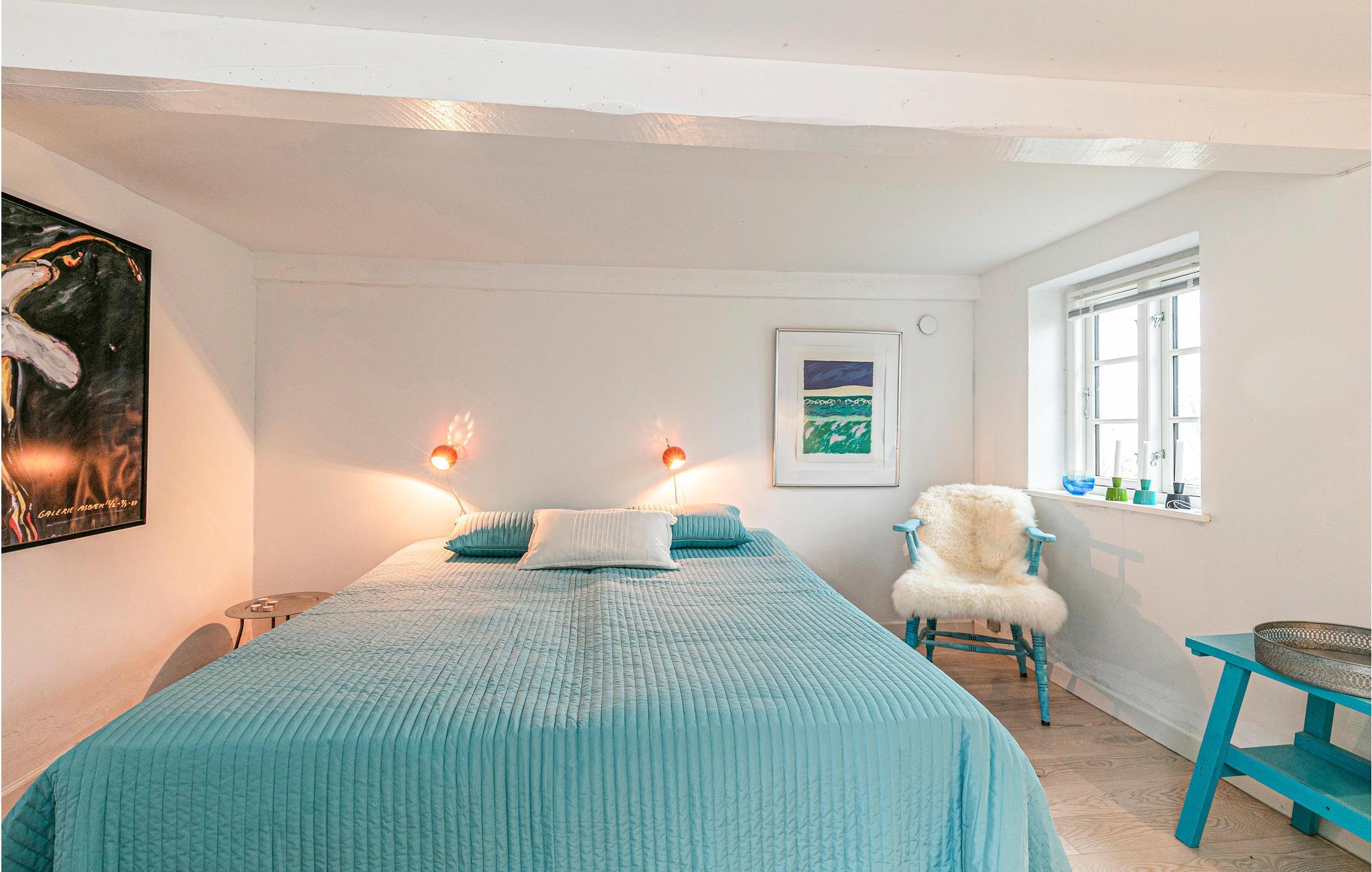 In dem Nebengebäude befindet sich ein weiteres Schlafzimmer in maritimen Farbtönen.