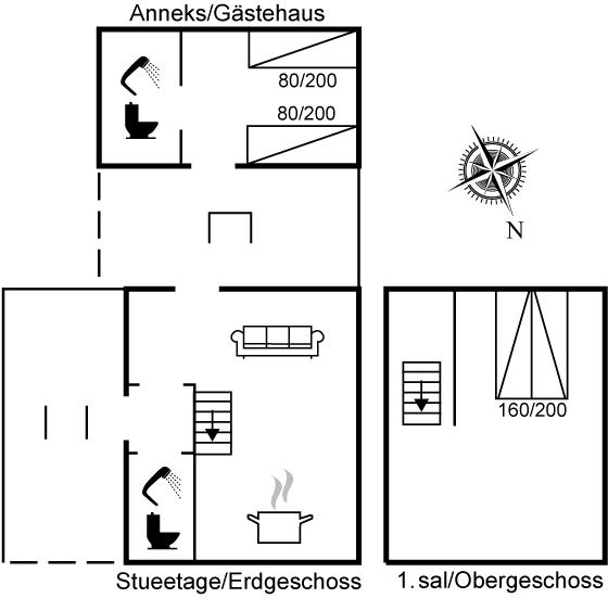 Die Schlafplätze verteilen sich auf 2 Schlafräume. 2 Schlafplätze in einem Doppelbett. 2 Schlafplätze in Einzelbetten. 2 von diesen Schlafplätzen befinden sich im Gästehaus. Fußbodenheizung im Gästehaus.