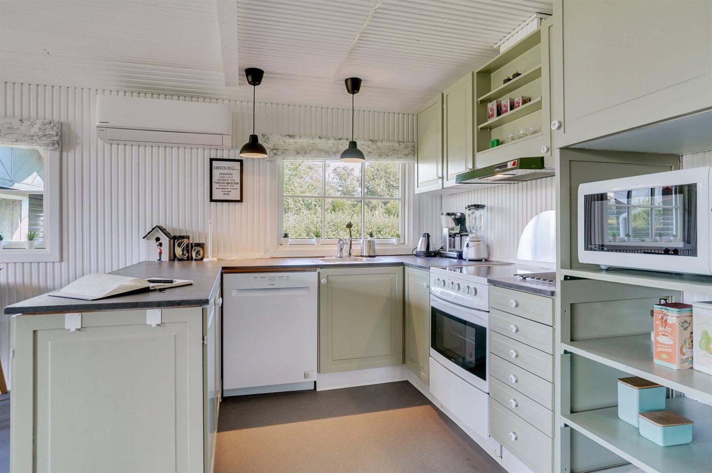 Die Küche ist mit Kühlschrank ausgestattet. Außerdem gibt es 4 Keramik-Kochfelder, Umluftofen, Mikrowelle sowie Geschirrspüler.
