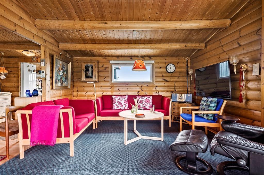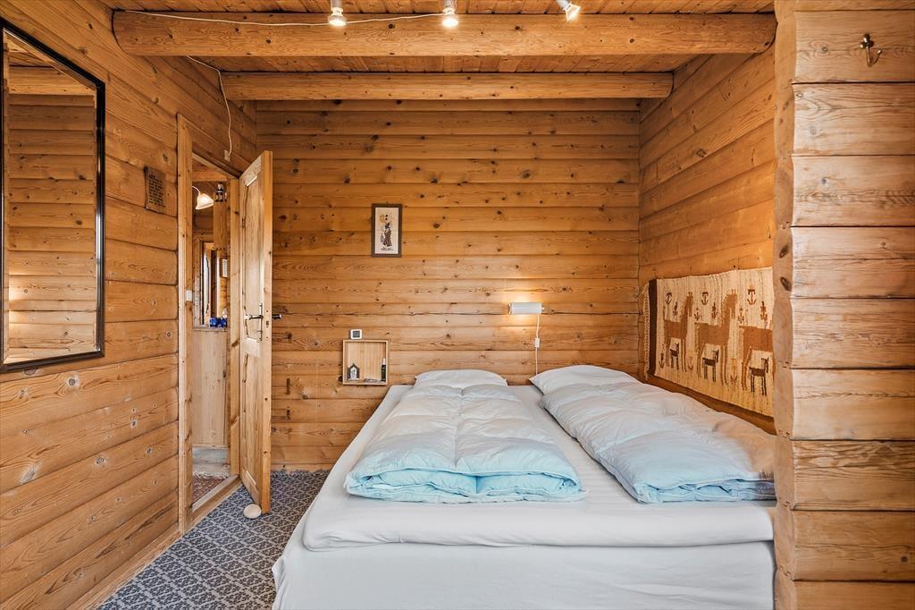 Das schöne Blockhaus ist der Inbegriff von Charme und Gemütlichkeit. Alle Räume verwöhnen mit einem ansprechenden Ausblick auf die umliegende Natur. Besonders beeindrucken wird Sie der Blick, den Sie am Esstisch im Wohnraum erwartet. Hier offenbart eine bodentiefe Fensterpartie eine wunderschöne Panoramaaussicht, die Ihre Essen in gemütlicher Runde prachtvoll untermalt. Für behagliche Wärme sorgt derweil der neben dem Essplatz platzierte Kaminofen. Im Wohnraum laden Polstersitzmöbel zu einem unterhaltsamen Spieleabend und zu entspannten Stunden vor dem Fernseher ein. Der Wohnraum ist offen mit der gut ausgestatteten, geräumigen Küche verbunden, in der Sie ohne Weiteres mit mehreren Personen die Mahlzeiten zubereiten können. Die beiden Schlafzimmer beherbergen zusammen maximal vier übernachtende Personen. Das Badezimmer ist mit einer Duschnische versehen. Im Eingangsbereich steht ausreichend Platz für Schuhe und Jacken zur Verfügung.