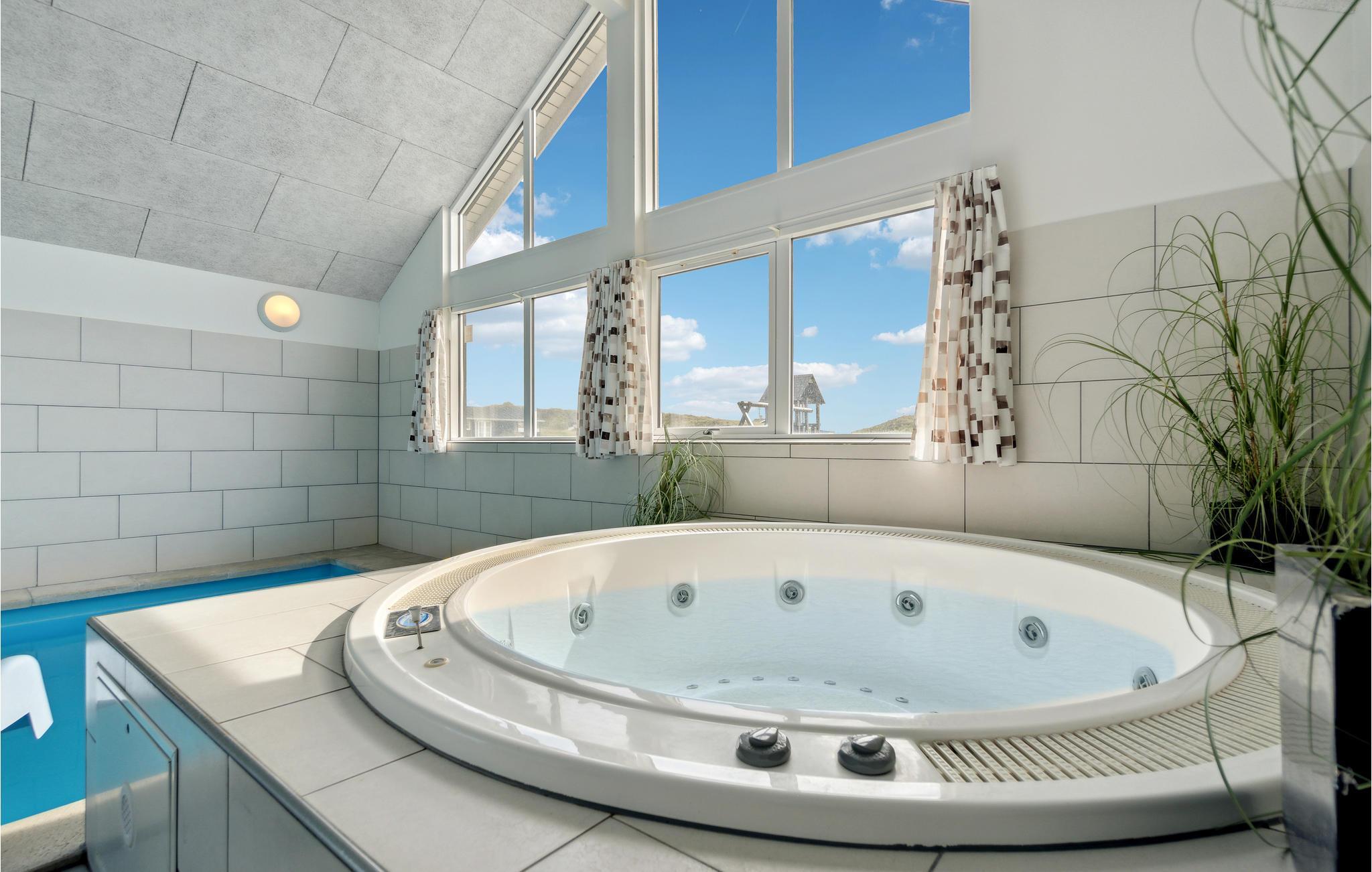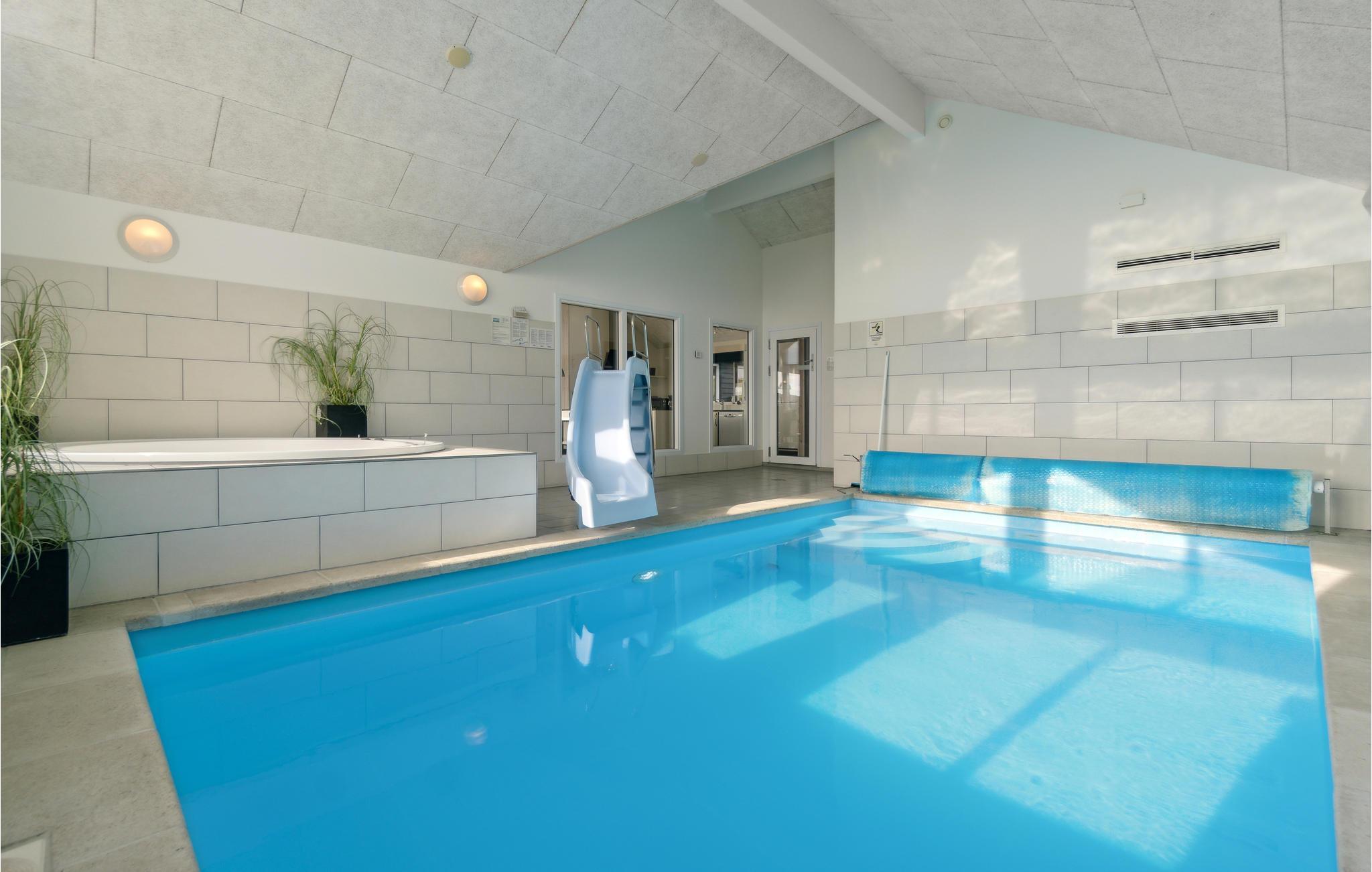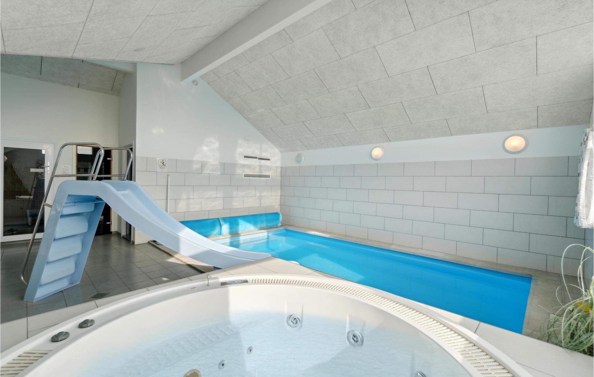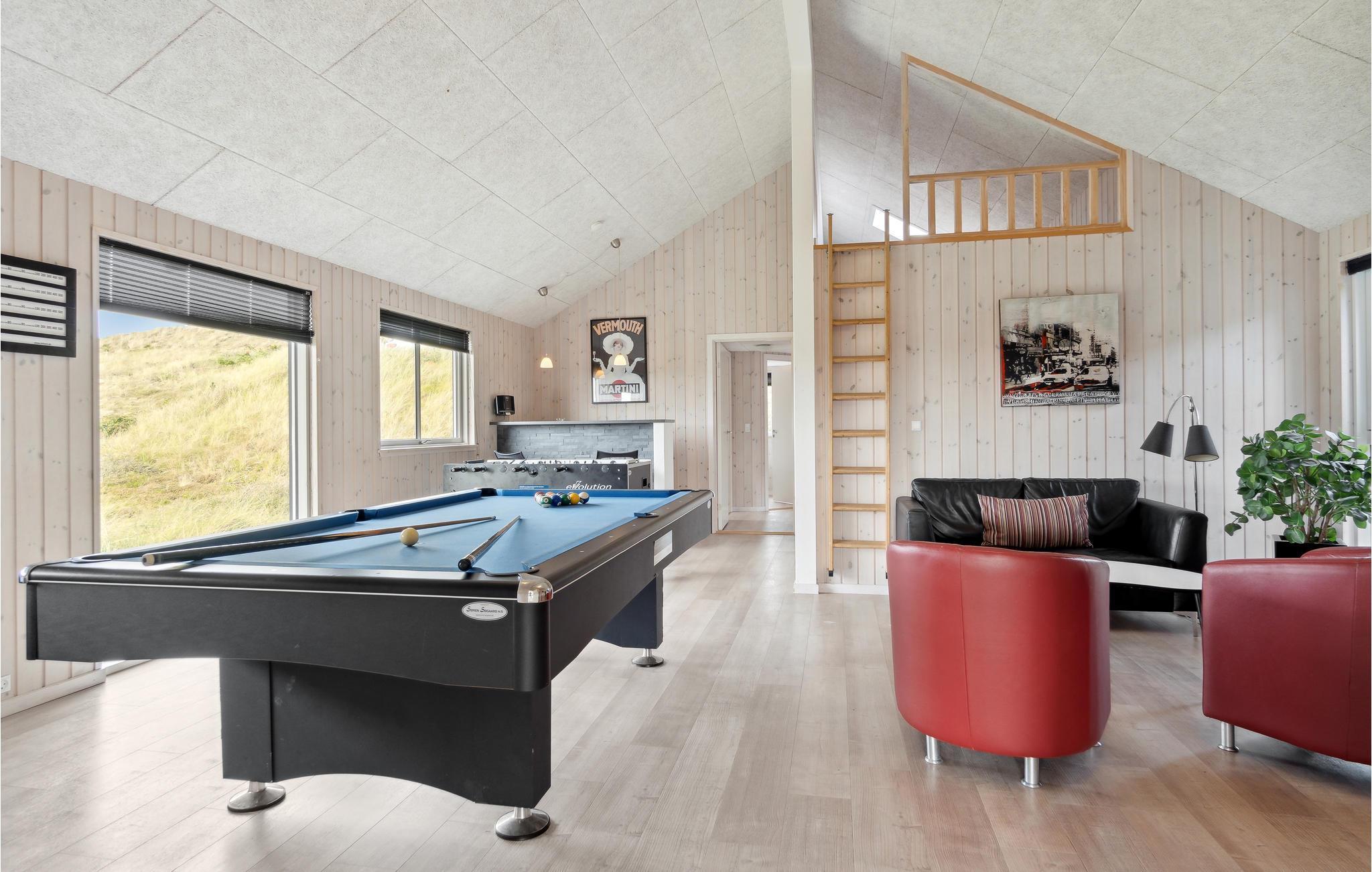 Hier haben Sie die Gelegenheit ein prächtiges Poolhaus ind der schönen Natur von Bjerregård zu erleben. Sie sind in der Nähe von der Nordsee und Gelegenheiten Ihren Urlaub aktiv zu gestalten. Ein perfekter Rahmen für Ferien zu jeder Jahreszeit. Im Haus erwartet Sie all jener Komfort, den Sie erwarten. Der große offene Schlafboden wird sicher Ihren Kindern gefallen. Die Decken des Hauses sind schallisoliert, er herrscht eine gute Akustik. Auf Luxus wurde vor allem im Poolraum gedacht, es sind Rutsche ein großer Whirlpool und eine große Sauna vorhanden. Des Weiteren gibt es im Haus: Tischtennis, Darts, Tischfußball, PS3 und Nintendo Wii. Die Küche ist mit 2 Geschirrspülern, 2 Herden und Gefriereinheiten. Der dänische Sommer kann in vollen Zügen auf der teilweise überdachten Terrasse genossen werden, währen Ihre Kinder schaukeln oder im Sandkasten spielen.