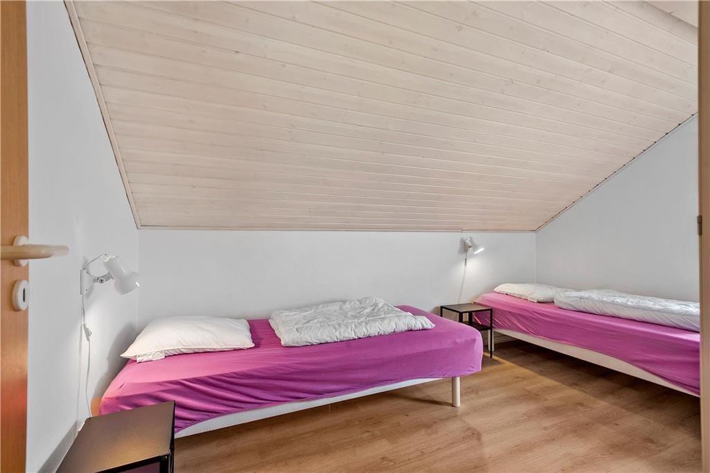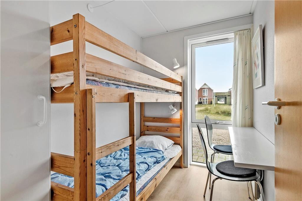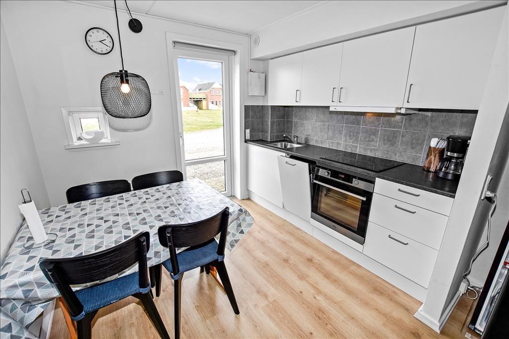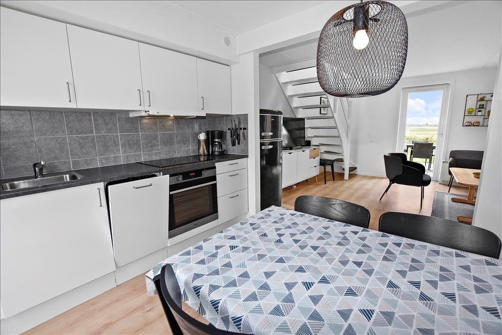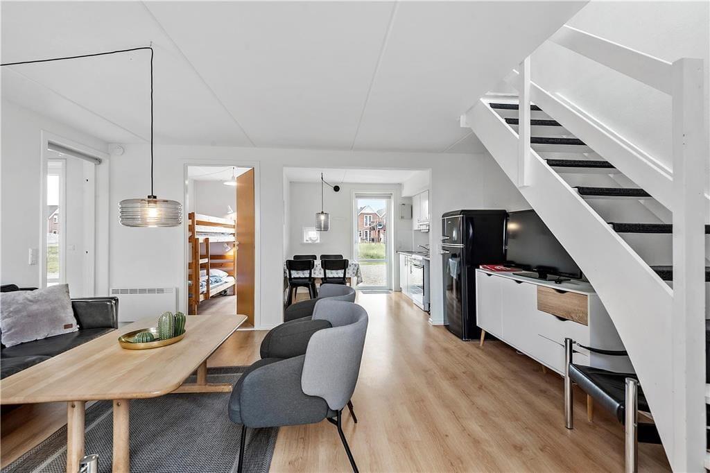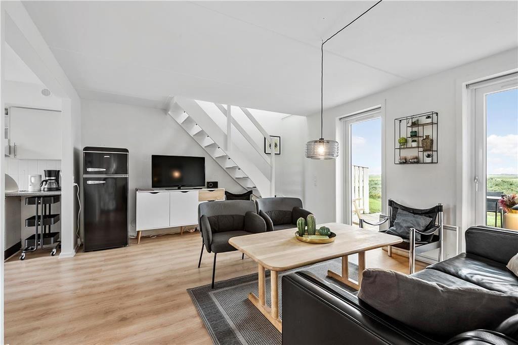 Das Haus bietet eine ausgezeichnete Aufteilung auf zwei Etagen, so dass man gut Platz für bis zu 6 Personen hat. Es gibt 3 Schlafzimmer: Zwei befinden sich im 1. Stock, wo sich auch das Badezimmer befindet. Das dritte Schlafzimmer, das mit Doppelstockbetten ausgestattet ist, nimmt einen kleineren Teil des Grundrisses ein, welcher ansonsten dem hellen und funktionalen Wohnzimmer mit integrierter Küche gewidmet ist. In der Küche steht ein Esstisch, während das Wohnzimmer ein komfortables Sofaarrangement mit 2 Sitzsäcken bietet. Alles in allem ist es ein herrlicher Raum, um zusammen Zeit zu verbringen. Egal ob du ein Brettspiel am Esstisch spielst, einen Film guckst und es dir auf dem Sofa gemütlich machst oder die Aussicht durch die großen Fenster genießt.