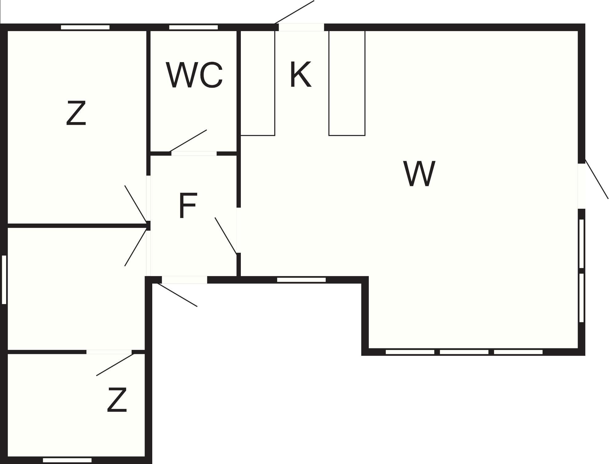 Vom Eingang betreten Sie eine Diele mit Platz für Oberbekleidung und Zugang zu einem Zimmer mit Schlafsofa und Schreibtisch sowie evtl. Platz für ein Kinderbett. Zudem ein Schlafzimmer mit Doppelbett sowie ein Bad, Küche und Wohnzimmer im Haus. Ältere, gepflegte Küche in Verbindung mit Essbereich. Wohnzimmer mit Zugang zur überdachten Terrasse. Insgesamt 2 Schlafzimmer im Haus und ein 3. im separaten Annex.