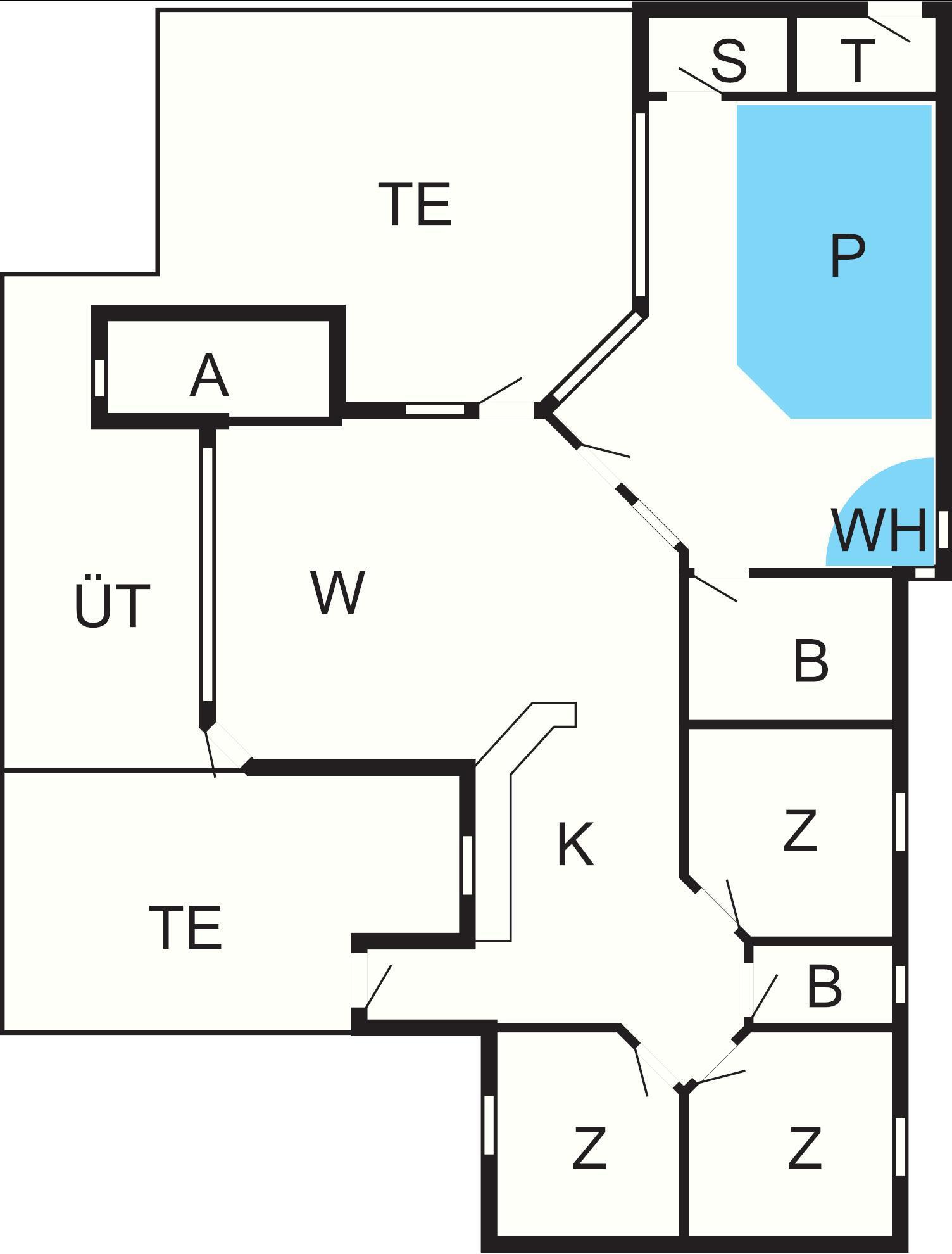 Vom Küchen-/Wohnbereich ist der Poolbereich einsehbar, besonders praktisch, wenn sich dort größere Kinder länger allein weiter baden möchten. Vom Wohnbereich hat man auch Zutritt zur sowohl überdachten als auch offenen Terrassenfläche.