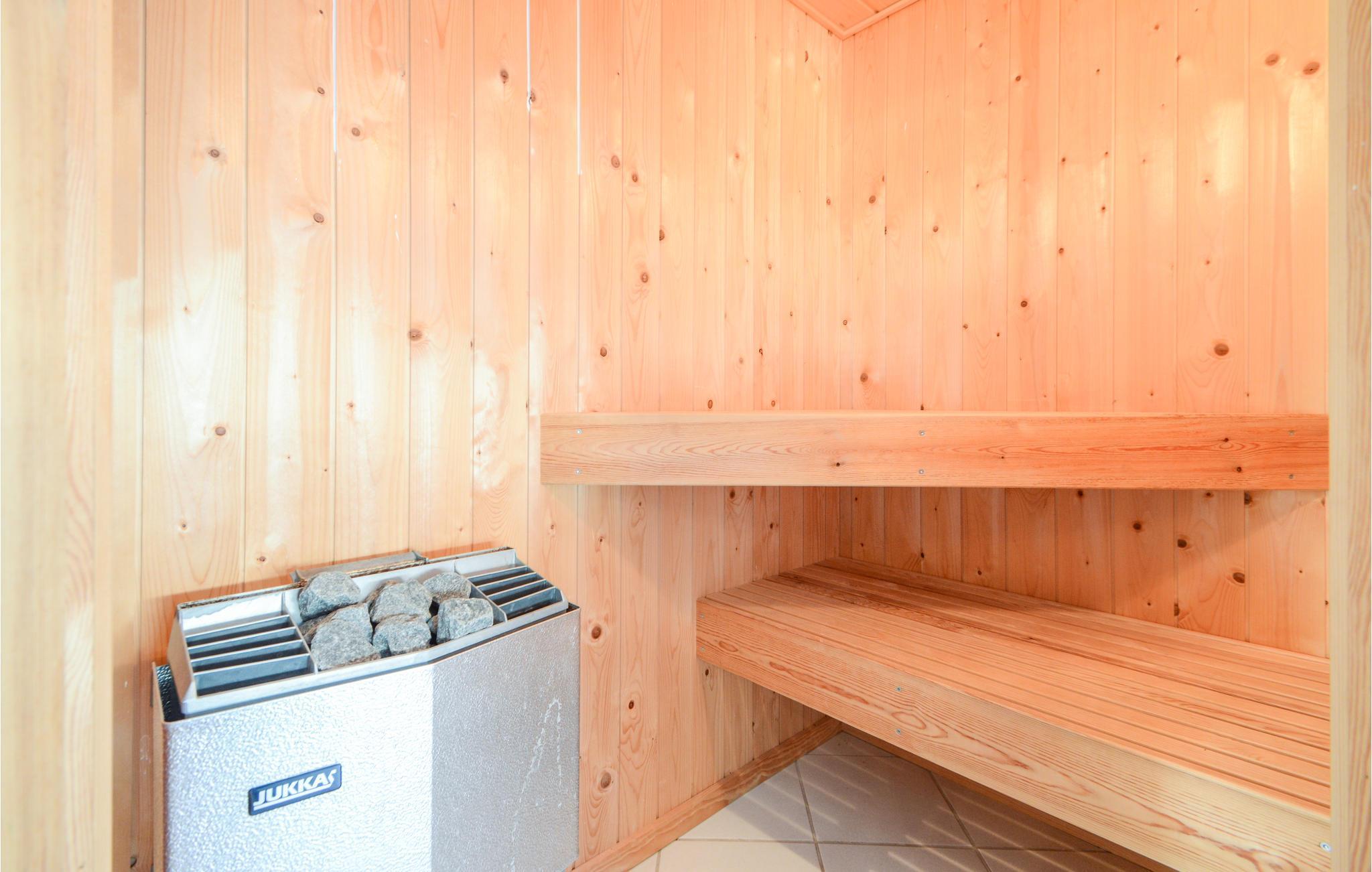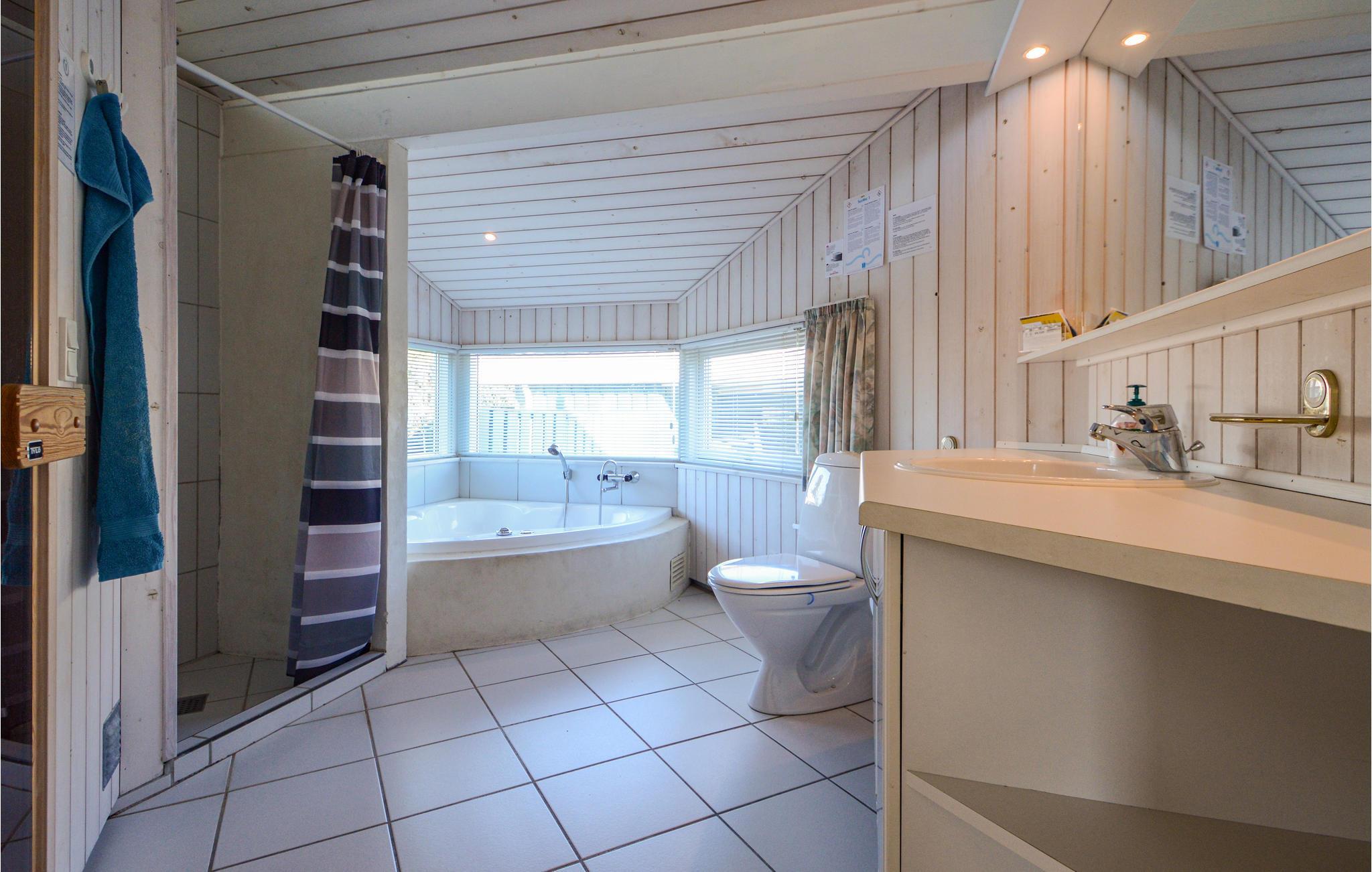 Das großes Badezimmer bietet einen eigenen Whirlpool und Sauna. Die Schlafplätze für insgesamt 7 Personen verteilen sich auf drei Schlafzimmer, zwei mit Doppelbetten und eines mit Etagenbett, und einen Zwischenboden mit zwei weiteren Schlafplätzen. Auf dem Grundstück befindet sich ein Carport mit Hauswirtschaftsraum, in dem sich die Waschmaschine und ein großer Gefrierschrank befinden.