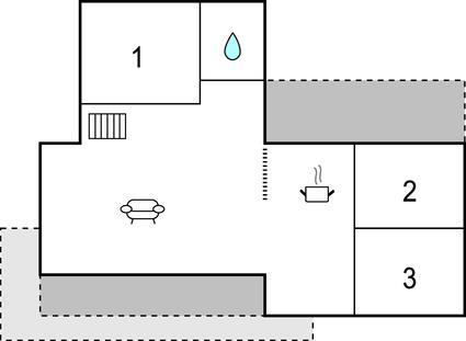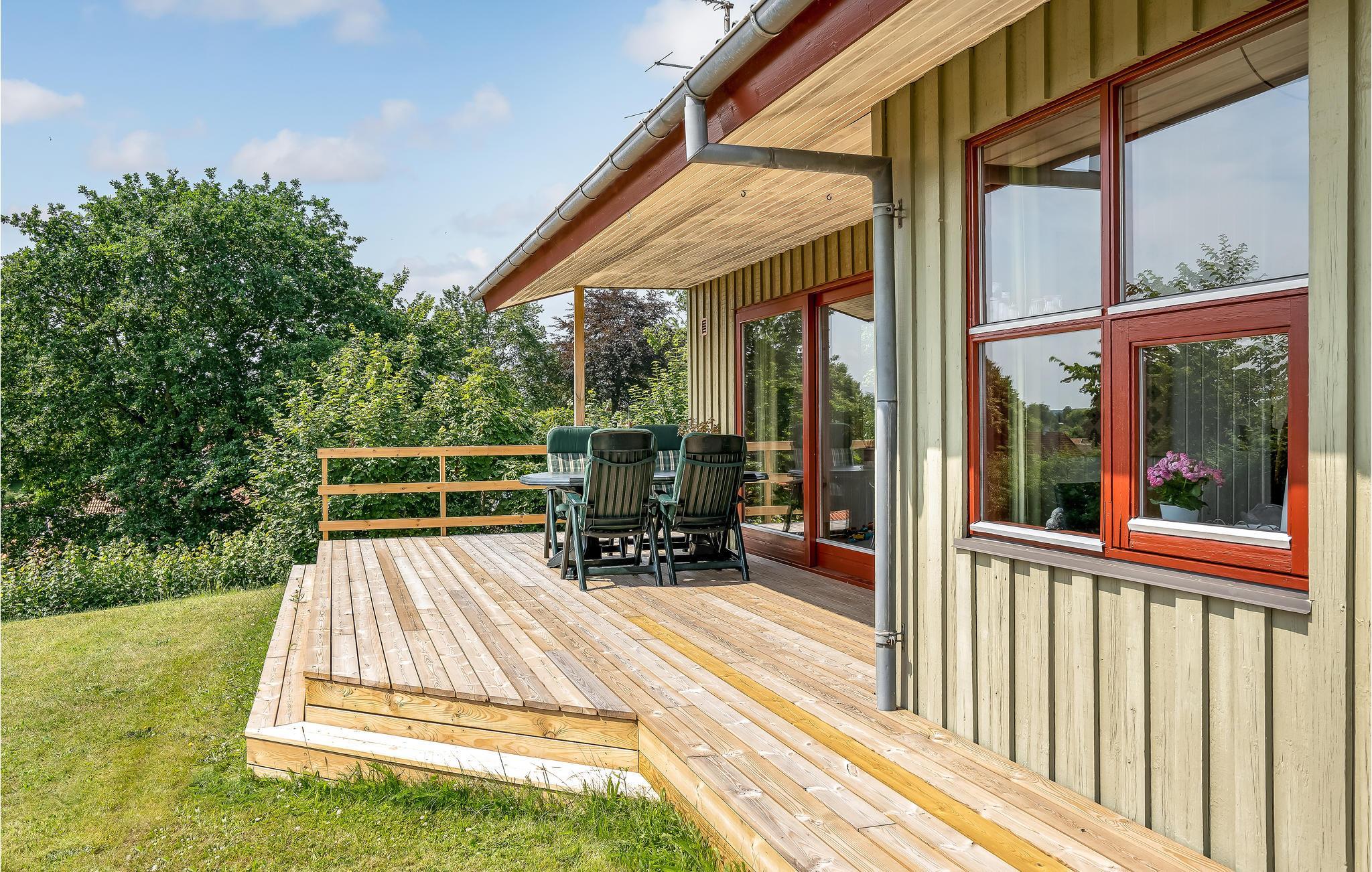 Ferienhaus auf erhöhter Lage und mit Aussicht. Das Haus liegt auf einem großen Grundstück mit viel Platz zum Urlaub machen. Auf beiden Seiten des Hauses befindet sich eine überdachte und eine offene Terrasse, sodass Sie das schöne Wetter genießen können. Innen ist das Haus mit Wohnzimmer, Esszimmer und offener Küche eingerichtet. Es gibt 3 Schlafzimmer und ein Badezimmer mit Dusche.