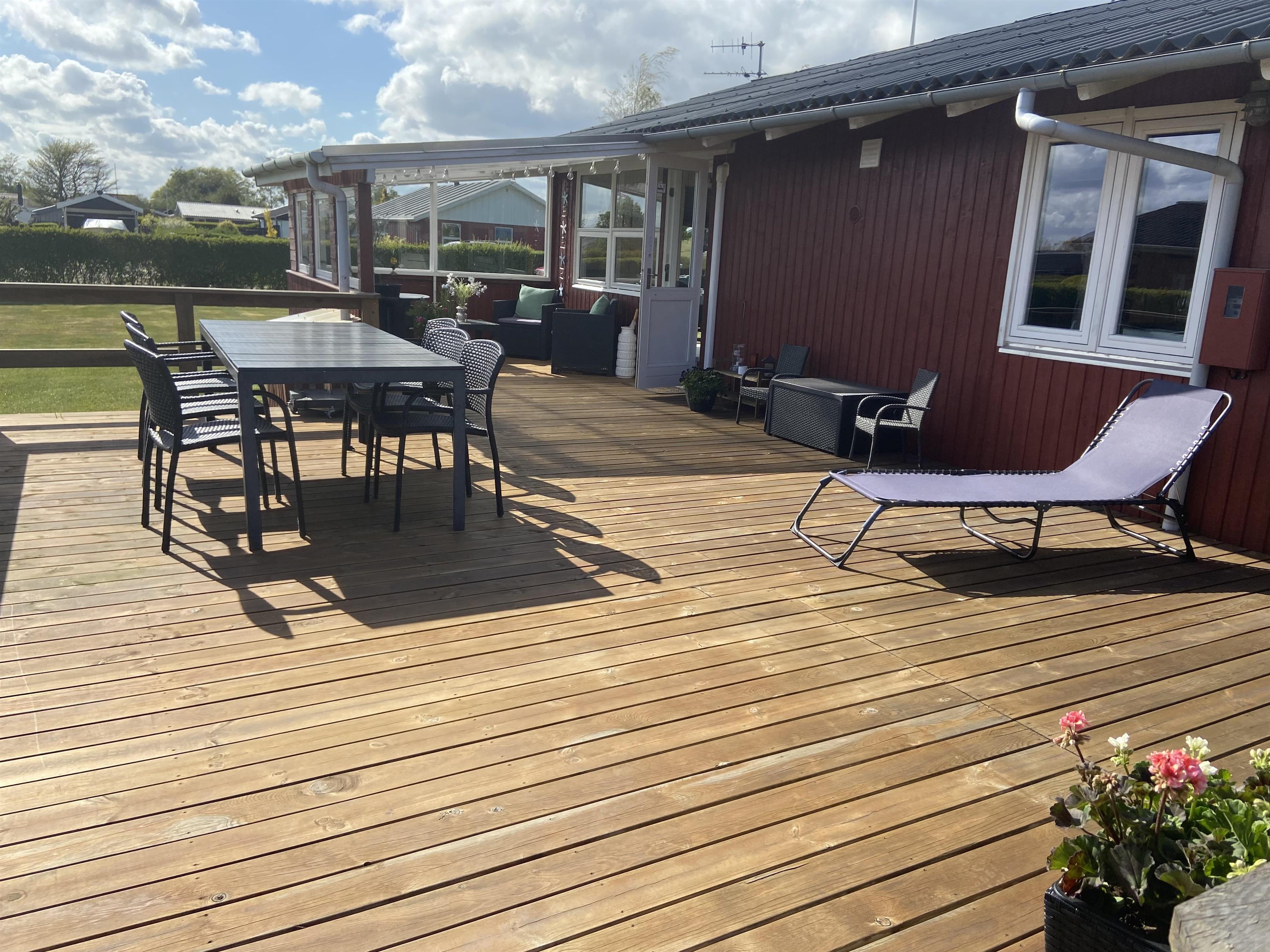 Neben der einladenden überdachten Terrasse gibt es auch noch eine große, offene Holzterrasse mit Gartenmöbeln, Sonnenliegen und Grill.