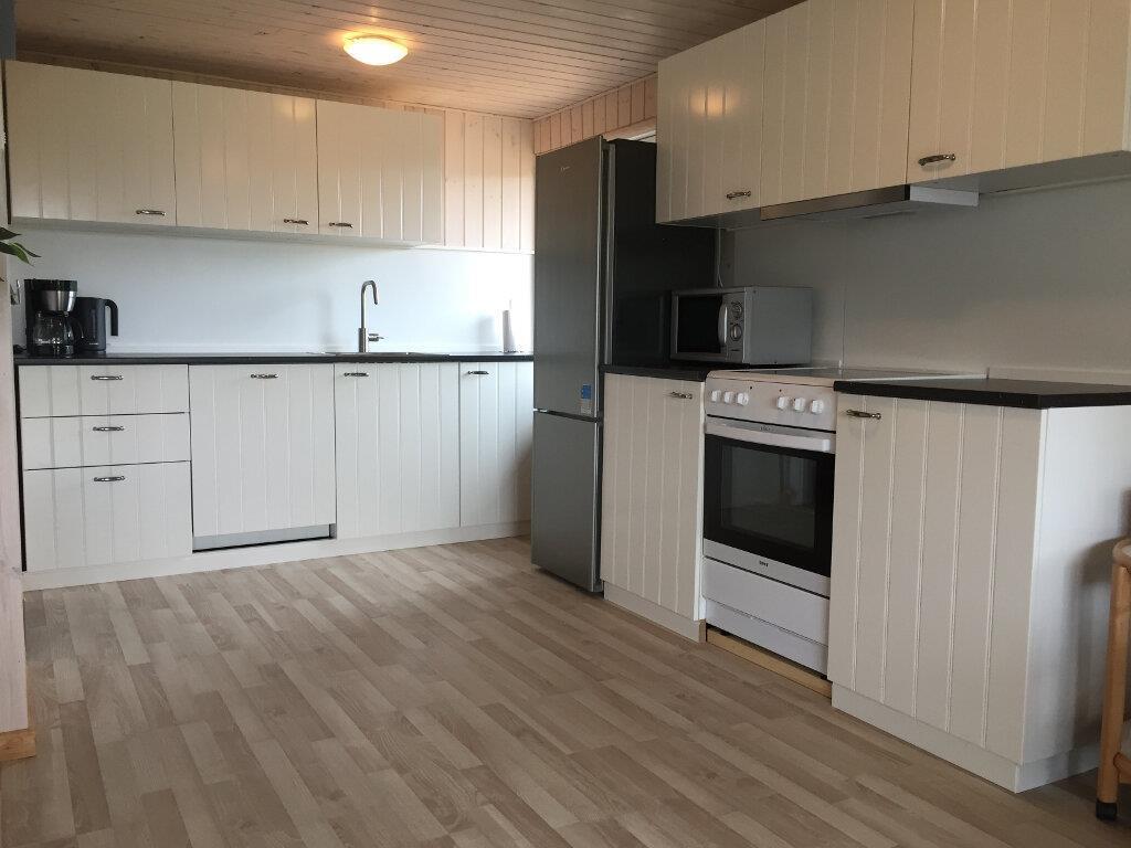 Das Wohnzimmer ist hell und wohnlich ausgestattet. Hier steht ein gemütlicher Holzofen und es gibt Kabel-TV. Auch die Küche ist hell und groß und ganz neu eingerichtet und ausgestattet. Sie liegt in offener Verbindung mit dem Wohnzimmer, so dass alle, auch beim Essenmachen, zusammen sein können. Die Küche hat u.a. Spülmaschine und Mikrowelle.
