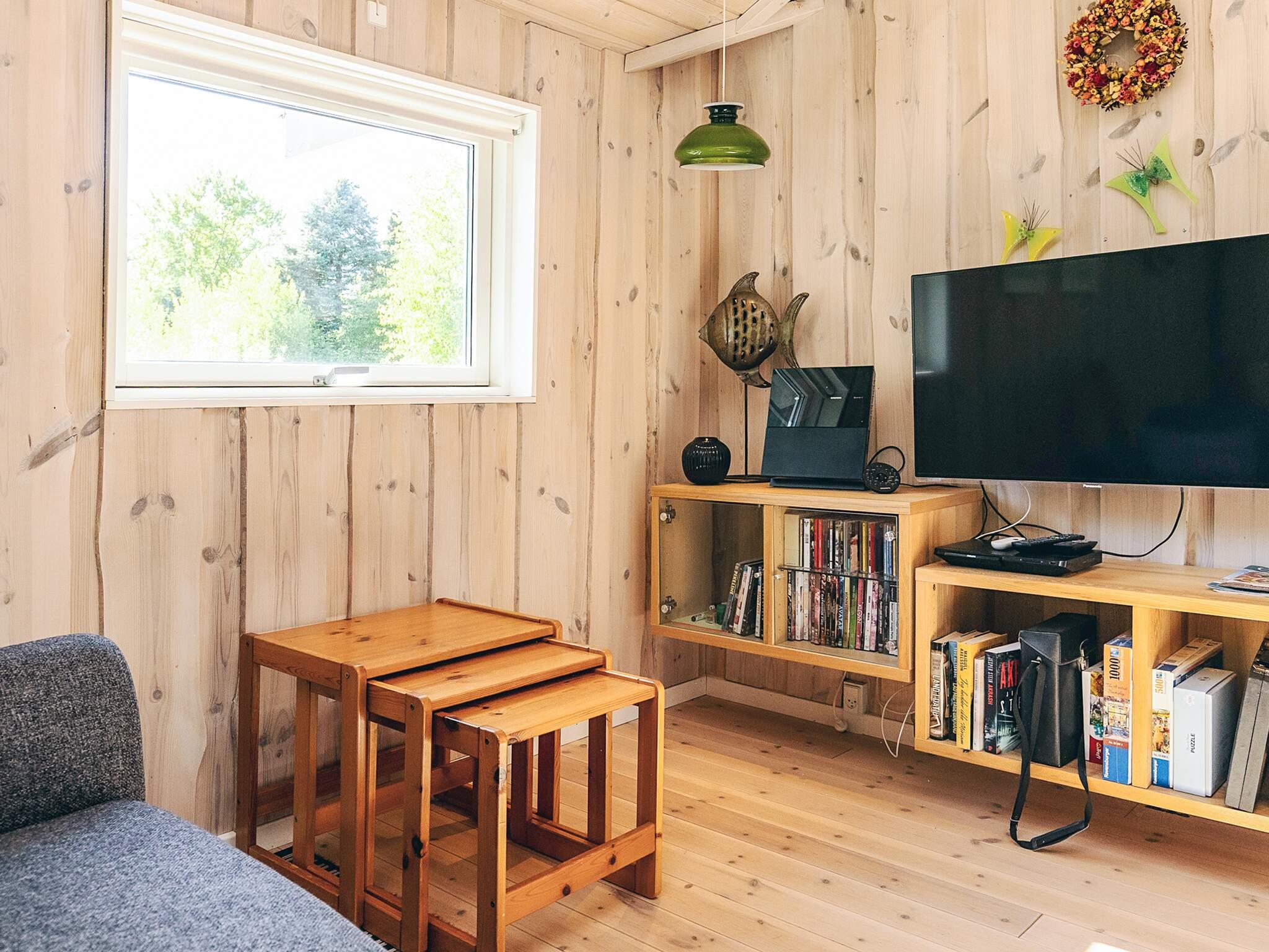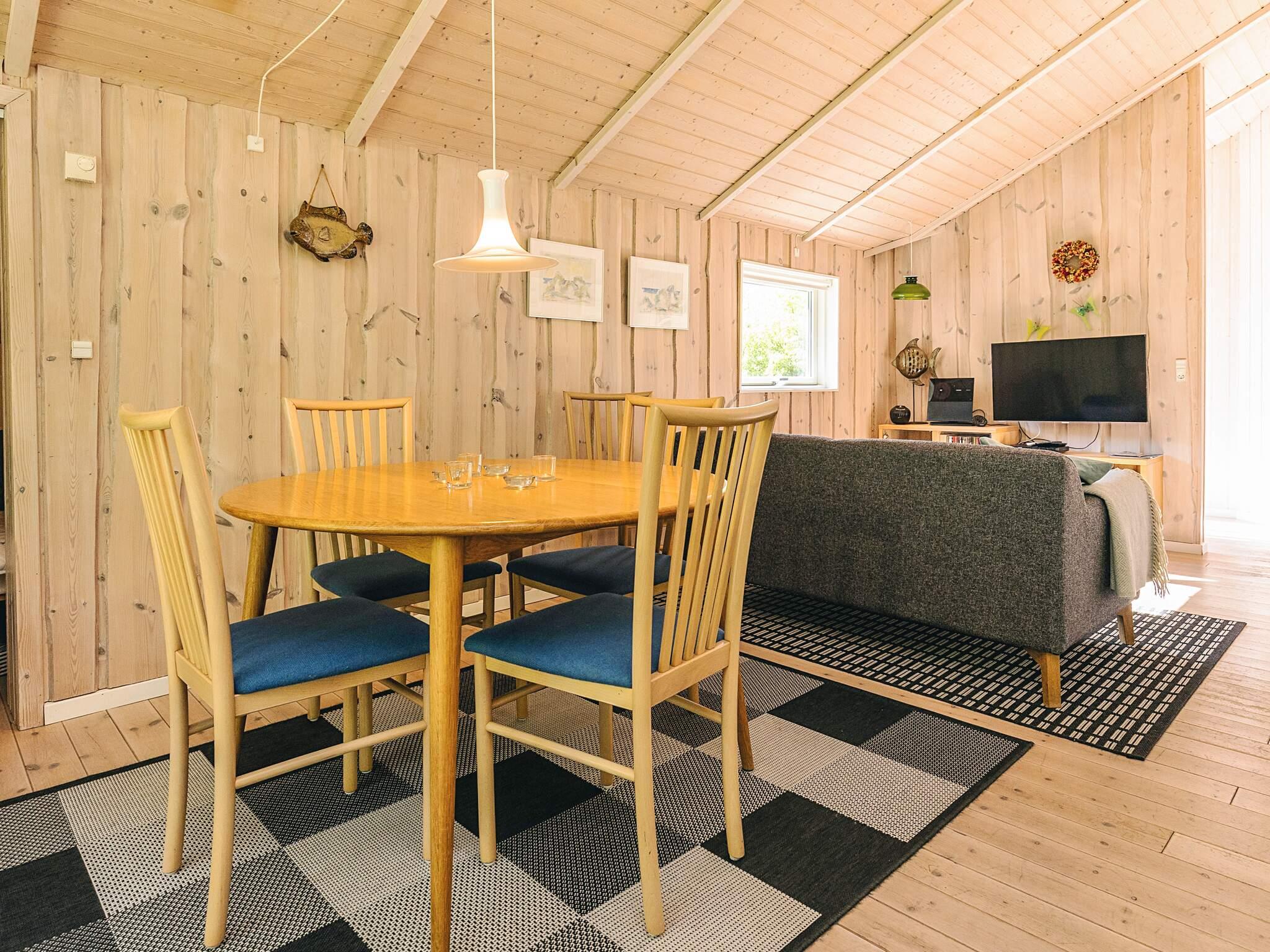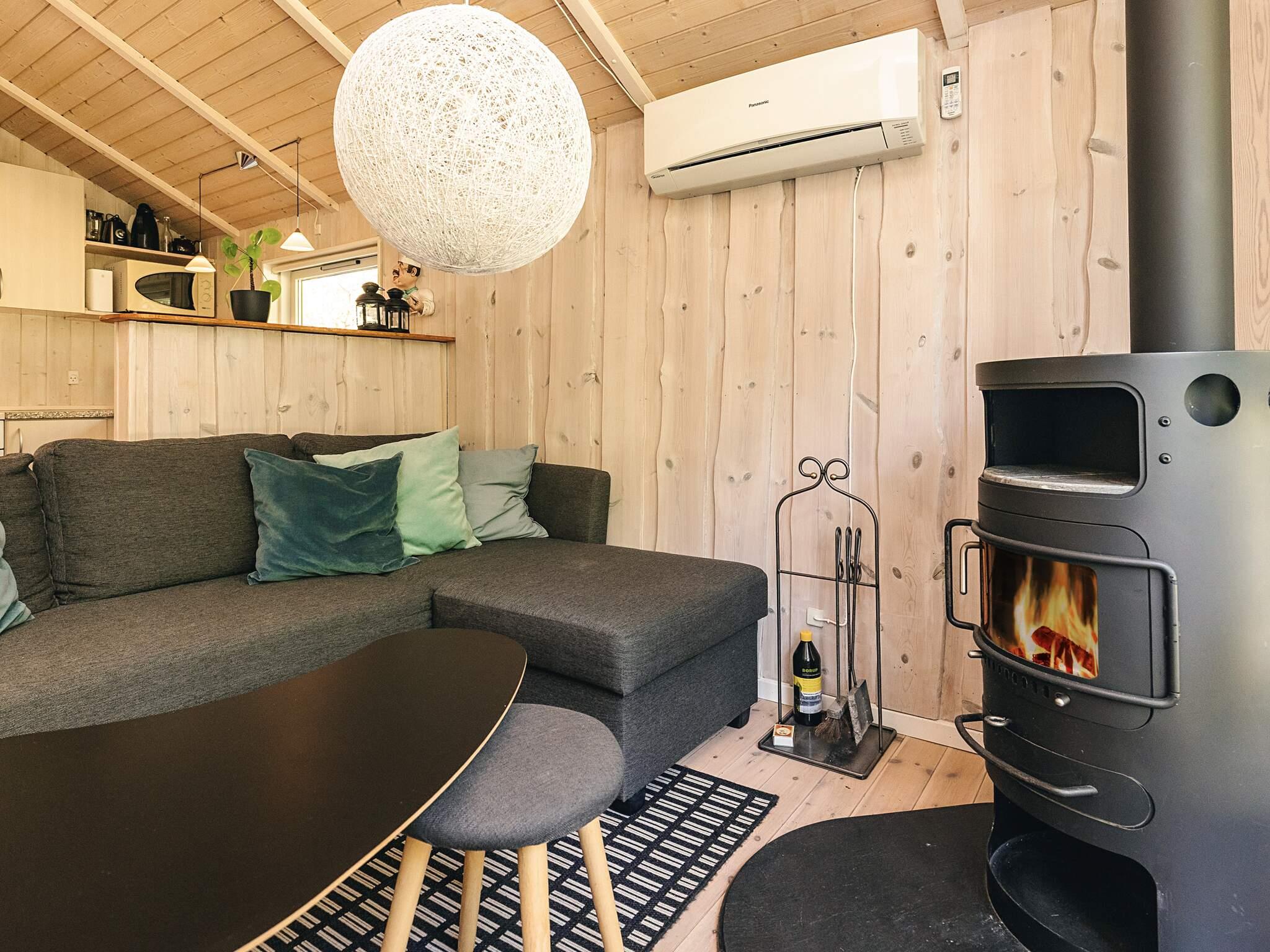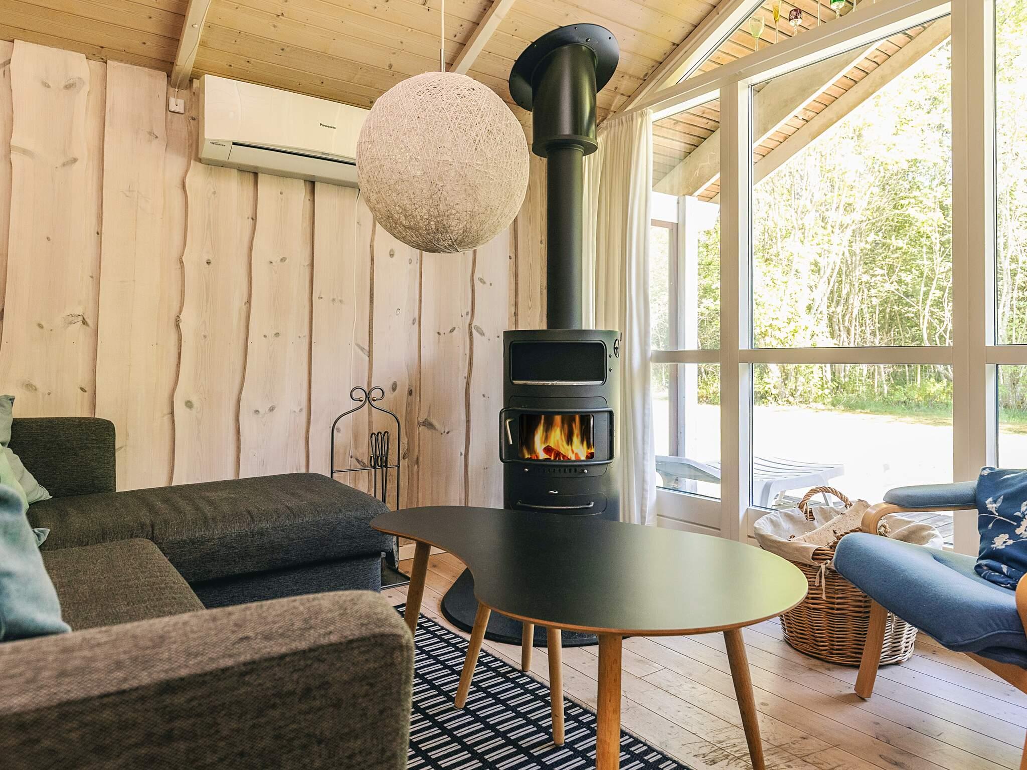 Das Wohnzimmer des Ferienhauses ist schön und offen gestaltet und bietet tolle Möglichkeiten für geselliges Beisammensein mit der Familie. Hier können Sie auf dem Sofa am Holzofen oder vor dem Fernseher bei einem guten Film entspannen, denn das Haus verfügt über Smart-TV und Chromecast. Der Esstisch lädt zu Spieleabenden mit einem der vielen im Haus vorhandenen Brettspiele und natürlich zum Genießen köstlicher, in der Küche zubereiteter Mahlzeiten ein.