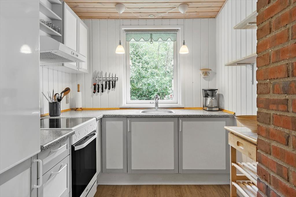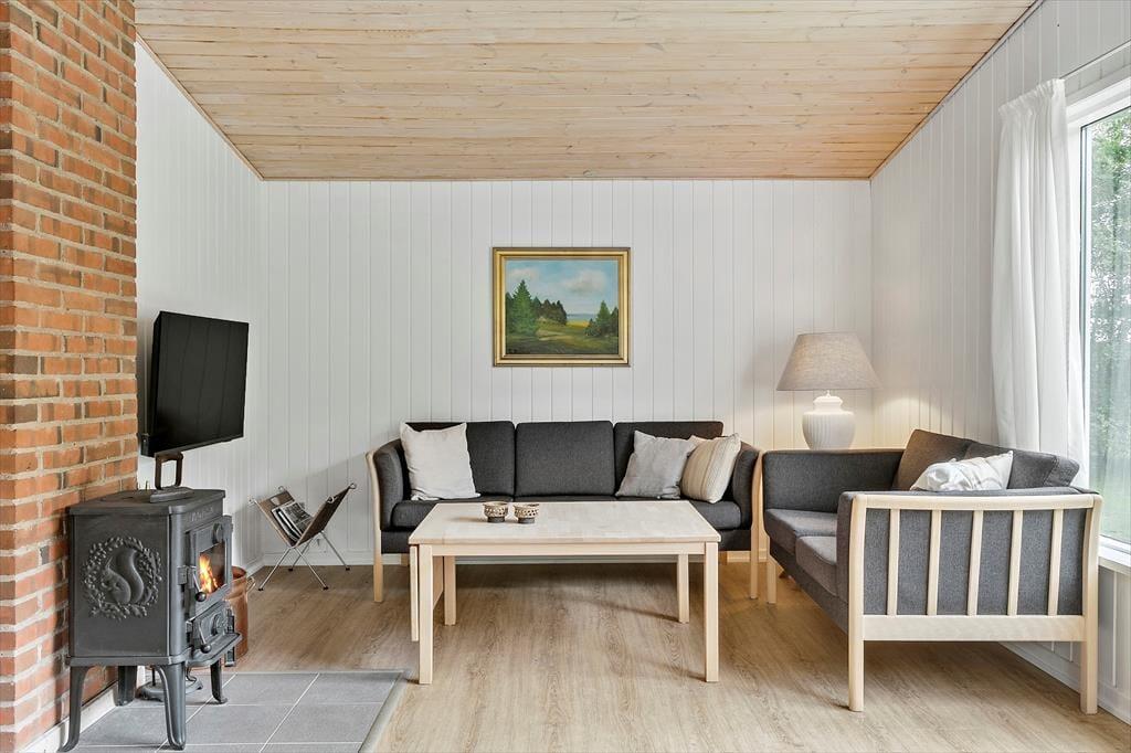 Mit drei Schlafräumen, einem Badezimmer und einem gemütlichen Aufenthaltsbereich beherbergt das Ferienhaus problemlos bis zu sechs Personen. Gern darfst du auch euren vierbeinigen Freund mit in das Haus bringen. Der Aufenthaltsbereich setzt sich offen aus dem Wohnraum und der Küche zusammen. Dank der offenen Verbindung genießt du selbst während der Zubereitung der Mahlzeiten die Nähe und Gesellschaft deiner Lieben, die sich im Wohnraum tummeln. Nach einem ausgedehnten Frühstück oder Abendessen am Esstisch macht ihr es euch auf den komfortablen Lehnstühlen und auf den beiden Sofas gemütlich. An kühlen Tagen verwöhnt euch der im Wohnraum platzierte Kaminofen mit einem Maximum an Wärme und klassischer Ferienhausstimmung. Wenn hingegen die Sonne warm vom Himmel lacht, stellt ihr die Terrassentür des Wohnraums weit auf und verlegt das entspannte Urlaubsleben hinaus ins Freie.