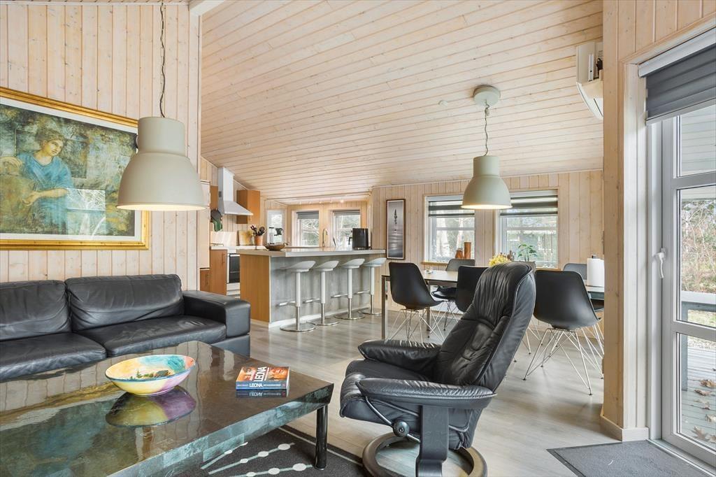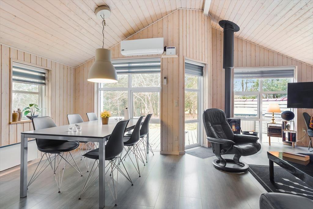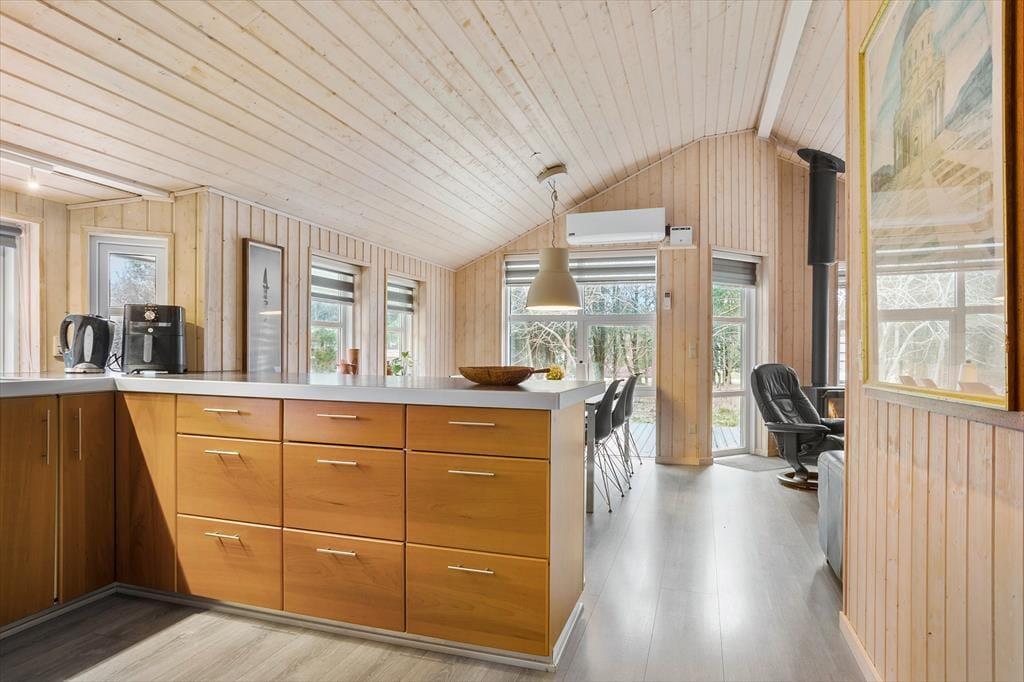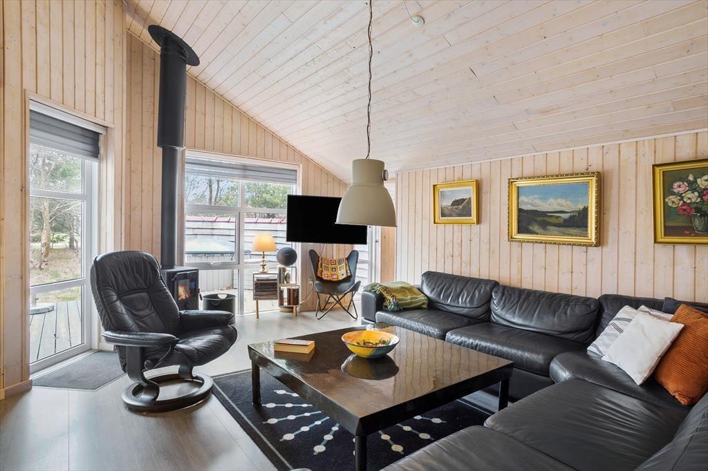 Das Ferienhaus ist einfach und praktisch mit hellem Holz an den Wänden, Decken sowie Böden und großen Fensterfronten, die für tolle Lichtverhältnisse sorgen, eingerichtet. Der Küchenbereich hat hohe Decken und im Wohnzimmer befindet sich ein gusseiserner Kamin, der für eine wunderbare Wärme in den kühlen Morgenstunden und für gemütliche Abendstunden sorgt. Zunächst betreten Sie im Ferienhaus den Eingangsbereich, gefolgt von zwei tollen Schlafzimmern mit Doppelbett und einem Badezimmer mit Toilette und Dusche. Die Küche ist zum Aufenthaltsbereich mit Essbereich und Wohnzimmer mit Sofa, Kamin und Fernseher offen. In einer Ecke des Wohnzimmers befindet sich eine Schlafnische, die für die Kinder sicherlich interessant ist, hier befinden sich zwei weitere Schlafmöglichkeiten. Die komplette Einrichtung wie Möbel, Inventar und elektronische Haushaltsgeräte ist hochwertig.
