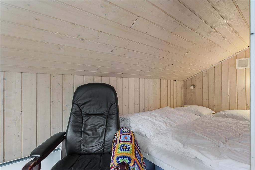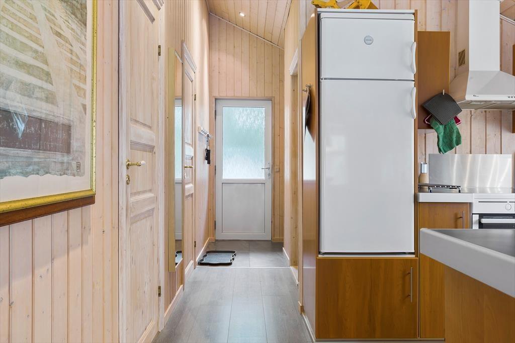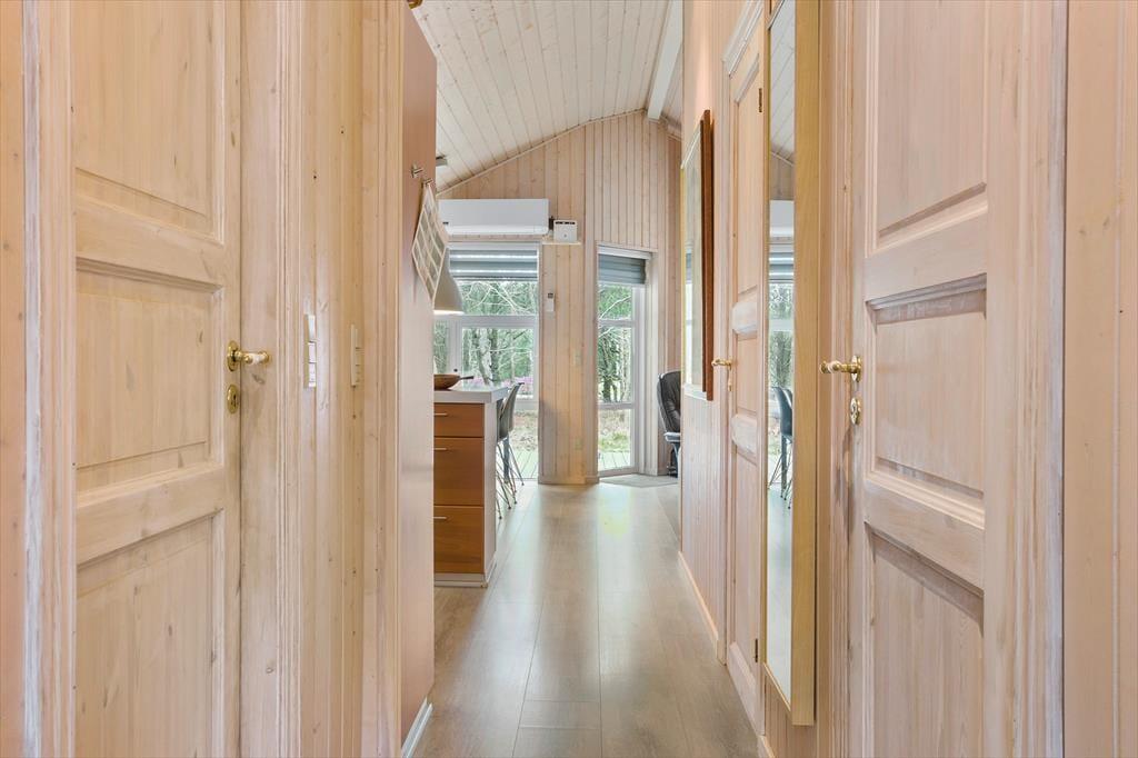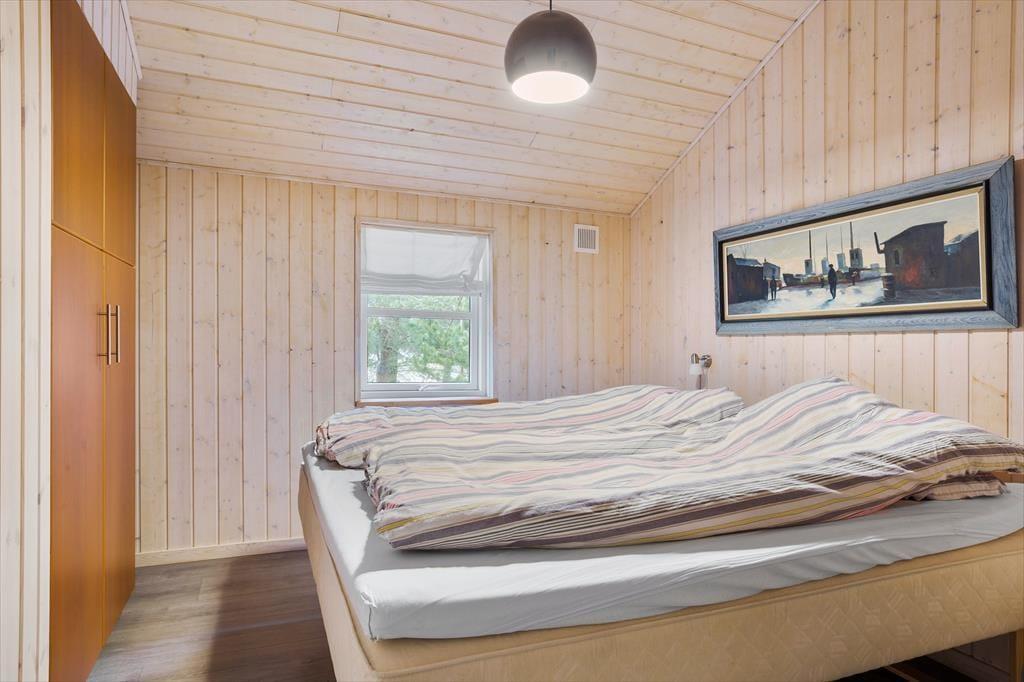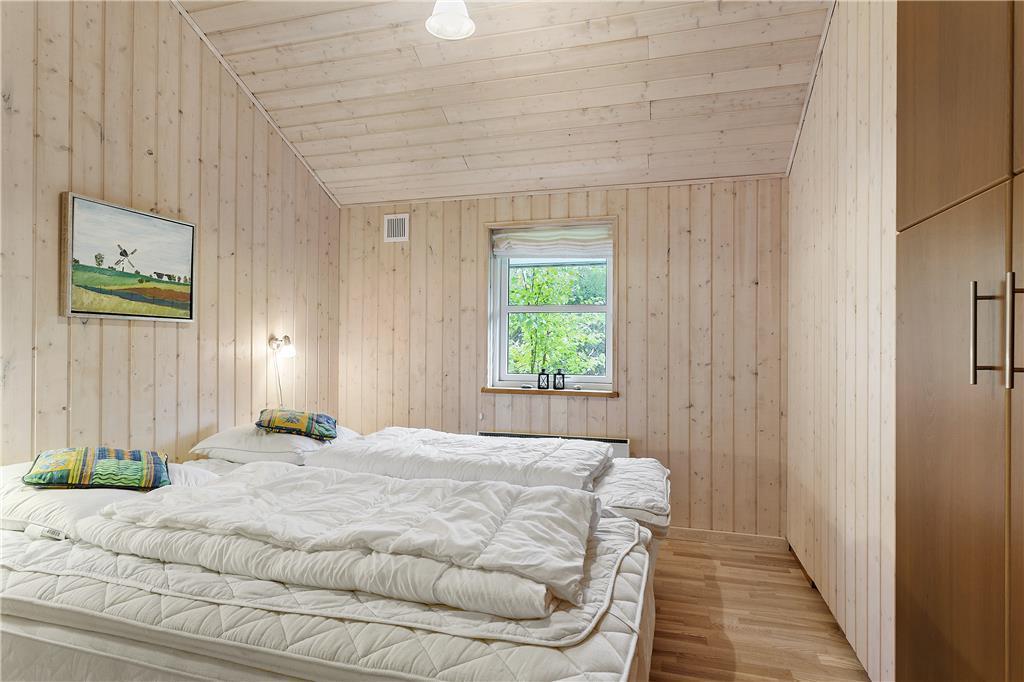 Das Ferienhaus ist einfach und praktisch mit hellem Holz an den Wänden, Decken sowie Böden und großen Fensterfronten, die für tolle Lichtverhältnisse sorgen, eingerichtet. Der Küchenbereich hat hohe Decken und im Wohnzimmer befindet sich ein gusseiserner Kamin, der für eine wunderbare Wärme in den kühlen Morgenstunden und für gemütliche Abendstunden sorgt. Zunächst betreten Sie im Ferienhaus den Eingangsbereich, gefolgt von zwei tollen Schlafzimmern mit Doppelbett und einem Badezimmer mit Toilette und Dusche. Die Küche ist zum Aufenthaltsbereich mit Essbereich und Wohnzimmer mit Sofa, Kamin und Fernseher offen. In einer Ecke des Wohnzimmers befindet sich eine Schlafnische, die für die Kinder sicherlich interessant ist, hier befinden sich zwei weitere Schlafmöglichkeiten. Die komplette Einrichtung wie Möbel, Inventar und elektronische Haushaltsgeräte ist hochwertig.