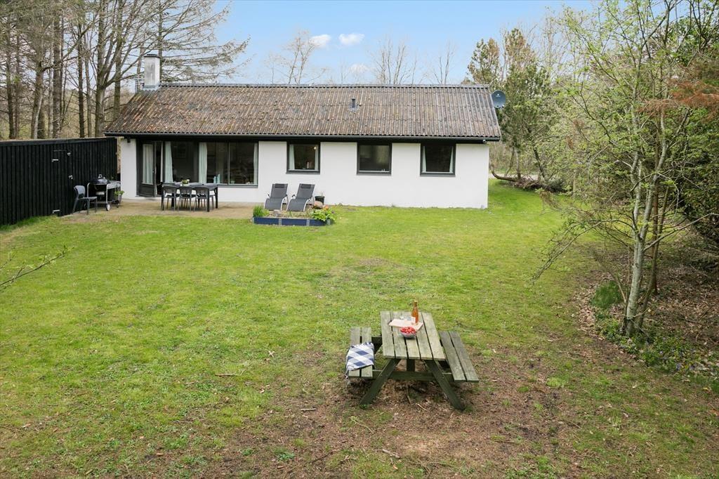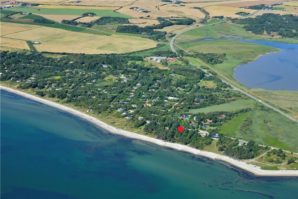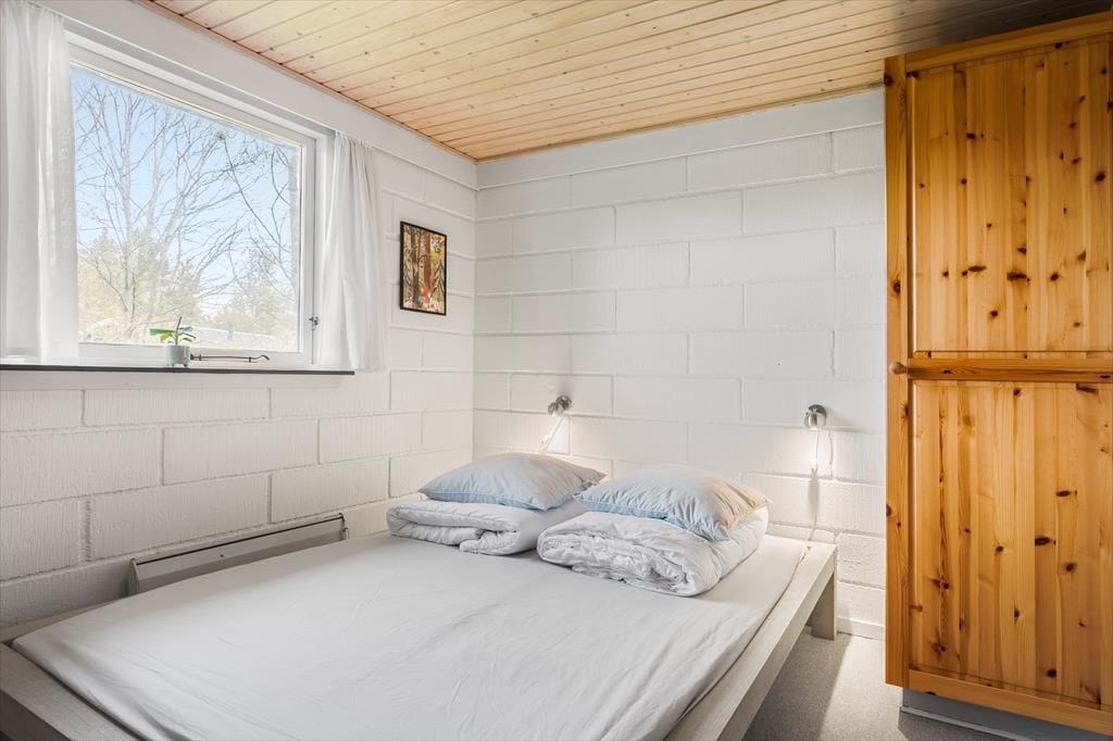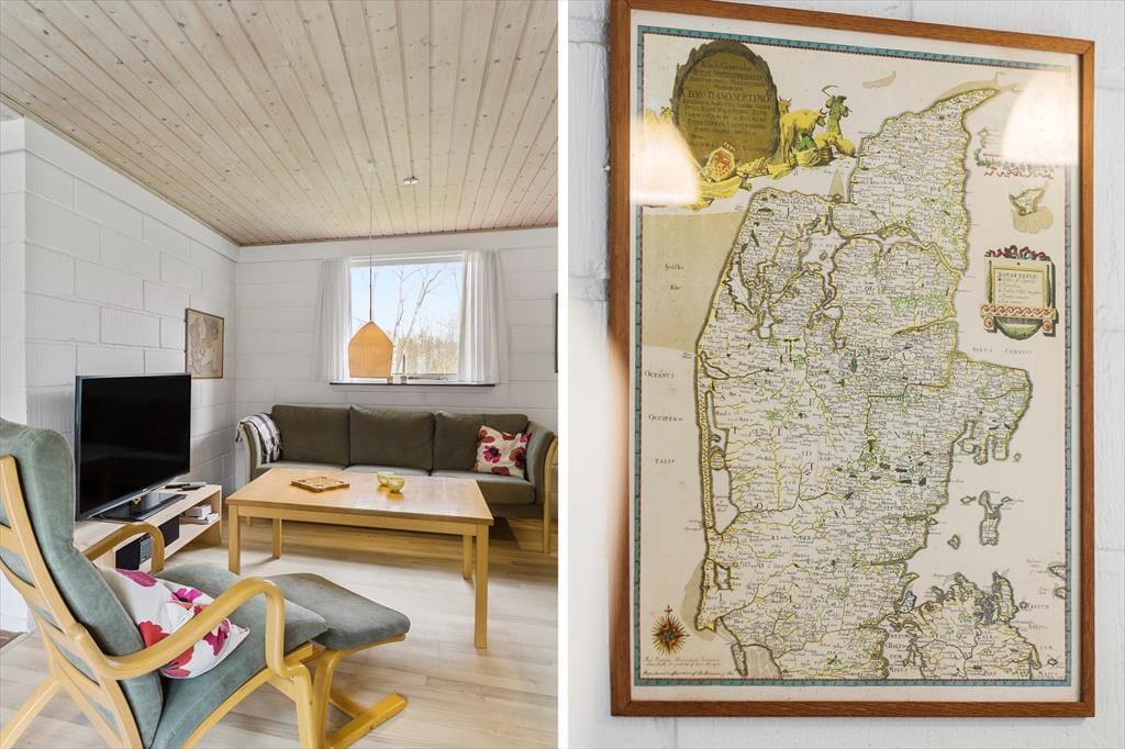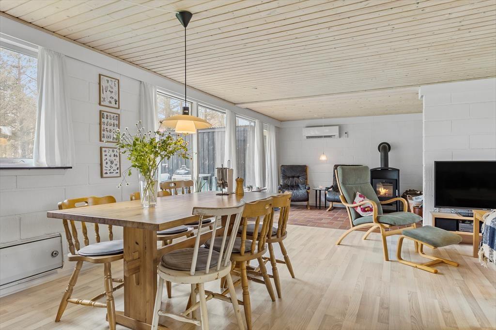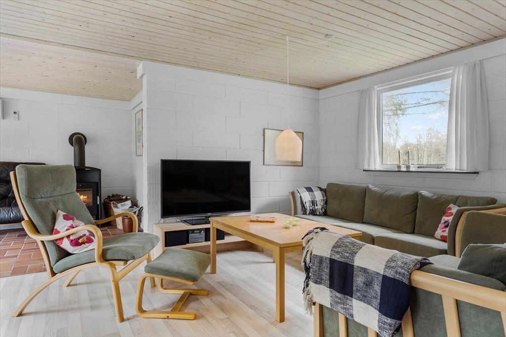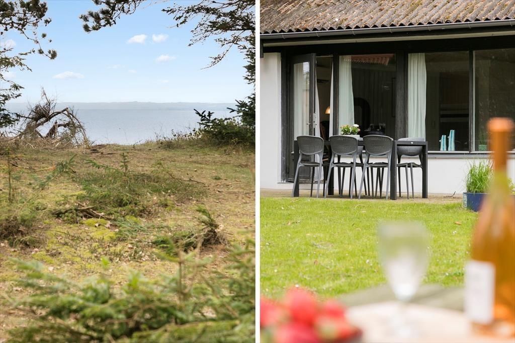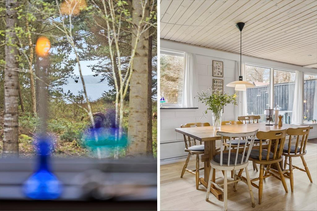 Das Ferienhausgrundstück führt direkt hinunter an den Strand, sodass Sie hinter den Bäumen im Garten bereits den schönen Ausblick auf das blaue Wasser des Fjords genießen können. Die üppige, schöne Natur ringsum genießen Sie auch, wenn Sie es sich im Wohnraum gemütlich machen, der über Fenster gen Süden und Norden verfügt. Dieser Wohnraum ist ein gelungenes Resultat der Modernisierung, die im Jahr 2021 durchgeführt wurde. Im Zuge der in Standhaltung wurden die Fußböden und die offene Küchenabteilung ausgetauscht. Gleiches gilt für die Möblierung, sodass Sie sich nunmehr wunderbar entspannen und wohlfühlen werden. Behagliche Temperaturen sichern die Wärmepumpe und der romantisch knisternde Kaminofen. Zur Wohnfläche zählen darüber hinaus auch ein Badezimmer und drei Schlafräume, sodass dieses Urlaubsdomizil problemlos bis zu sechs übernachtende Urlauber beherbergt.