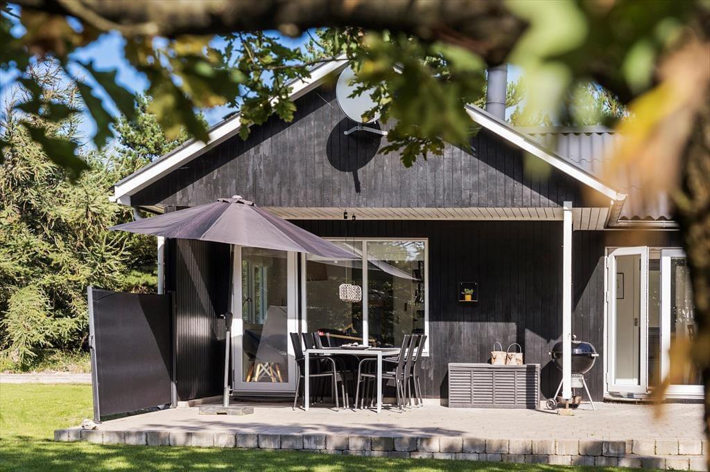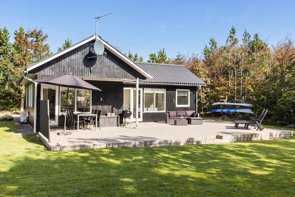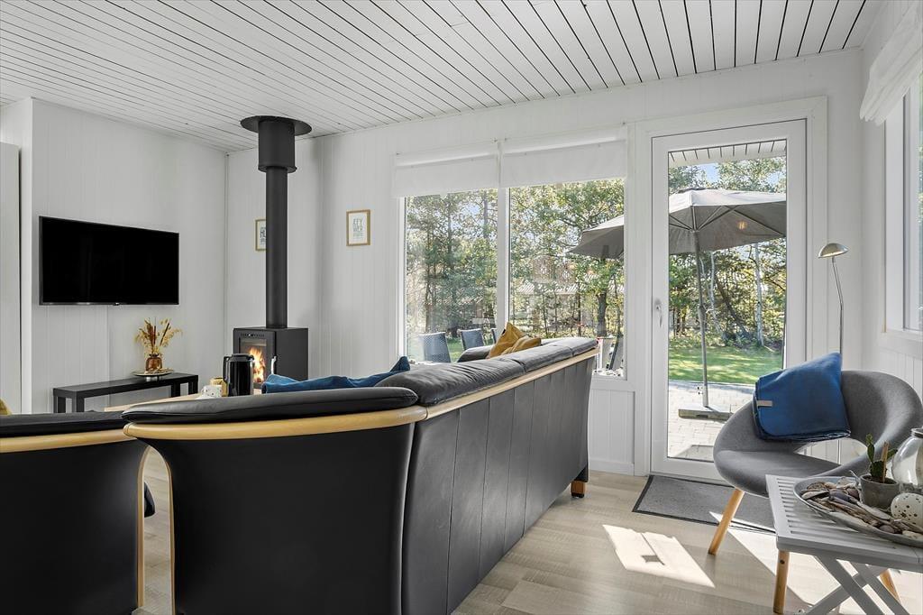 Hinter der schwarzen Holzfassade erwarten dich helle Räumlichkeiten, die zu gemütlichen Stunden und zum Entspannen einladen. Vom ersten Moment an fühlst du dich in diesem Ferienhaus heimisch und wohl. Mach es dir in der Sofaecke mit einem spannenden Krimi gemütlich oder genieße einen unterhaltsamen Spieleabend mit deinen Lieben. An kühlen Tagen und Abenden verwöhnst du deine Familie mit einem warmen Becher Kakao vor dem behaglich knisternden Kaminofen. An warmen, sommerlichen Tagen öffnest du hingegen die Terrassentüren weit, sodass ihr direkt hinaus ins Freie treten könnt. Zur Wohnfläche gehören ein Duschbadezimmer und drei Schlafräume mit insgesamt fünf Schlafplätzen.