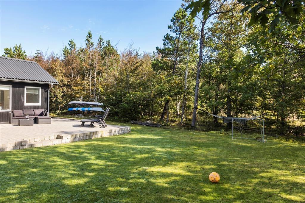 Die Außenbereiche deines Ferienhauses sind ein Traum für alle, die es lieben, viel Zeit auf der Terrasse und mit Gartenspielen in einer grünen, friedvollen Umgebung zu verbringen. Die nach Süden ausgerichtete Terrasse ist mit komfortablen Gartenmöbeln, Liegestühlen und einem Grill ausgestattet – kurzum mit allem, was ihr für herrliche Stunden in der Sonne und für gesellige Abende benötigt. Die Rasenfläche bietet ausreichend Platz zum Umhertollen und für Ballspiele. Lediglich 200 Meter trennen dieses Ferienhaus vom Strand, sodass du deine entspannten Tage im ungestörten, windgeschützten Garten wunderbar mit kleinen Abstechern an den Strand und erfrischenden Bädern krönen kannst.
