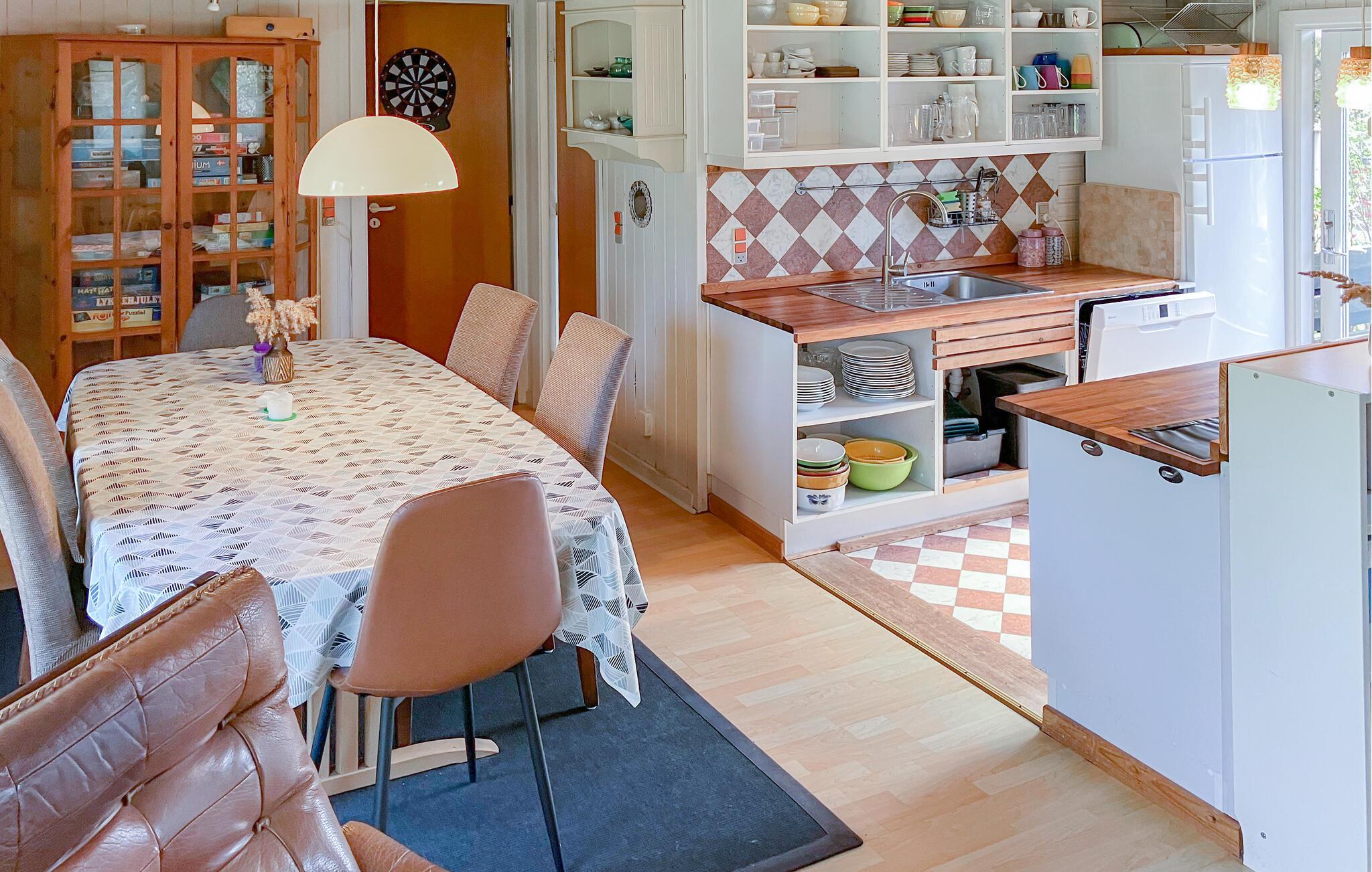 Ihr Ferienhaus, umgeben von hohen Bäumen, bietet die ideale Kulisse für erholsame Ferientage. Erleben Sie eine ruhige Auszeit inmitten weiter Landschaften und einem behaglich eingerichteten Zuhause. Die entspannte Wohnatmosphäre lädt zum Wohlfühlen ein. Kochen Sie ganz nach Ihrem Geschmack in der Küche im traditionellen Stil. Im angrenzenden Essbereich mit Blick ins Grüne schmecken Frühstück und Abendessen besonders gut. Entspannen Sie sich anschließend im Wohnbereich mit gemütlicher Sofaecke und Kaminofen – ein schöner Ort, um zur Ruhe zu kommen.