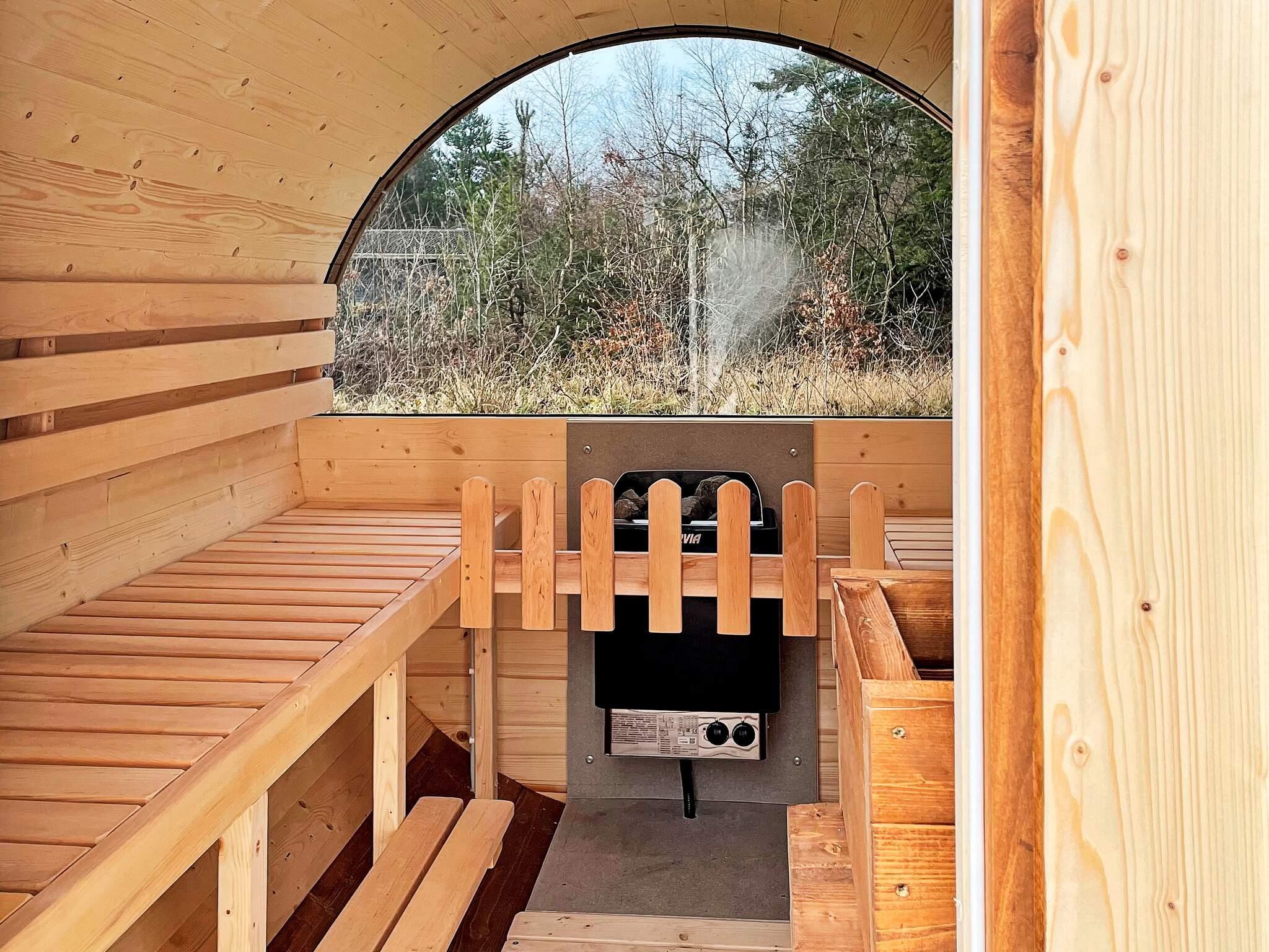 Von dem Poolbereich gelangen Sie hinaus auf die große Terrasse, wo Sie sich im Standwasser-Whirlpool unter freiem Himmel oder im gemütlichen Saunafass entspannen können. Für die Kinder stehen auf dem Grundstück Schaukel und Sandkasten bereit. Zudem Fläche für Beachvolleyball vor dem Haus.
