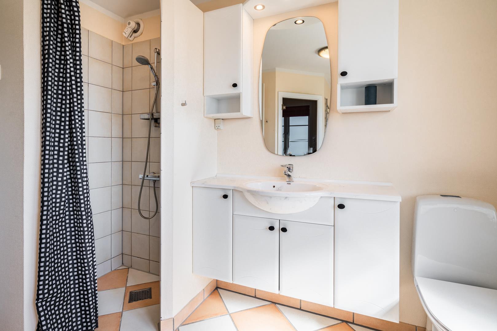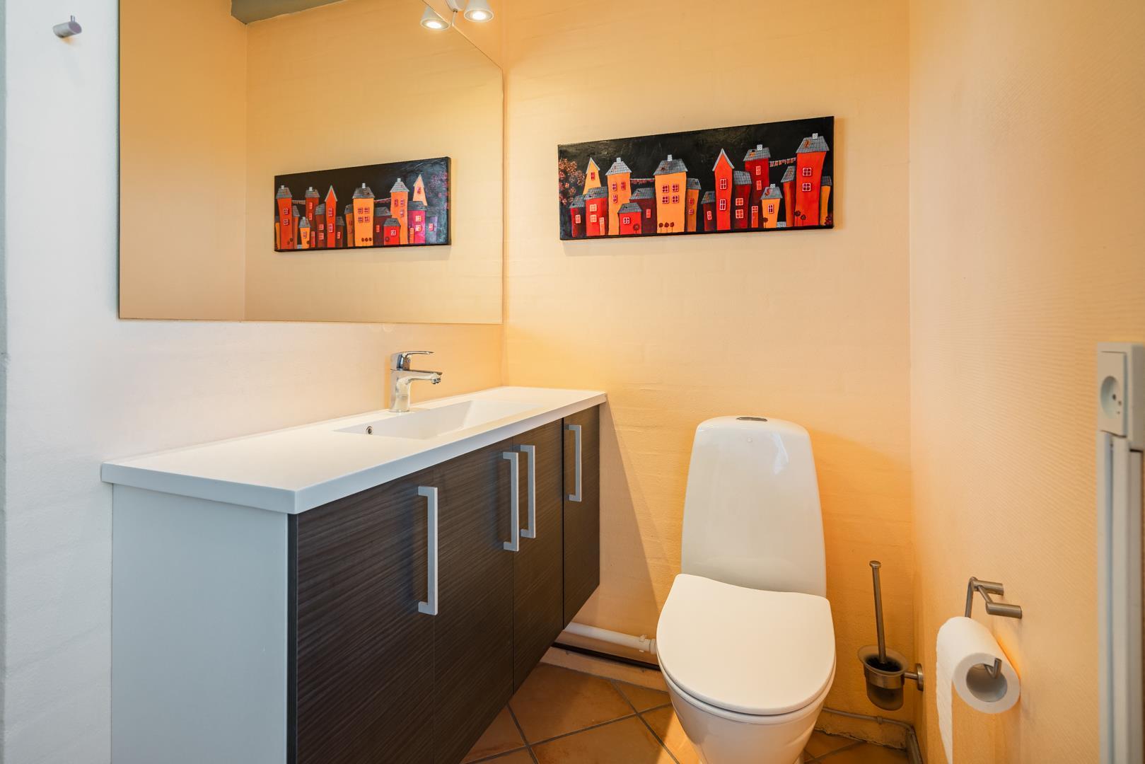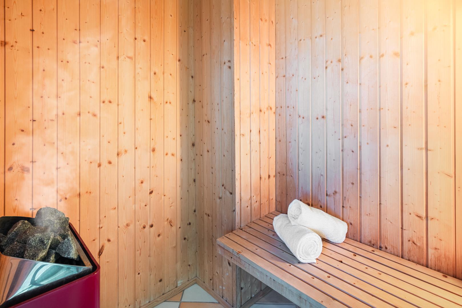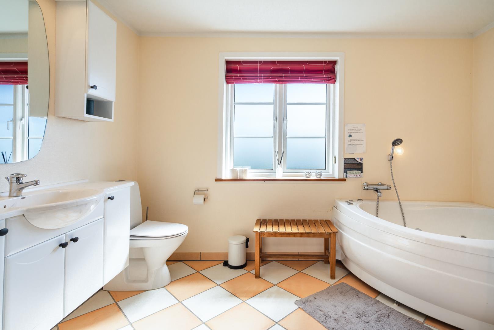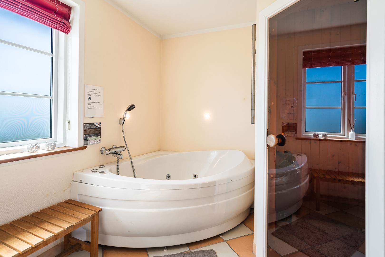 Das einladende Badezimmer verfügt über einen Whirlpool und eine Sauna – perfekt für gemütliche Stunden nach einem Tag an der frischen Meeresluft.