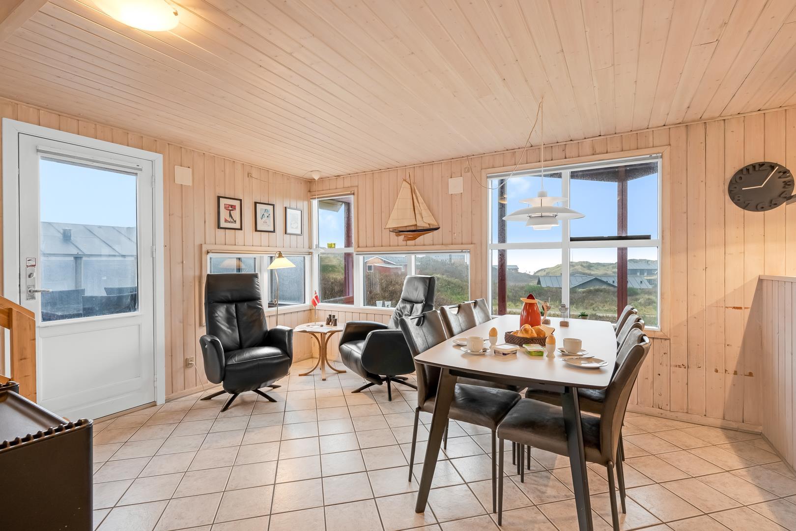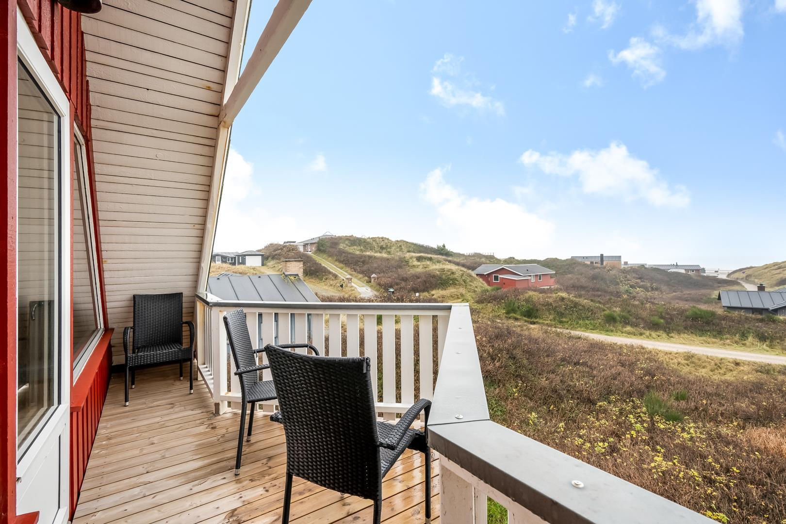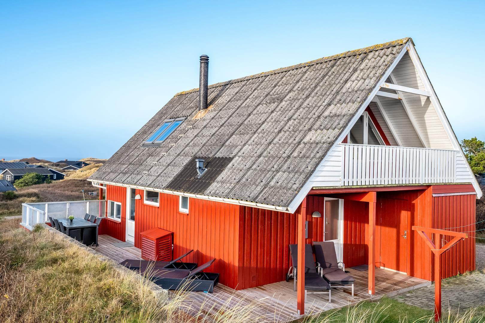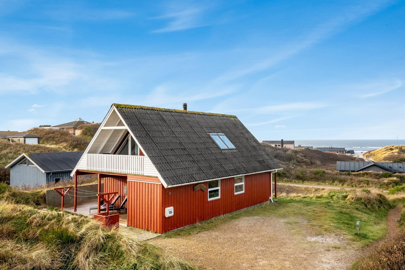 Schönes Ferienhaus auf 2 Etagen mit Meerblick gelegen auf einem tollen Dünengrundstück nahe am Strand. Es gibt sowohl Meerblick vom Erdgeschoss als auch von der 1.Etage. Mehrere schöne Terrassen von wo man die schöne Aussicht genießen kann. Tolles Bad mit Sauna. In der 1. Etage gibt es eine gemütliche Stube wo man ebenfalls die schöne Aussicht genießen kann und wo es Zugang zum Balkon gibt. Ein fantastisches Haus nahe am Wasser.