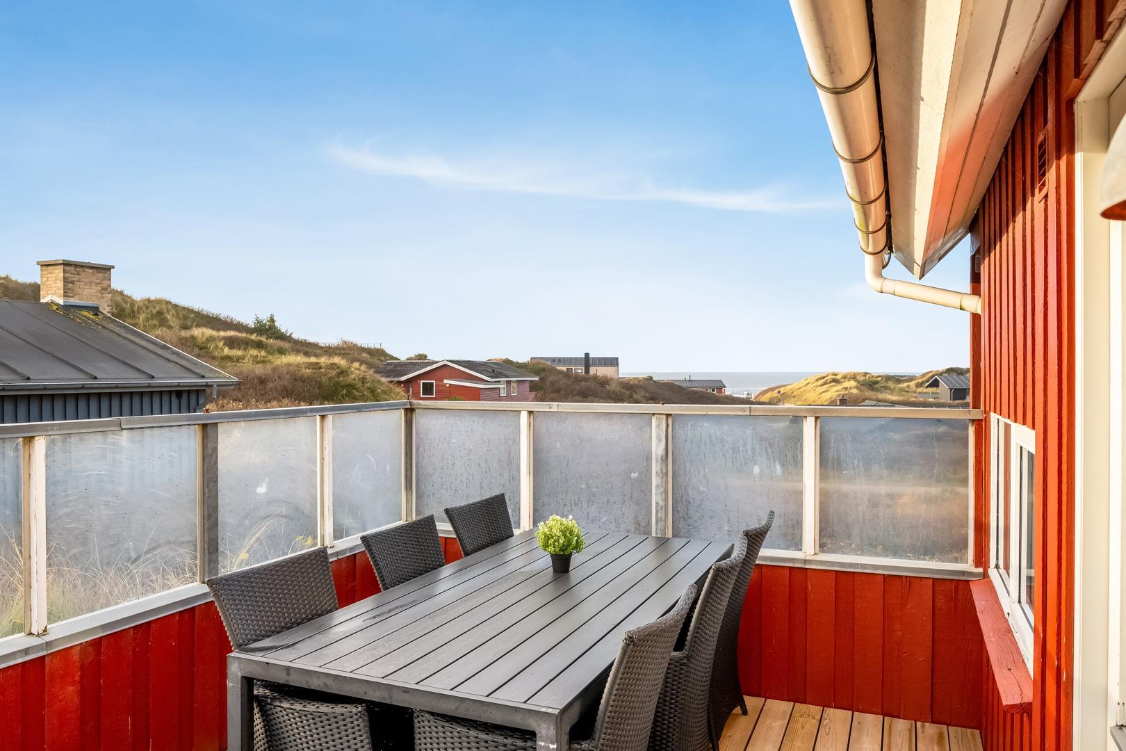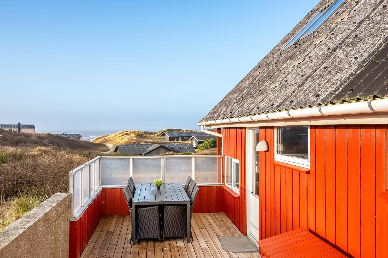 Ferienhaus mit Meerblick in Henne Strand, 2 Etagen, Sauna, mehrere Terrassen, 250 m zum Strand.
