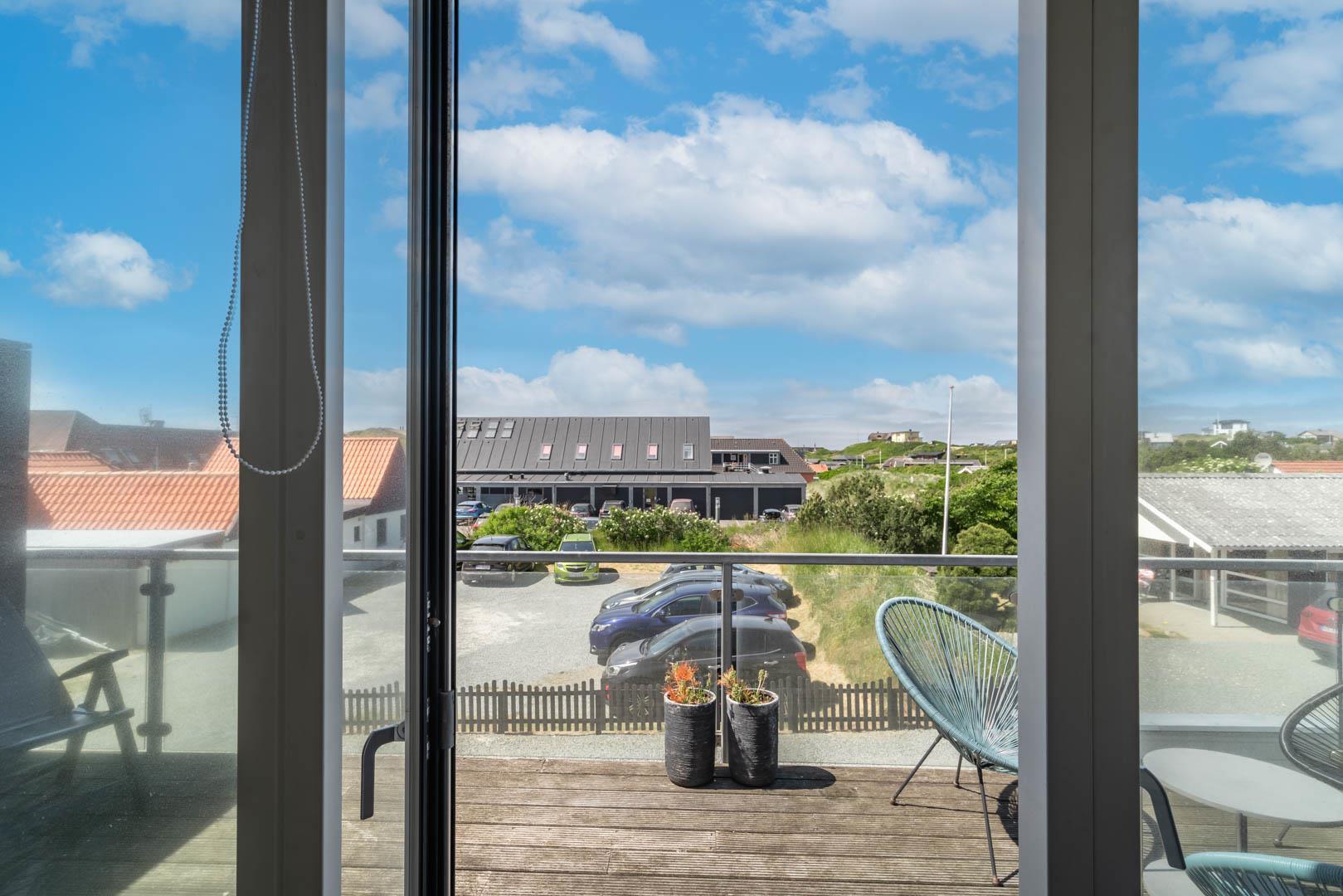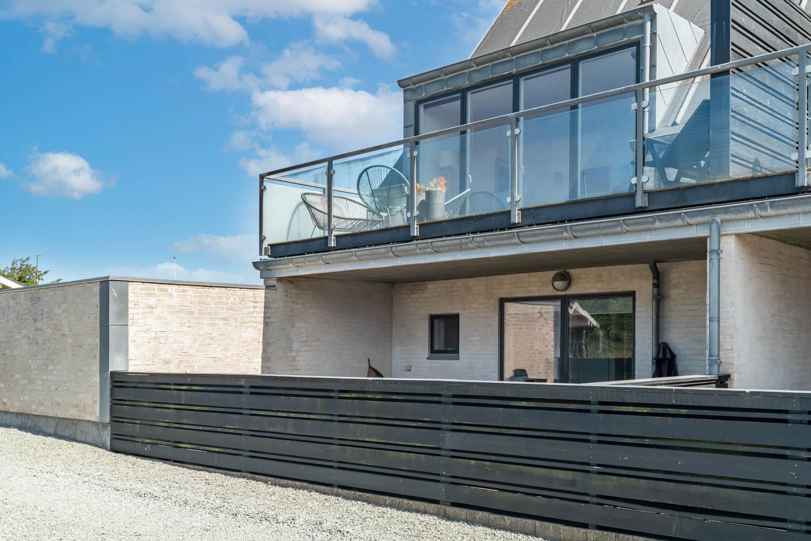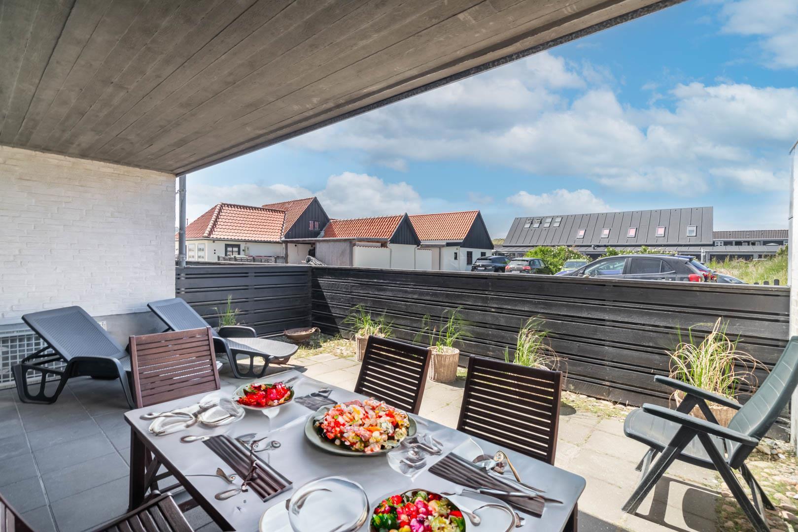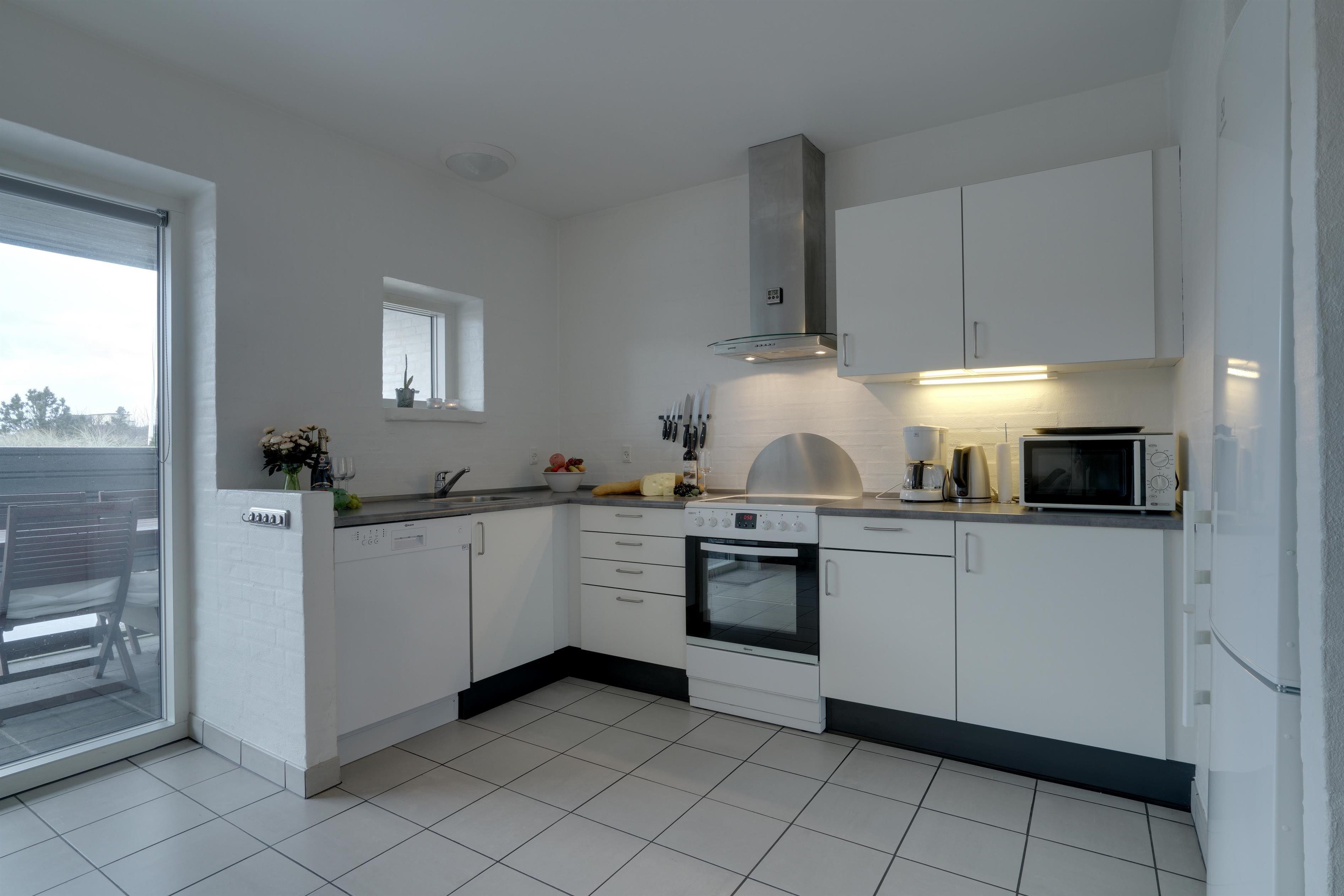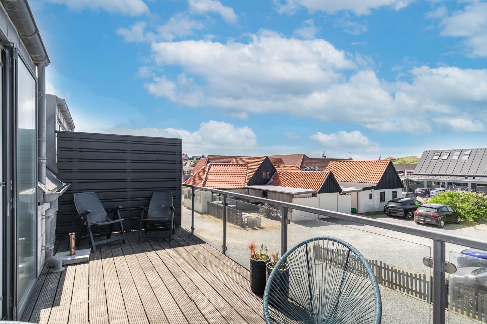Die mit hoher Qualität gebaute Wohnung befindet sich im Herzen von Henne Strand. Die Wohnung ist überall hell und freundlich und auf einem hohen Qualitätsniveau. Die Wohnung besteht aus 2 Ebenen. In der ersten Ebene ist der Eingang, Schlafzimmer, Wohnzimmer, Bad und eine geschützte Terrasse gegen Westen gerichtet. In der zweiten Ebene befinden sich 2 Schlafzimmer, Wohnzimmer und Balkon. In allen Zimmern sind Flachbildschirme vorhanden. Mit Warmepumpe. Abstellraum für Fahrräder beim Carport.